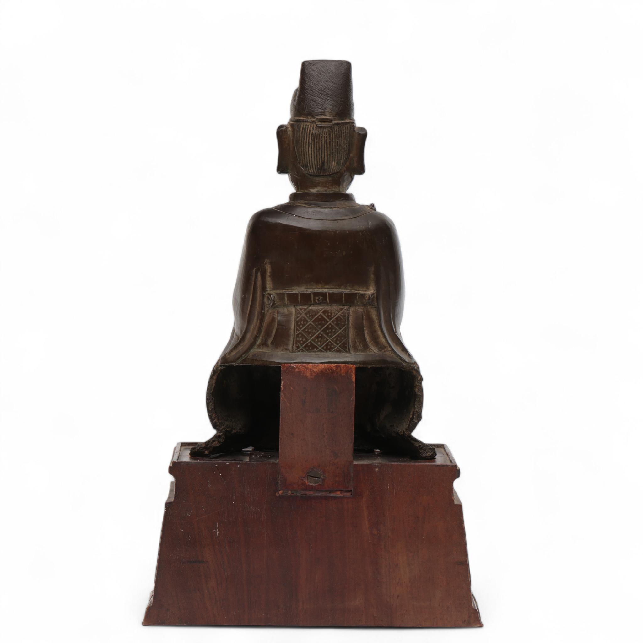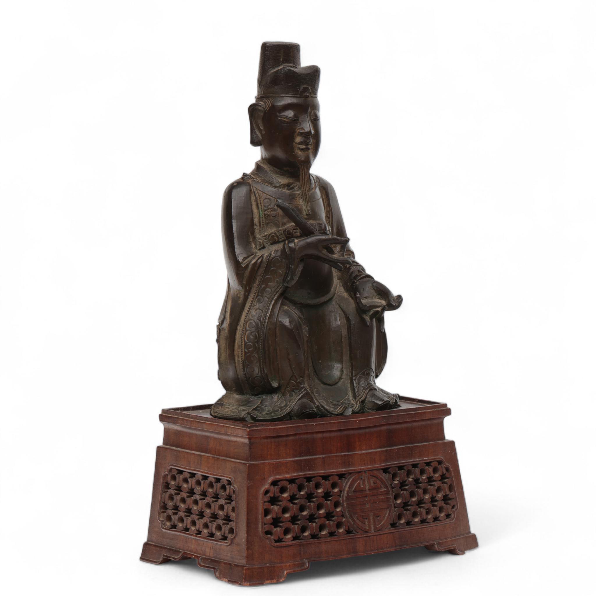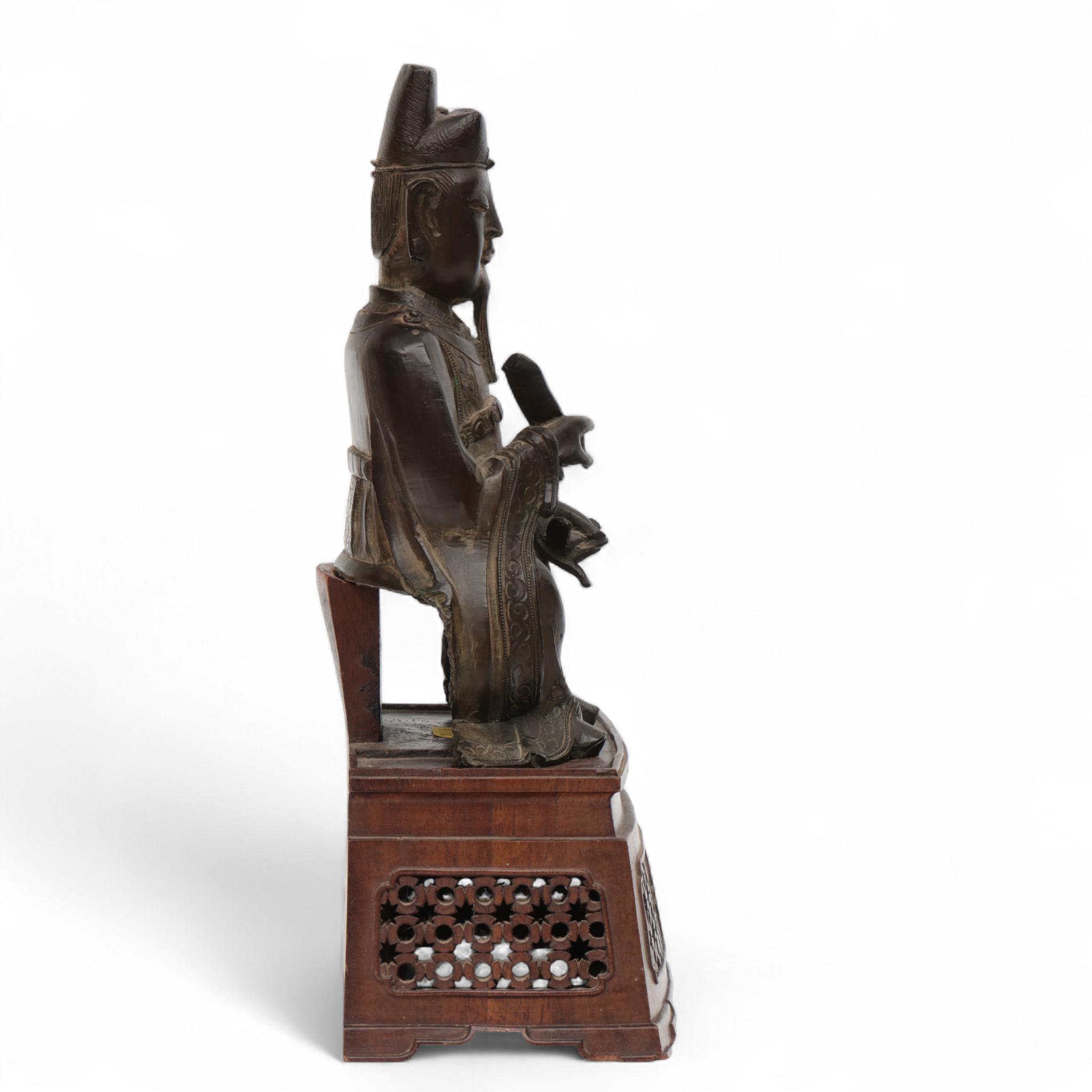 seated holding an ingot and an ancestor tablet, wearing decorated dress, on wood carved stand