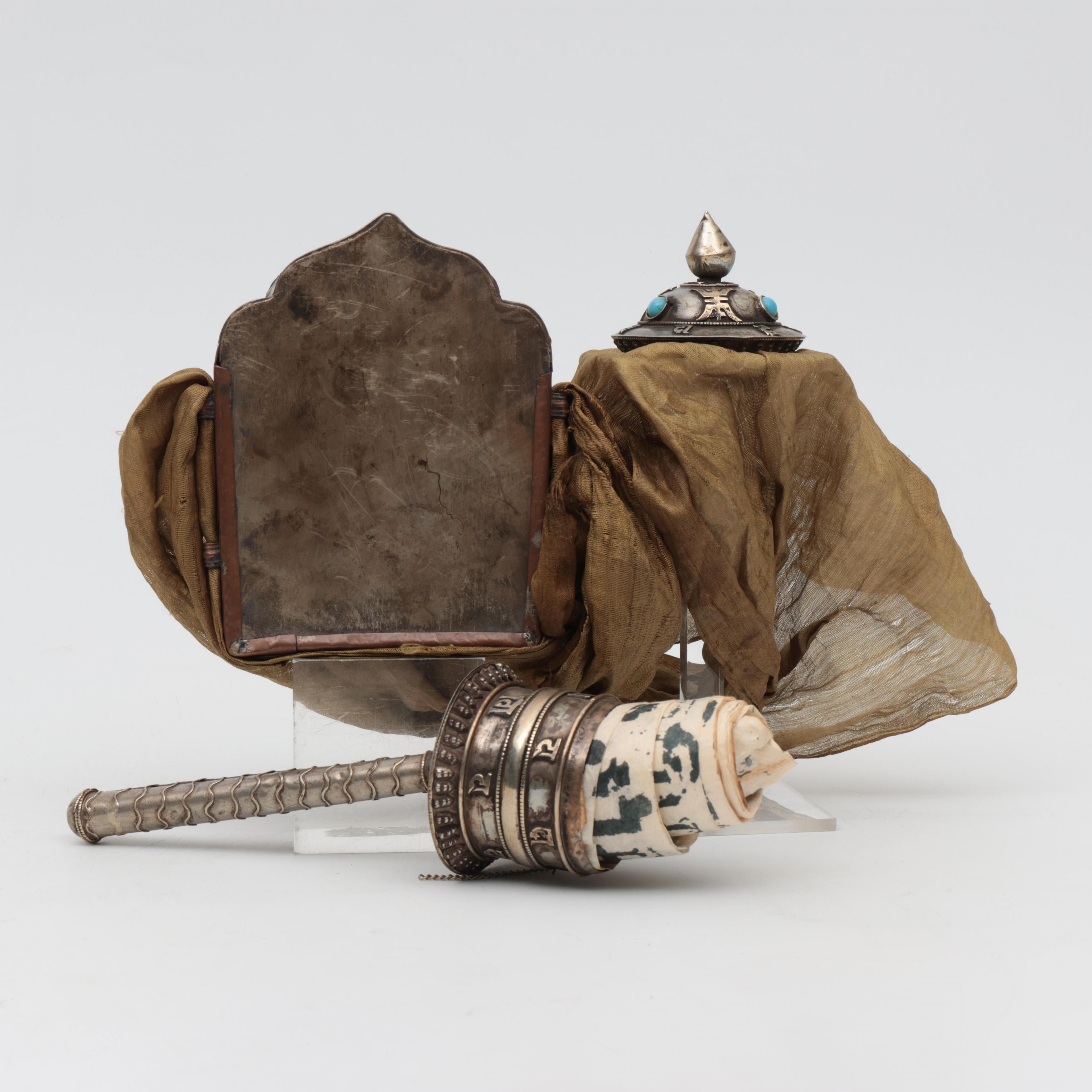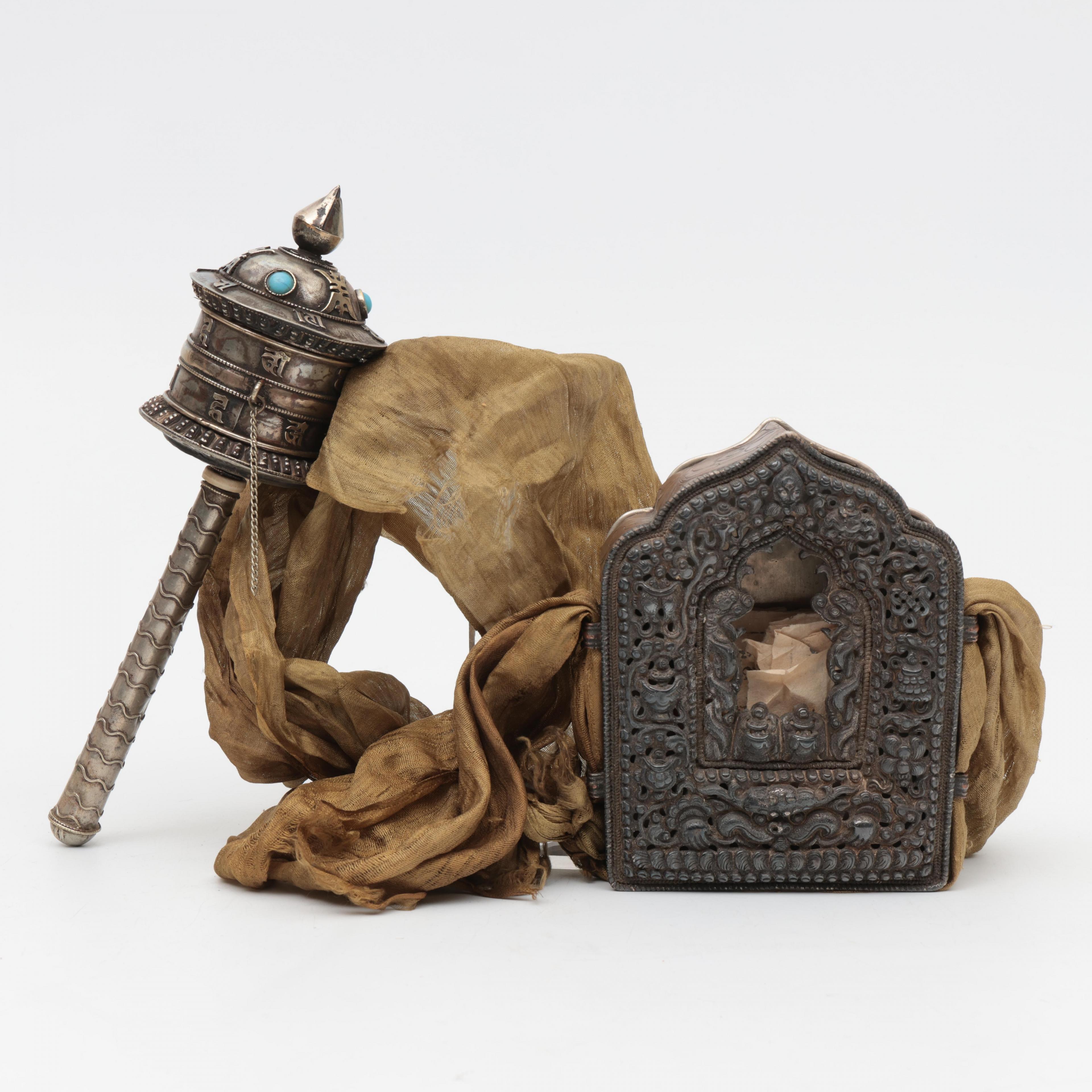 Tibet, a low-alloy silver gau and a prayer wheel, 19th/ 20th century,