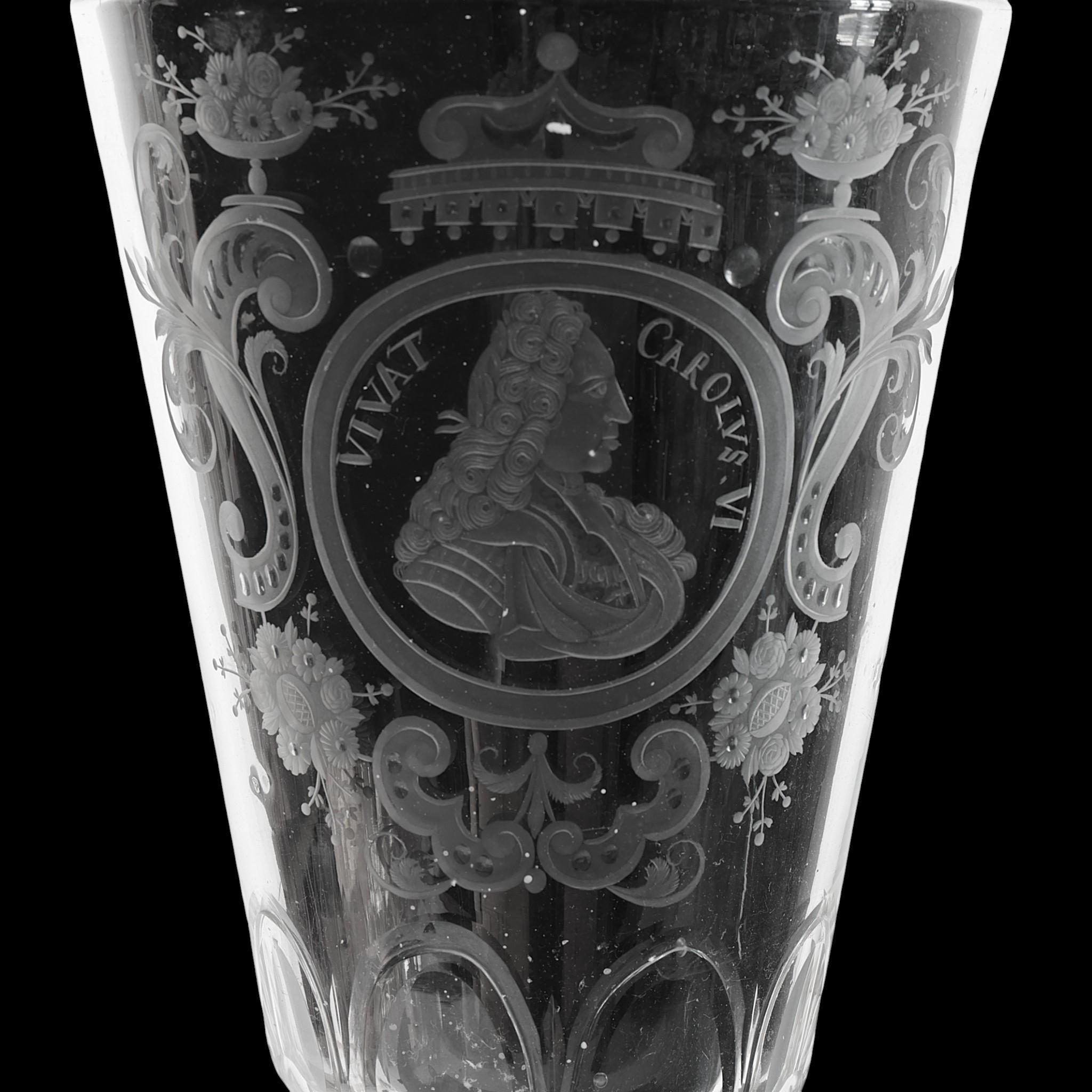 Glazen gegraveerde dekselbokaal, 'Vivat Carolus VI', 18e eeuw;