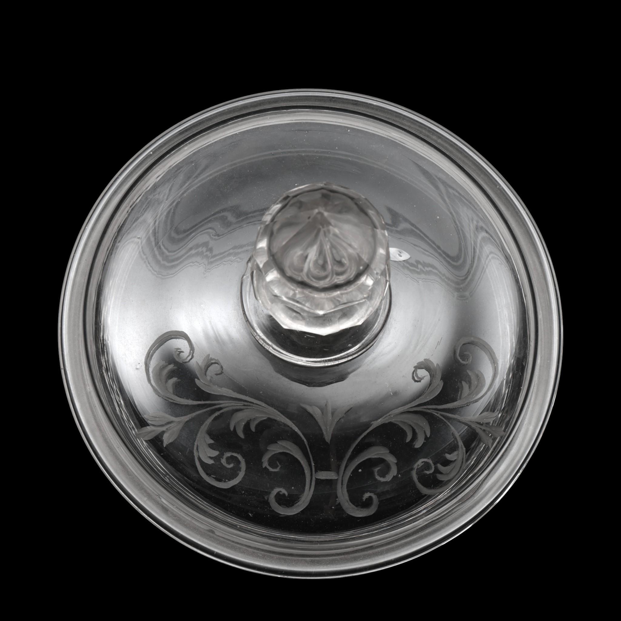 De kelk met gegraveerde en-profile voorstelling van Keizer Karel VI binnen omlijning, geflankeerd door voluten en bloemmanden waarboven baldakijn. Stam met geslepen knopen. Deksel met gravering van voluten en geslepen knop. (Kelk afschroefbaar, rand schroefdraad stam met twee chipjes).