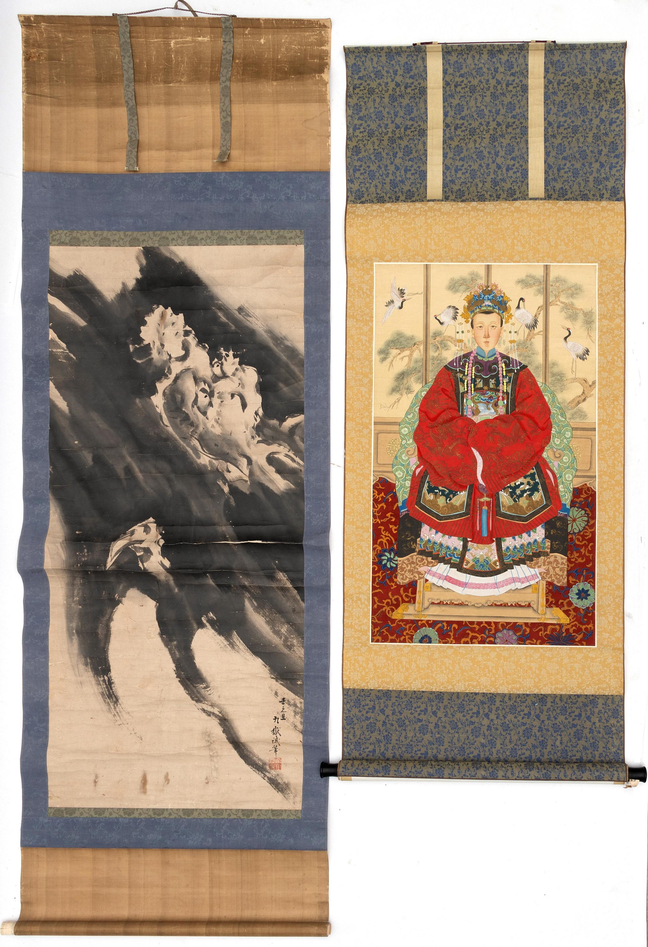 met landschap, gesigneerd met kalligrafie en zegel, samen met twee moderne voorouderportretten