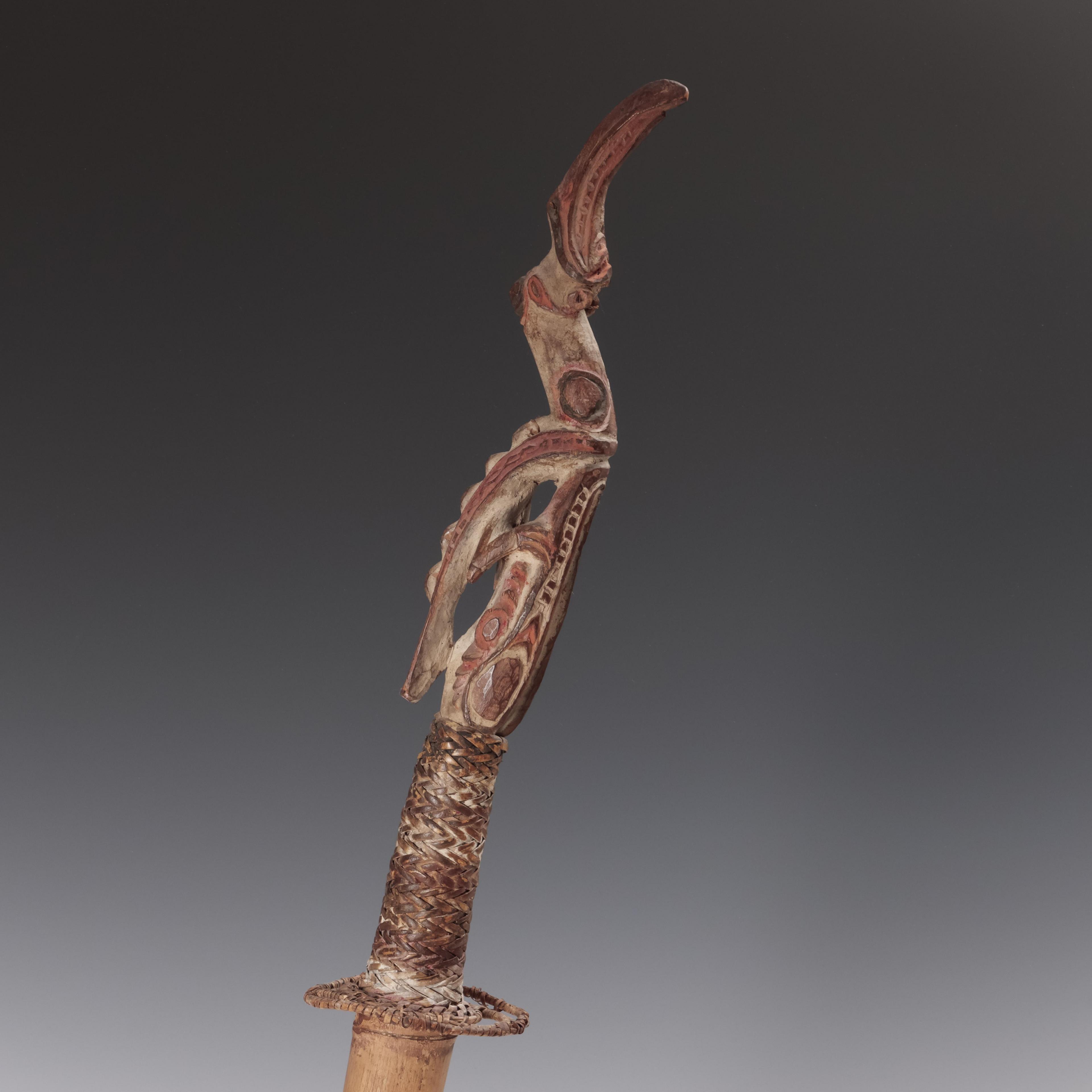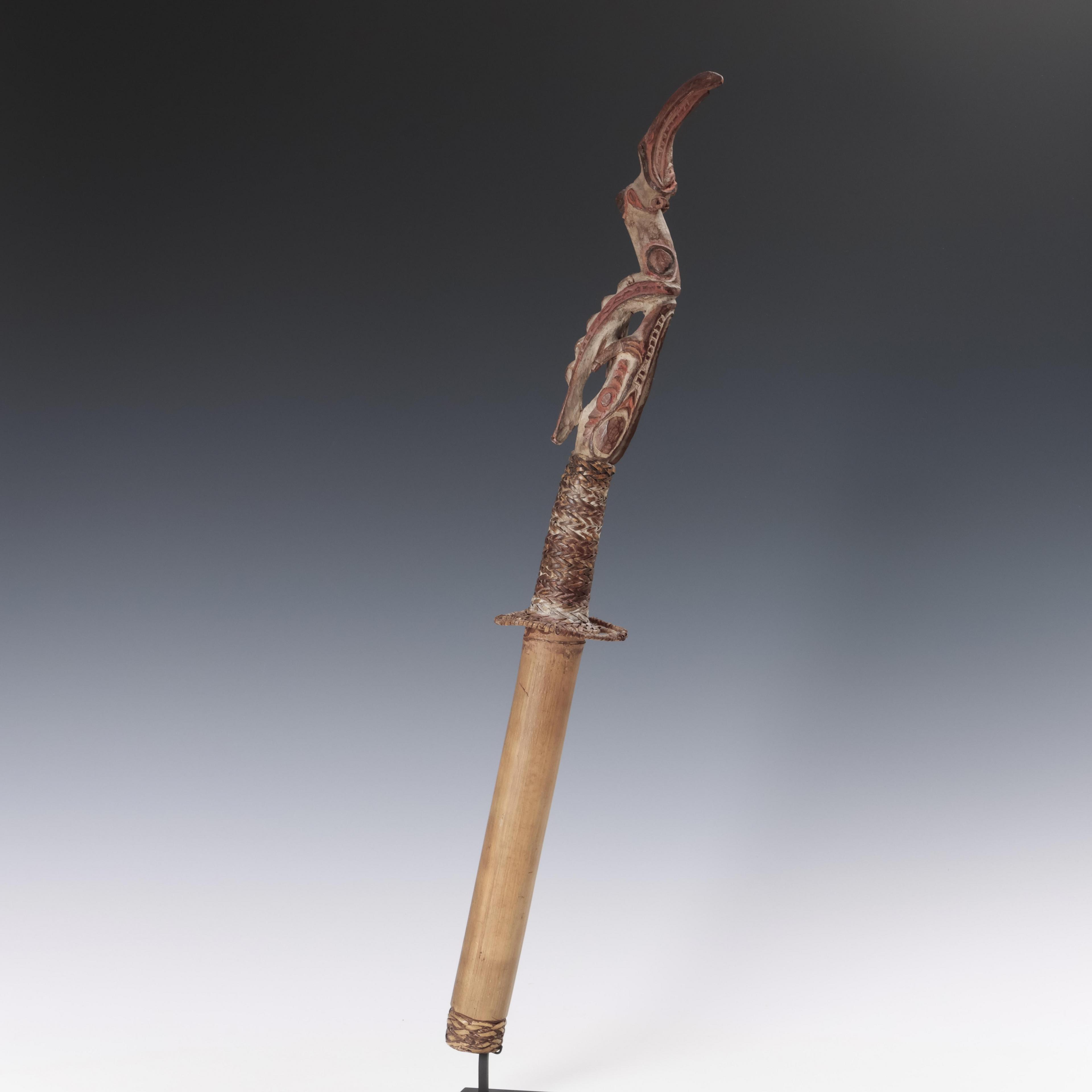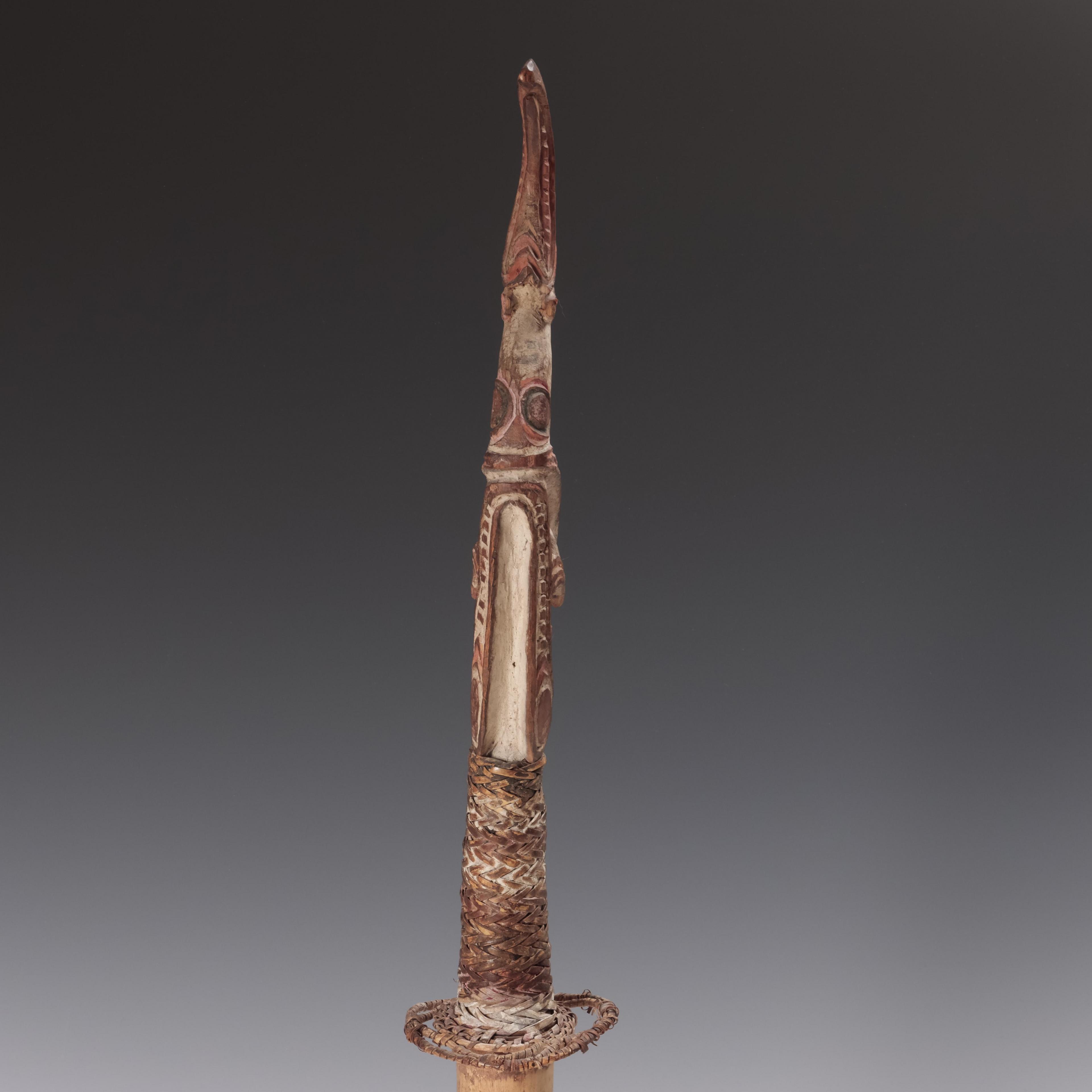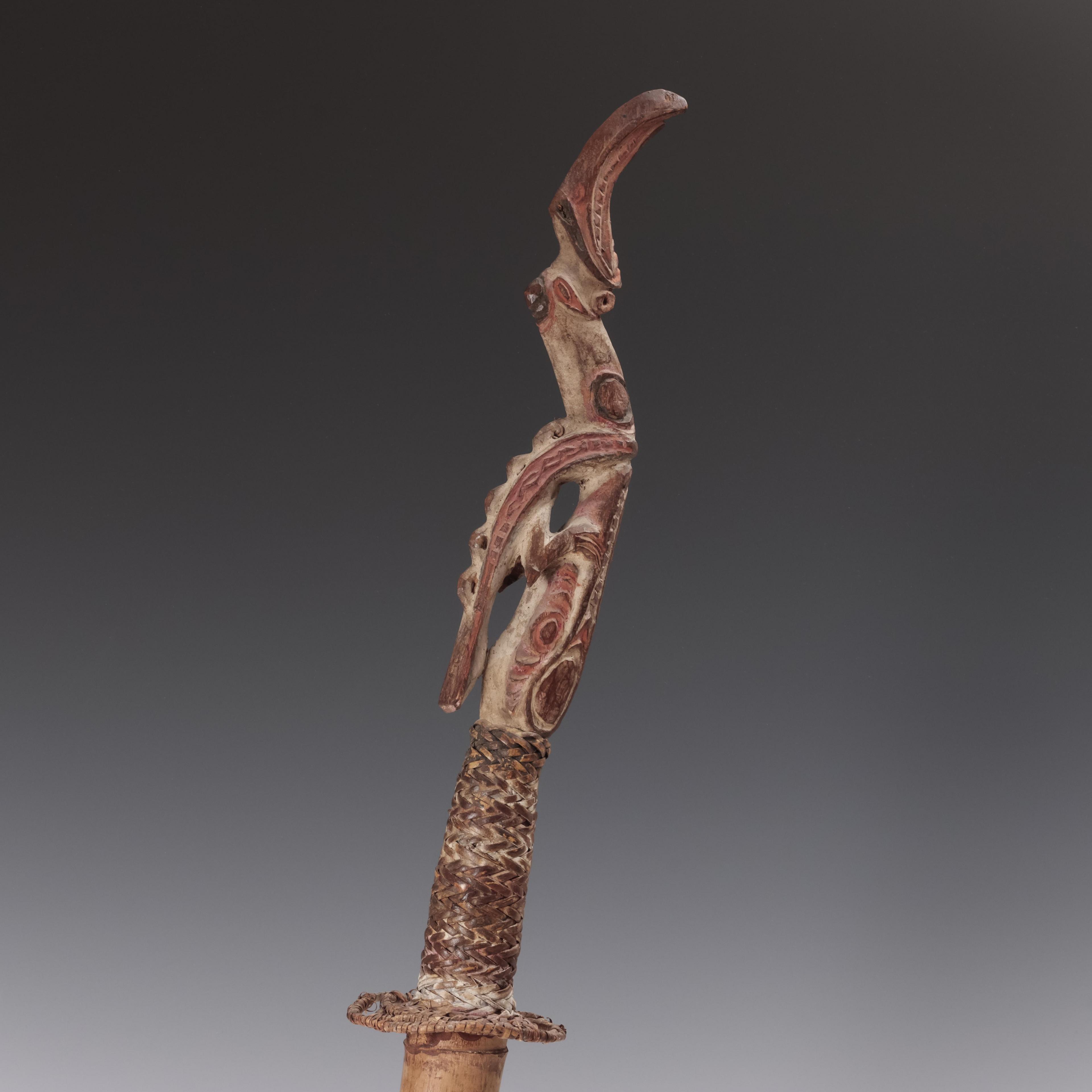 the lower end decorated with a delicate carving of two totemic animals. With red, grey and black pigments.