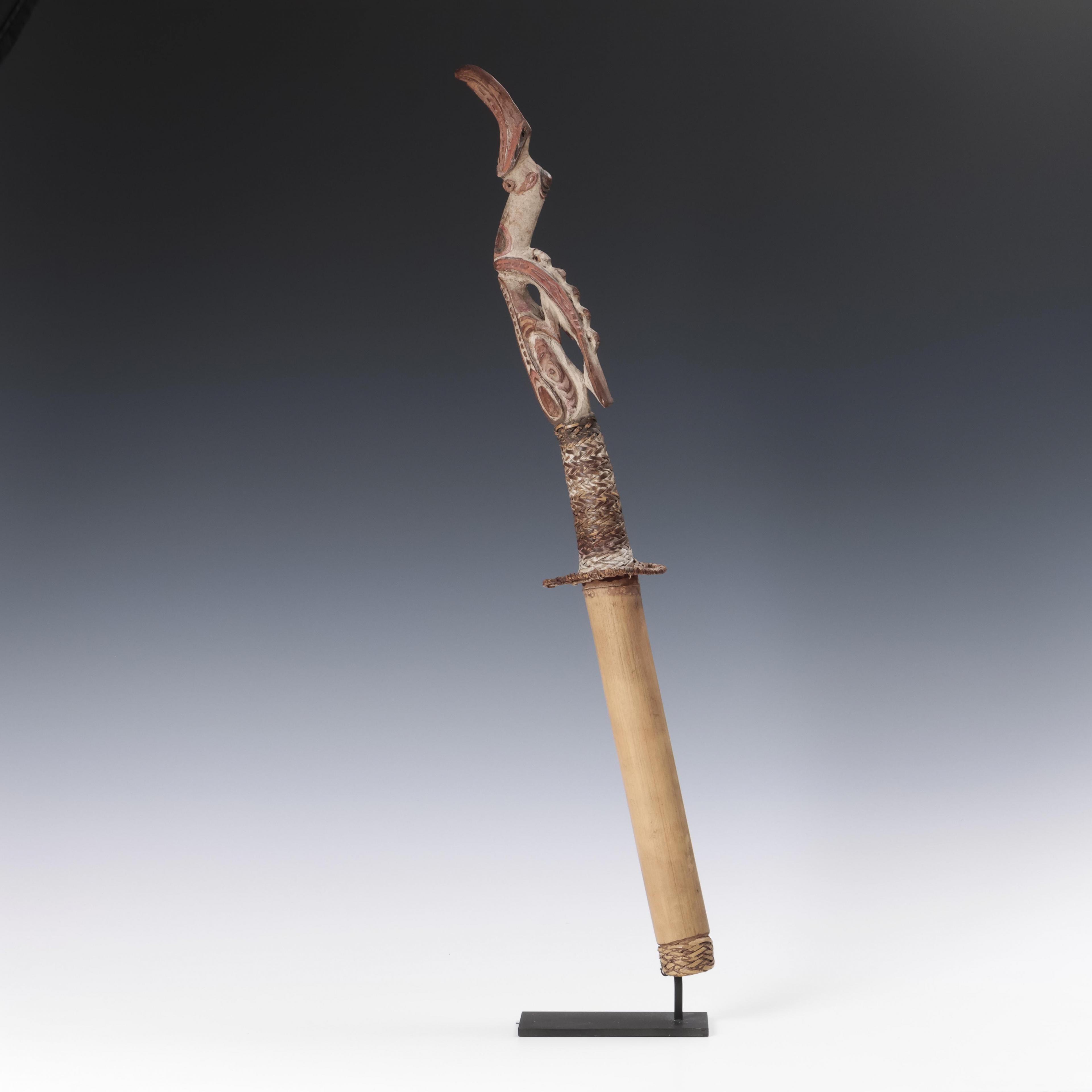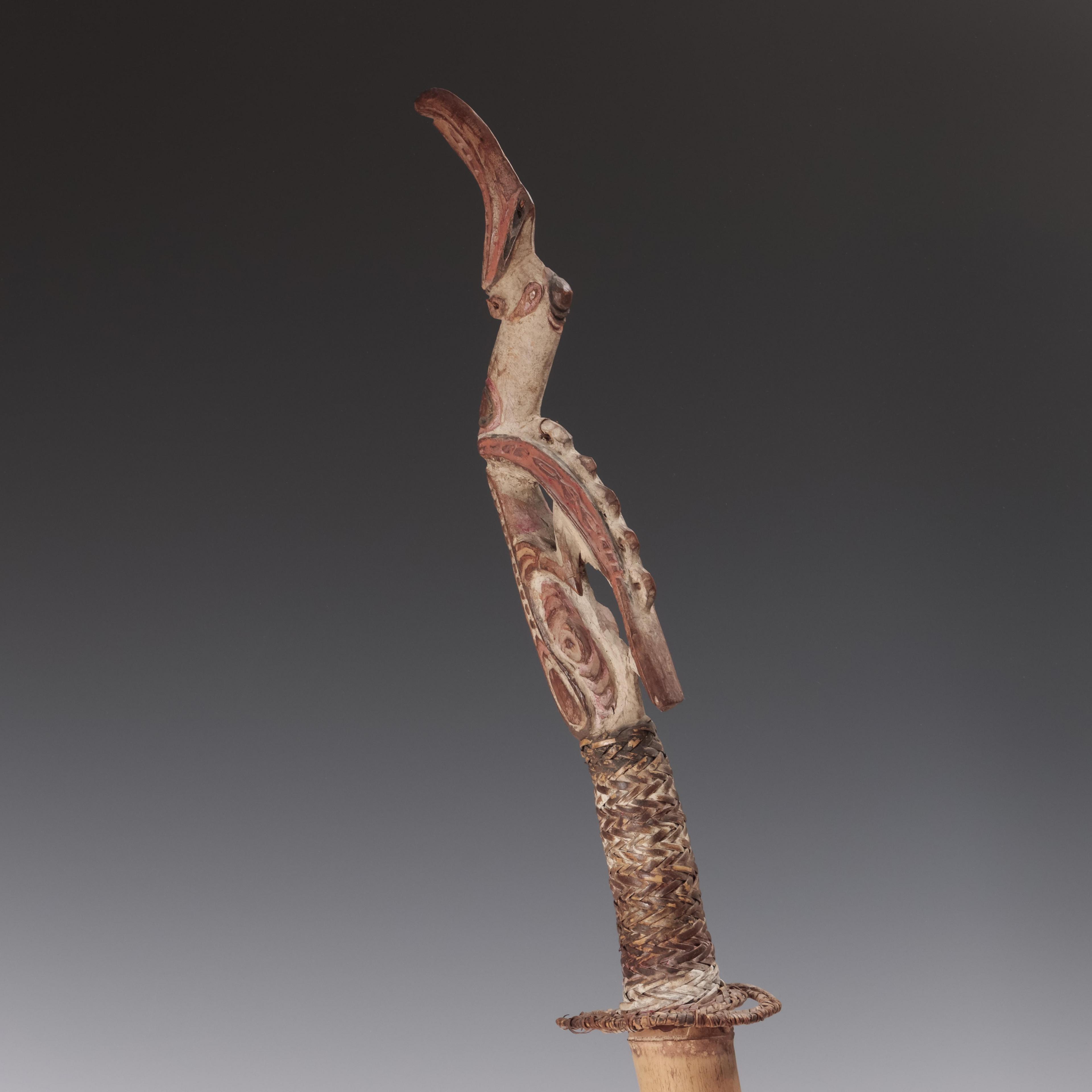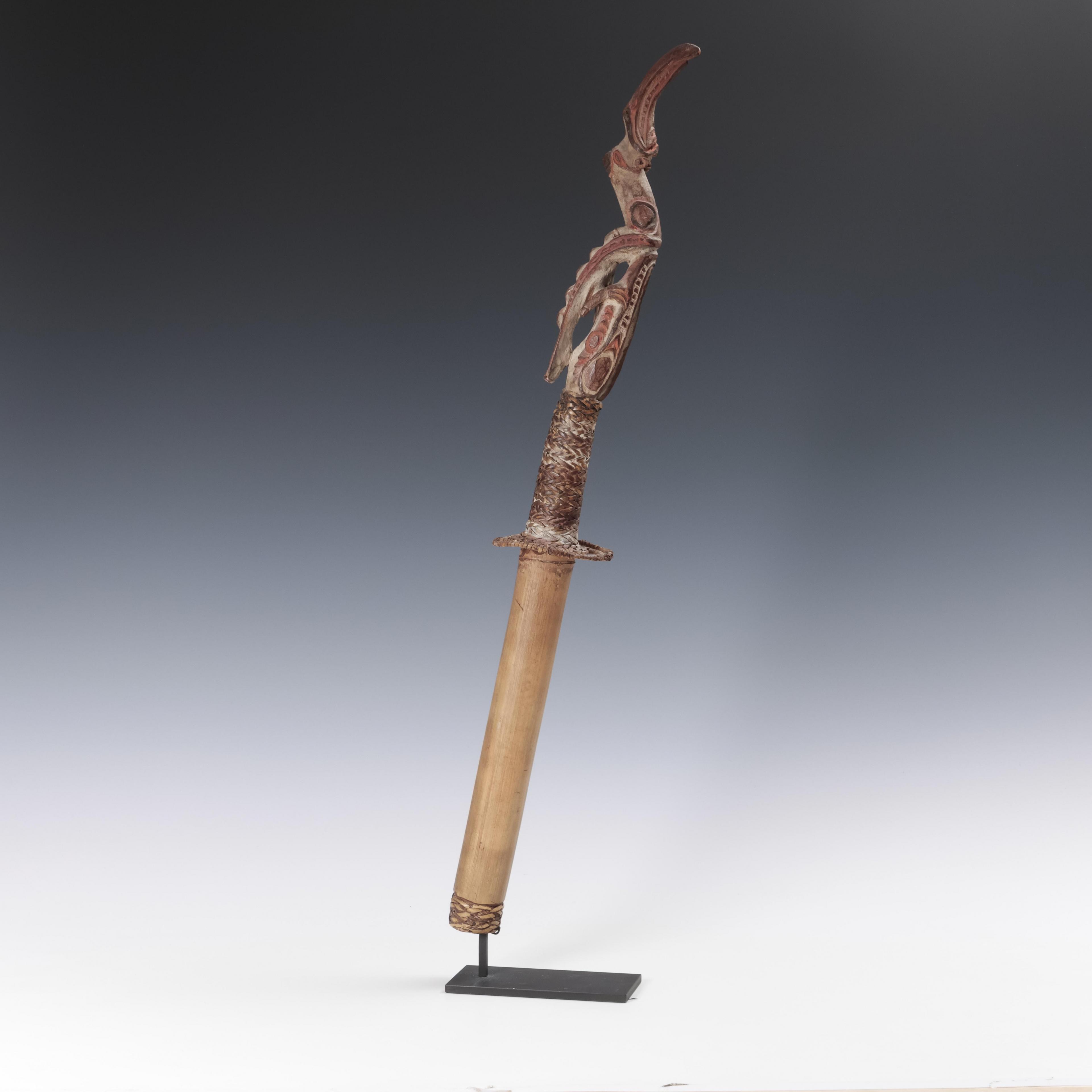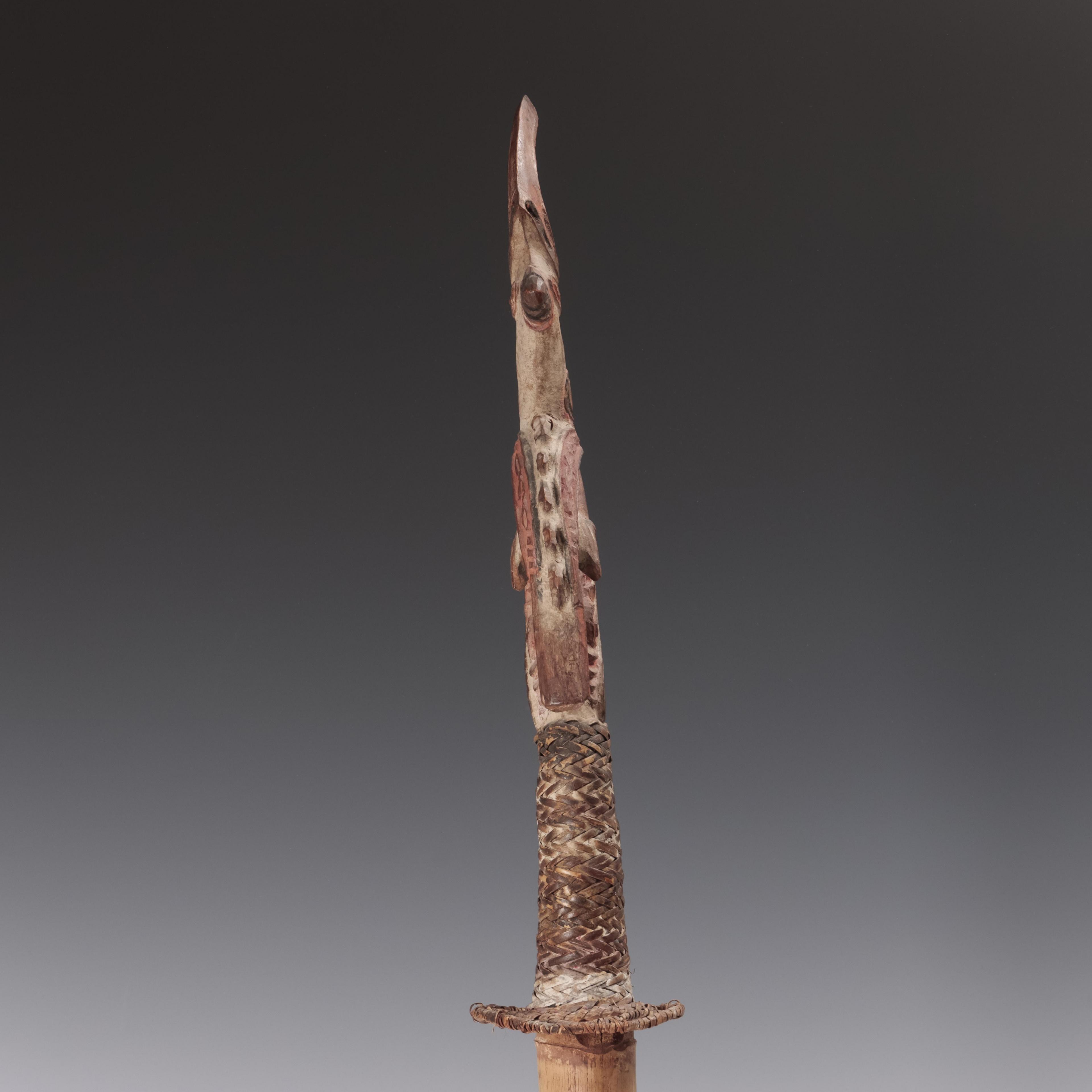 the lower end decorated with a delicate carving of two totemic animals. With red, grey and black pigments.
