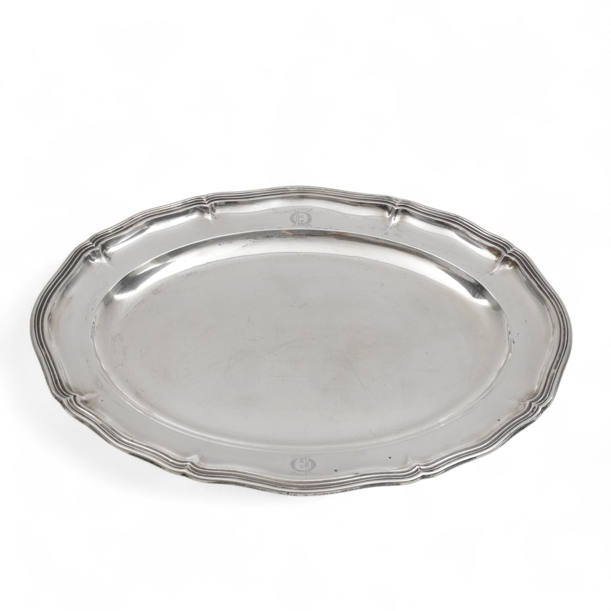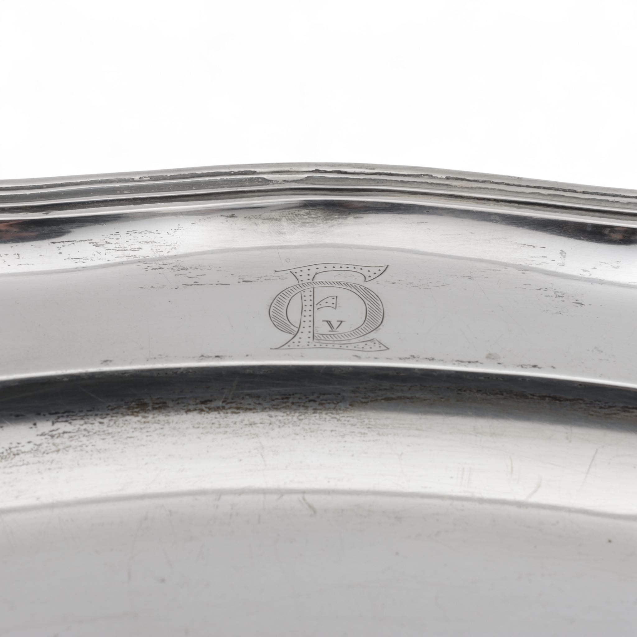 ovaal model met gecontourneerde rand met filetbandversiering, gemerkt Gebrüder Kühn Schwäbisch Gmund 1860- heden, 800/000 met lettermonogram gravure, 3e gehalte,