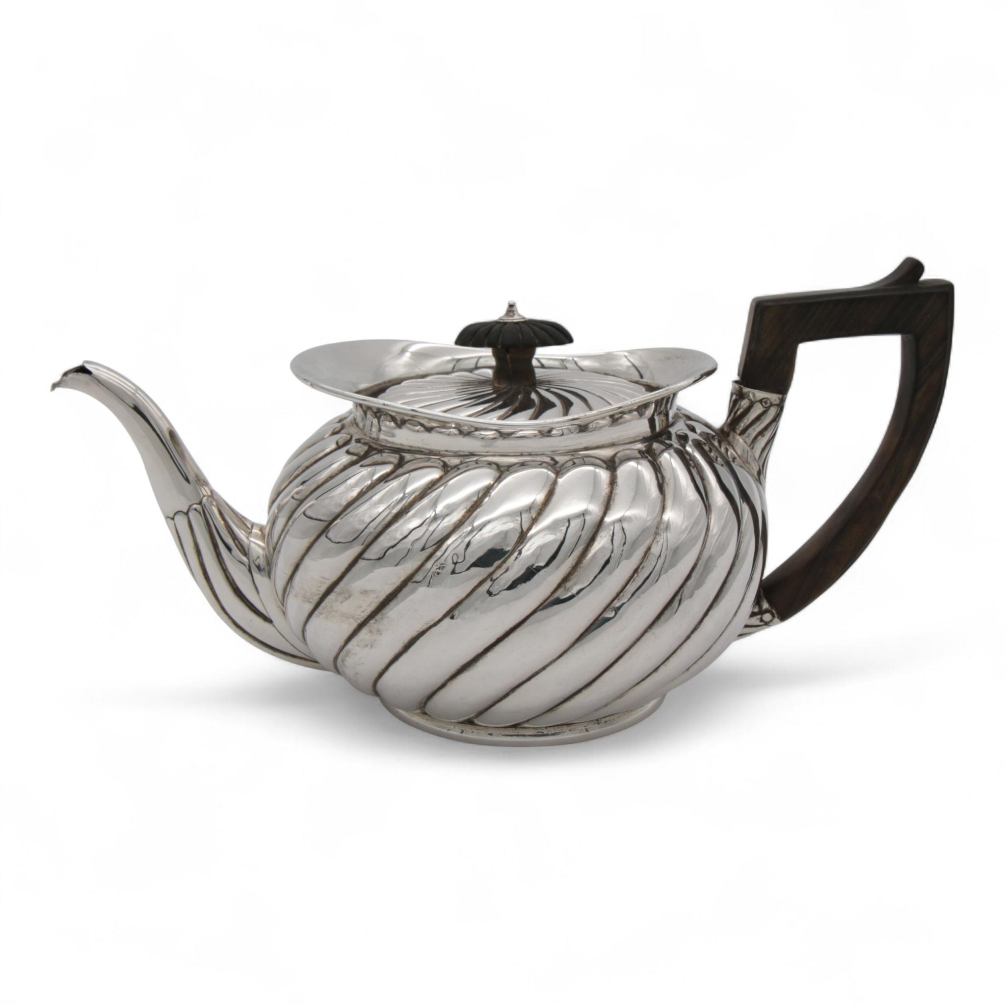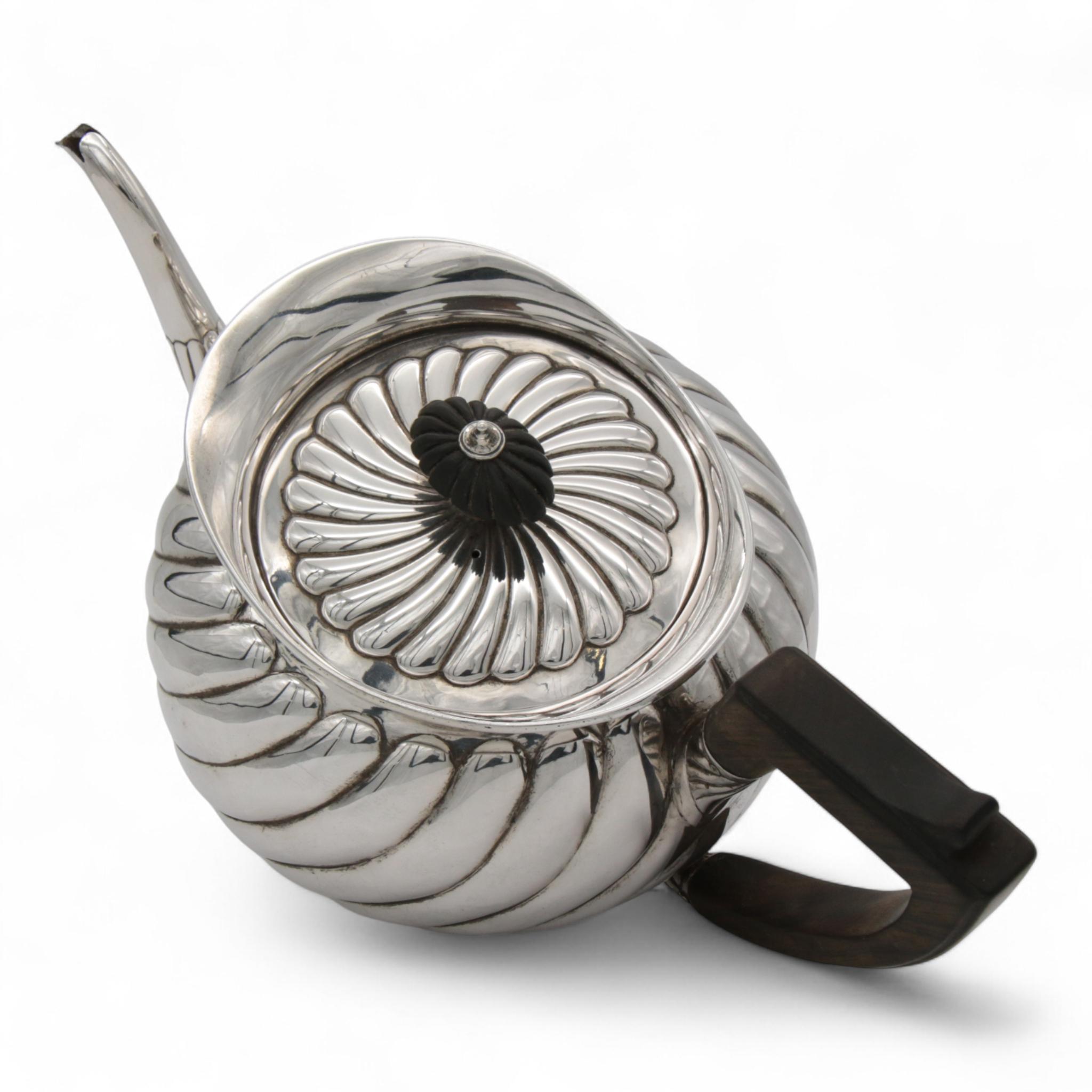 ovaal model met getorste gelobde versiering, palissanderhouten greep, ronde deksel met ovale hardhouten knop, mt. Rebecca Emes & Edward Barnard Londen 1812, 1e gehalte, (tuit heeft een klein barstje)