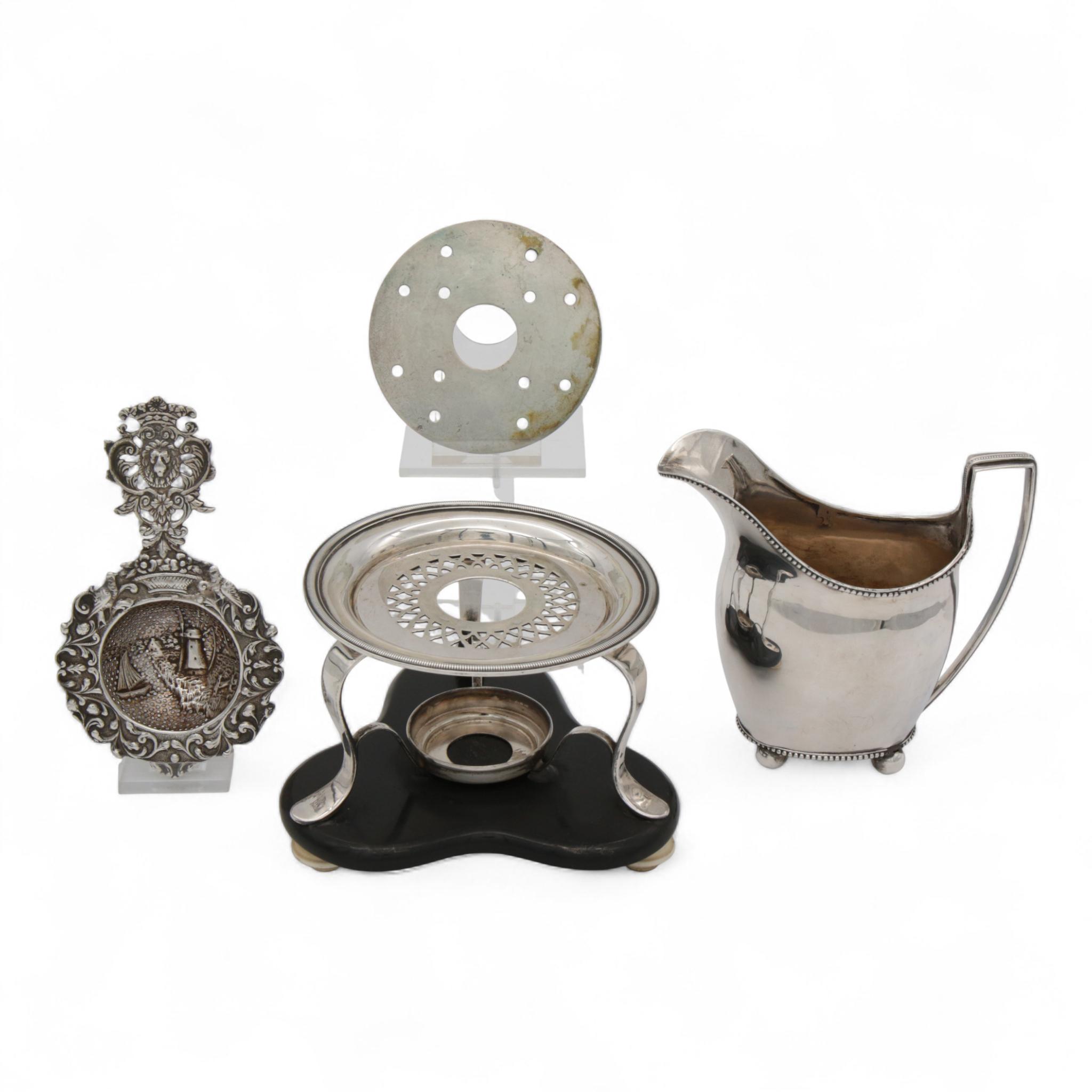réchaud mt. J.B. Schöne jr. Amsterdam 1826-1854 met ebbenehout basis en benen pootjes 1e gehalte, melkkan mt. J. Carrenhof 1812-1818 Amsterdam, winkeliersteken Diemont, 2e gehalte. Hierbij rond rechaud onderdeel,