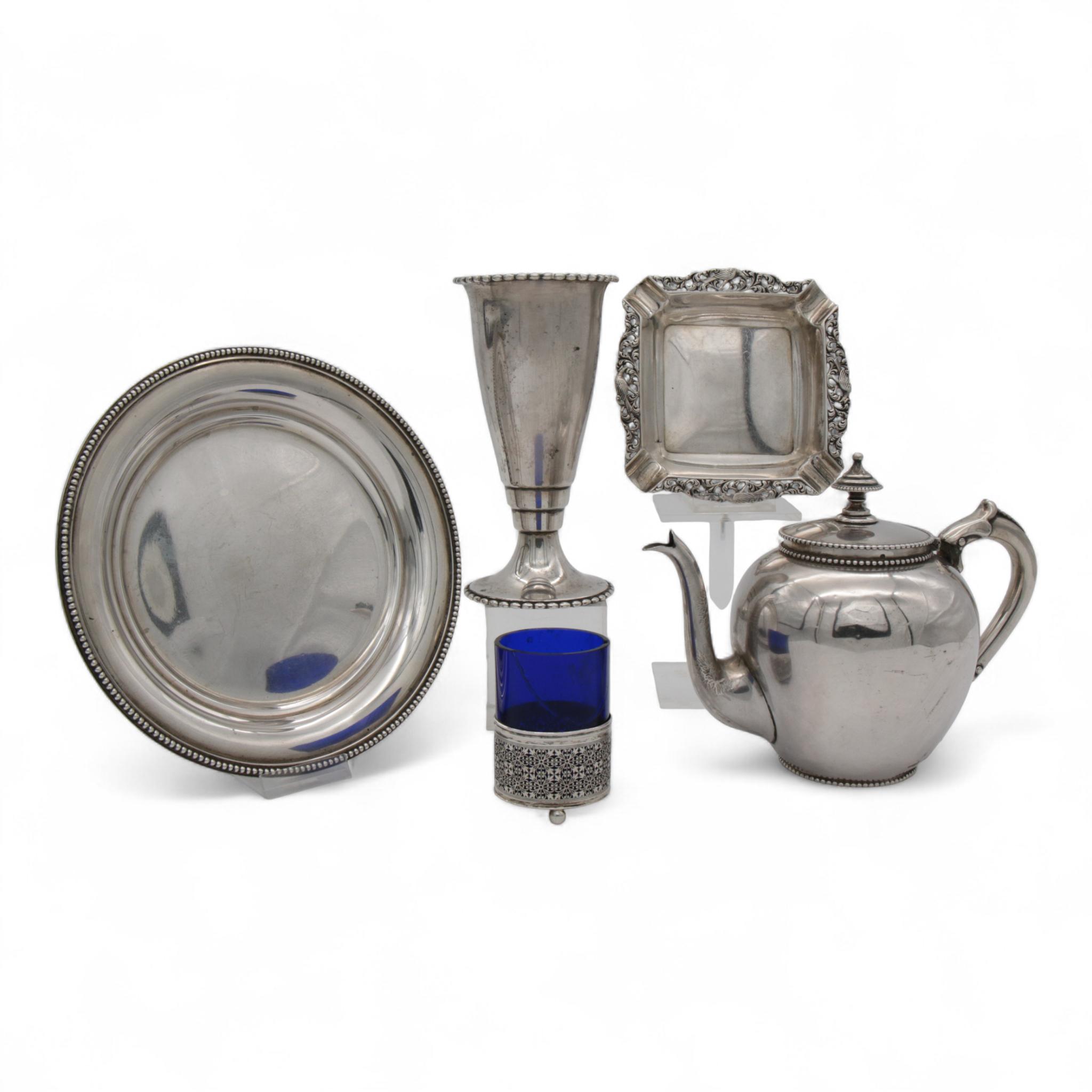 vaas mt. C.J. Massop Amsterdam 1931, 2e gehalte, schaal mt. Fa. J.M. van Kempen Voorschoten 1877 met annotatie aan onderzijde en een theepotje, 1863, 2e gehalte, asbak mt. Zaanlandse Zilversmederij Haarlem en glas(defect)met montering, mt. H.H, 1927, beide 2e gehalte, en theepotje,