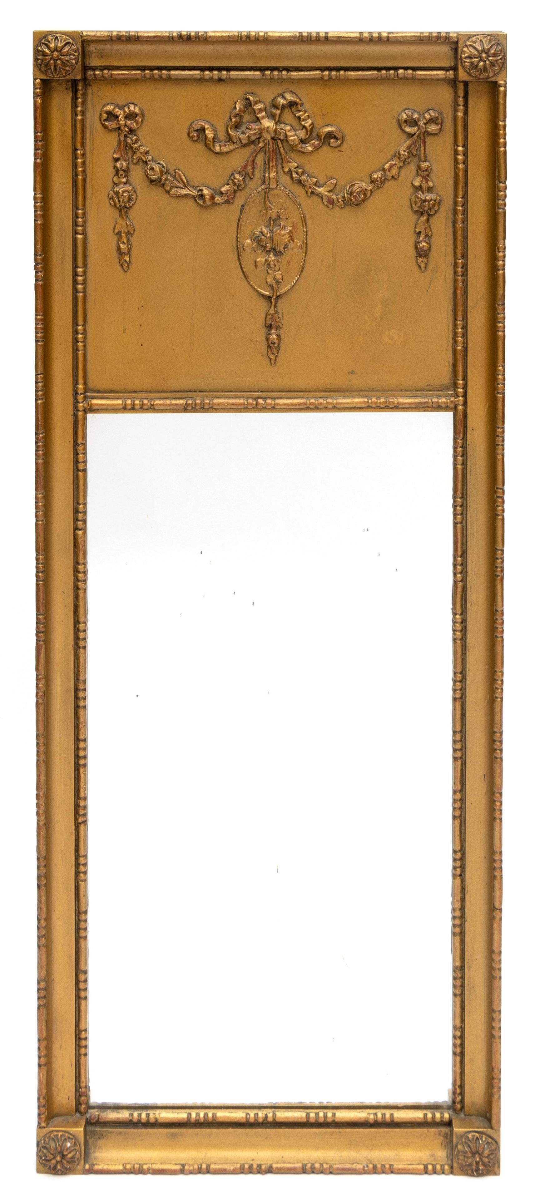 met boven de spiegel een paneel met medallion, strikwerk, guirlande en rozetten