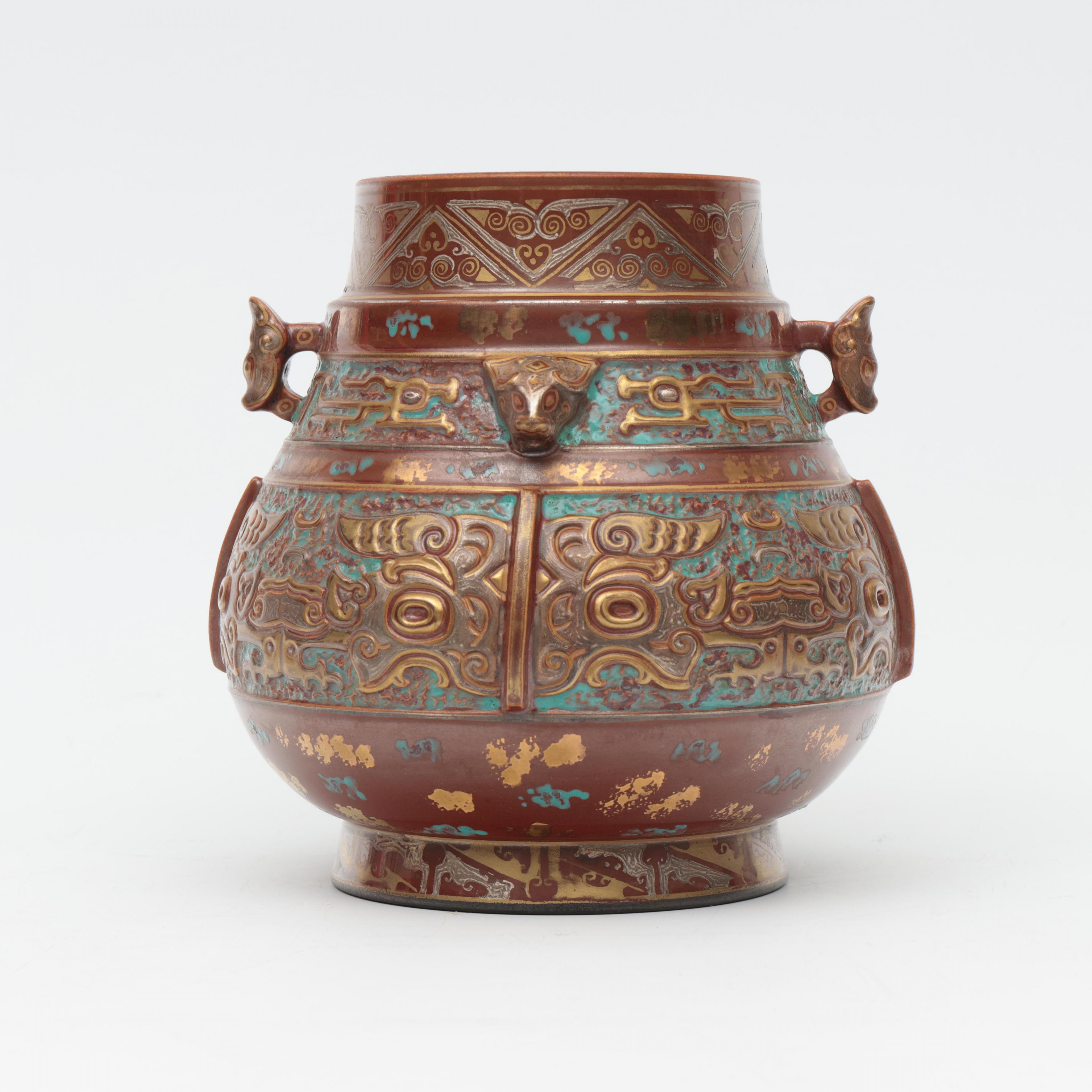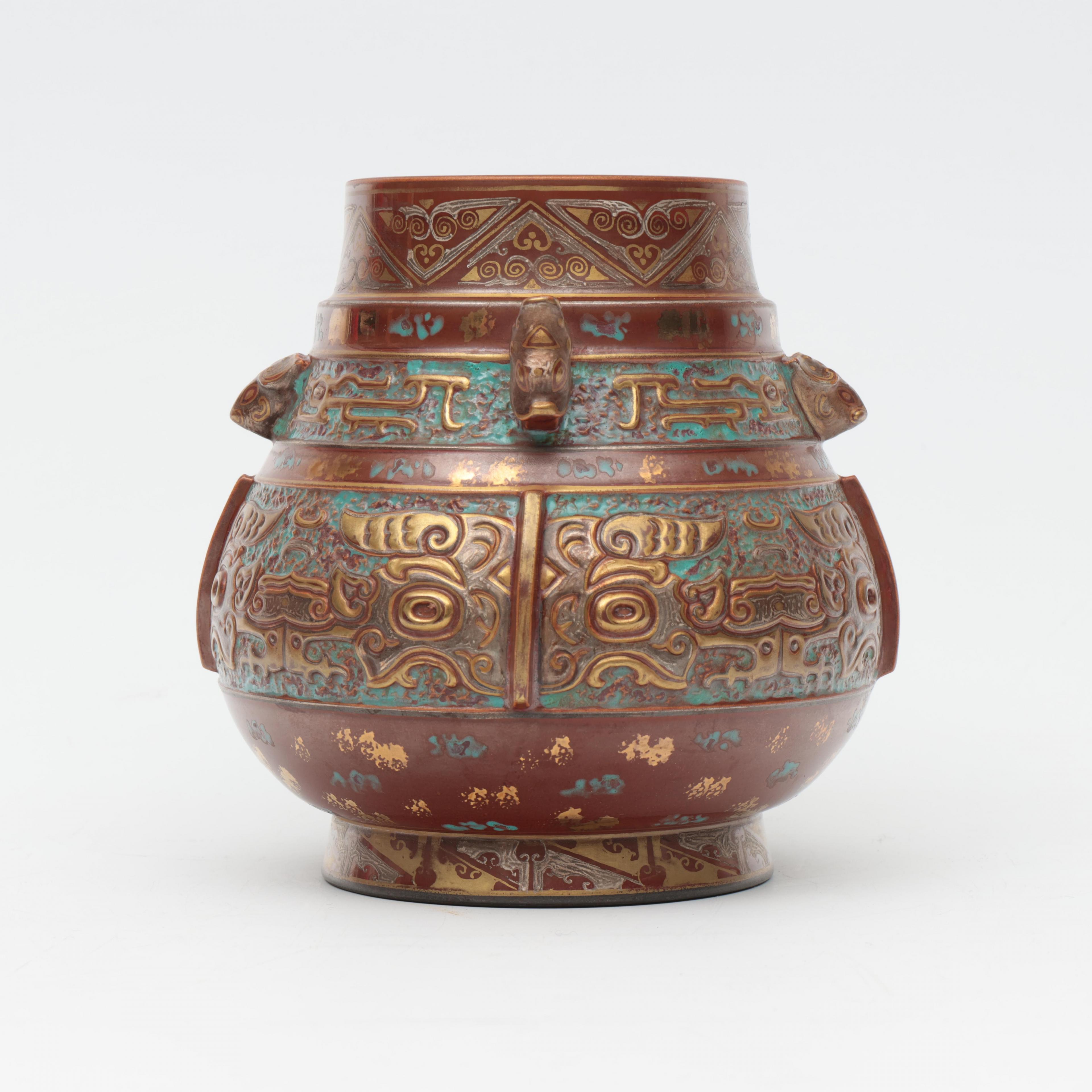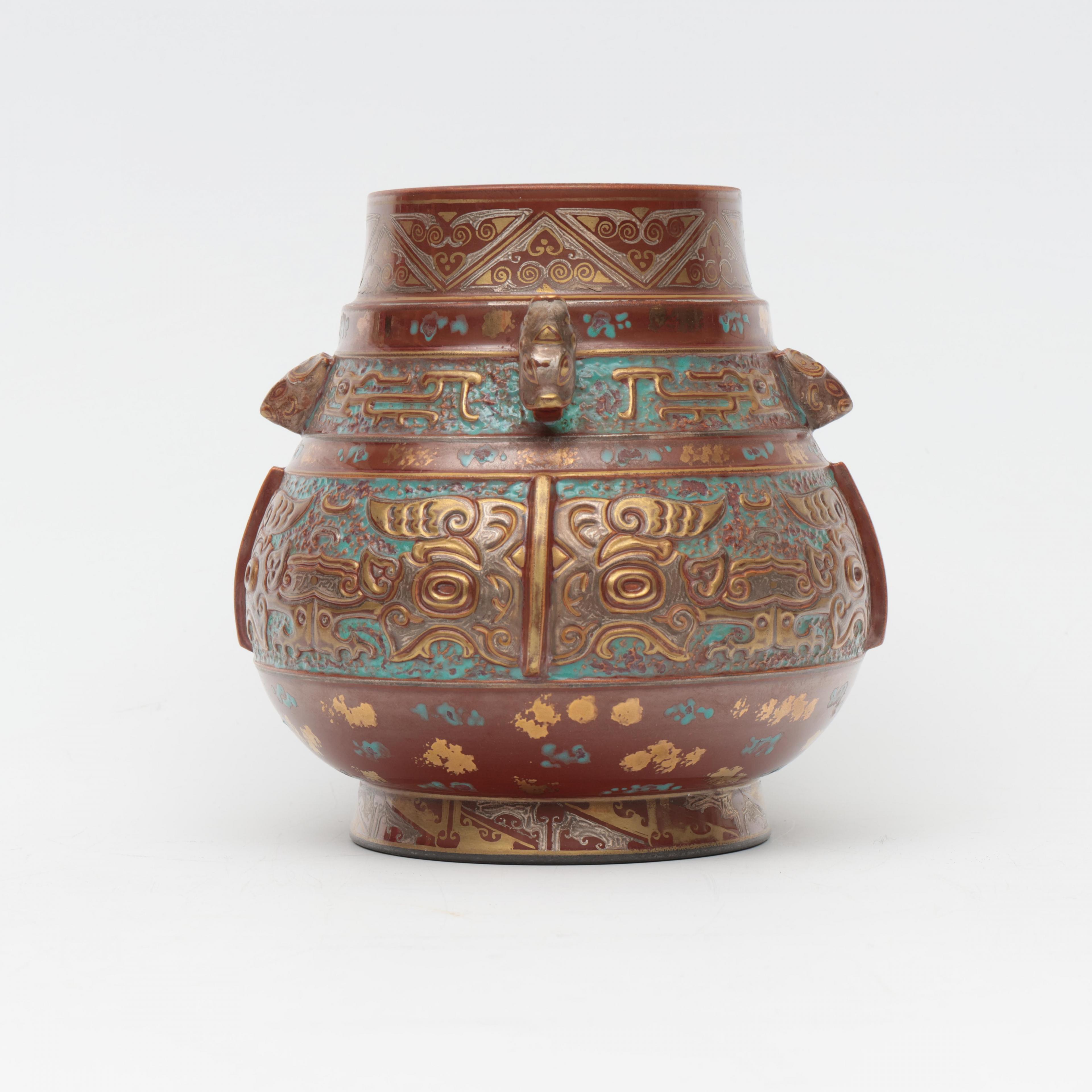 after an archaic example modelled with taotie masks, stylised dragons and animal heads, covered with a brown glaze with highlights in gilt and turquoise cleverly imitating bronze, the base with an apocryphal Qianlong mark