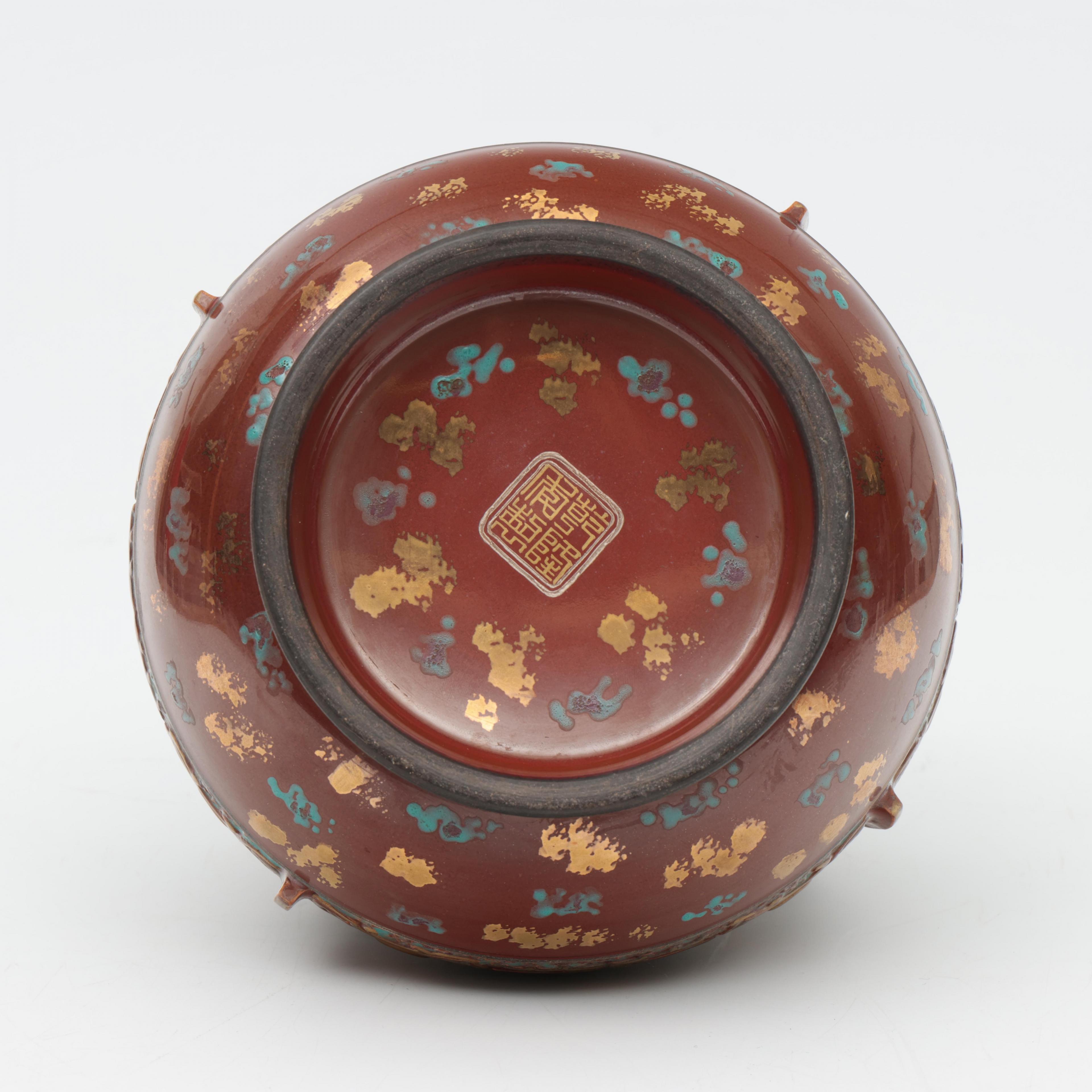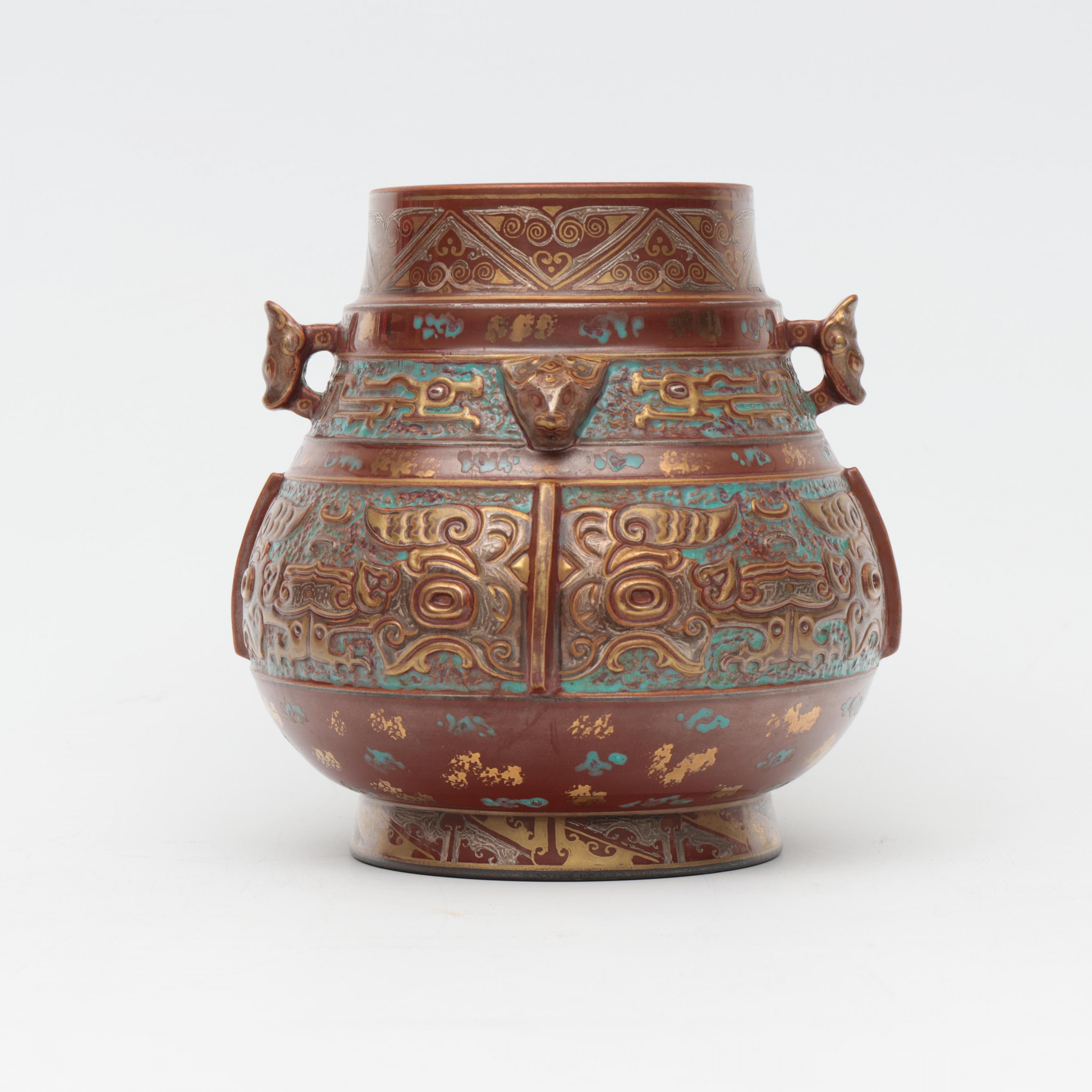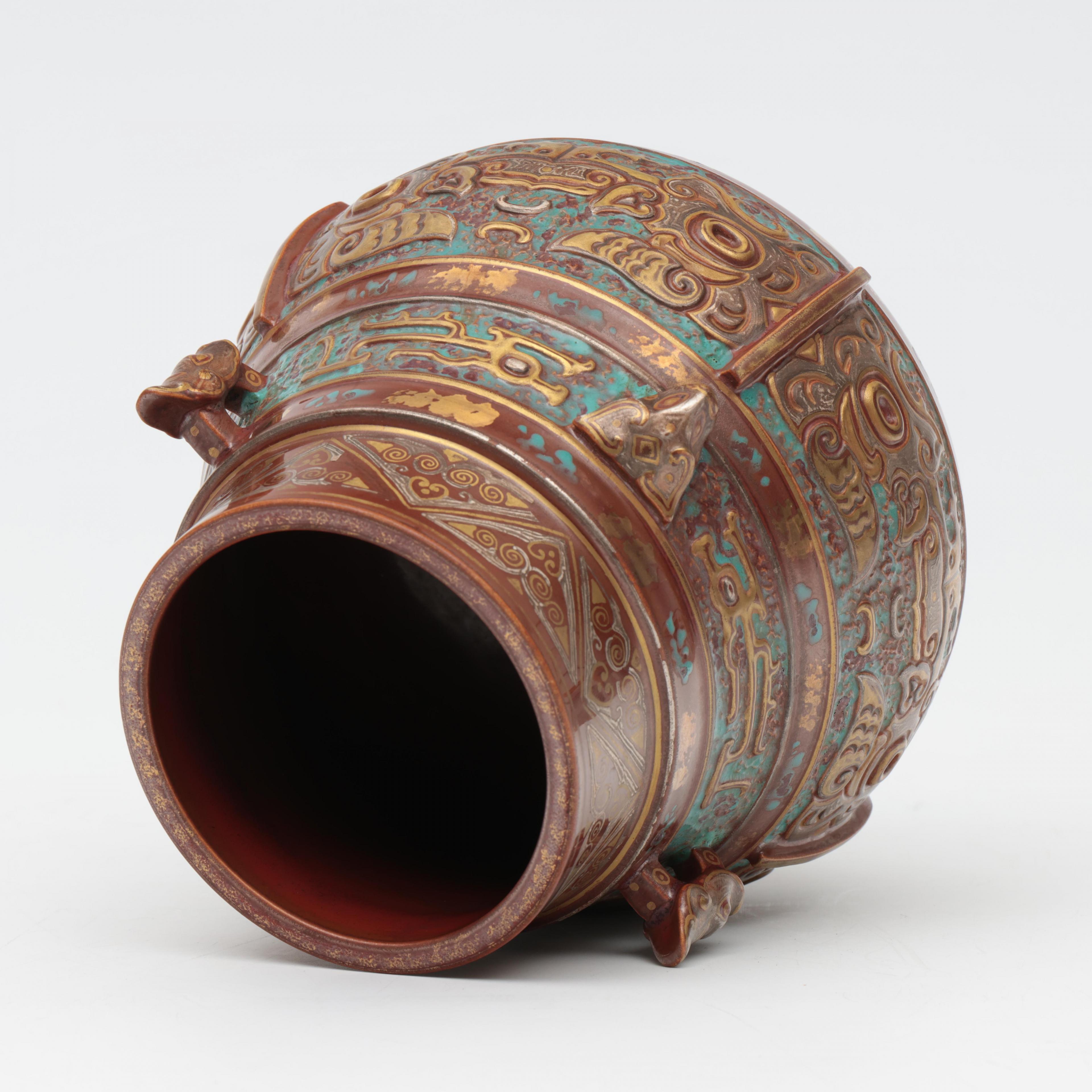 after an archaic example modelled with taotie masks, stylised dragons and animal heads, covered with a brown glaze with highlights in gilt and turquoise cleverly imitating bronze, the base with an apocryphal Qianlong mark