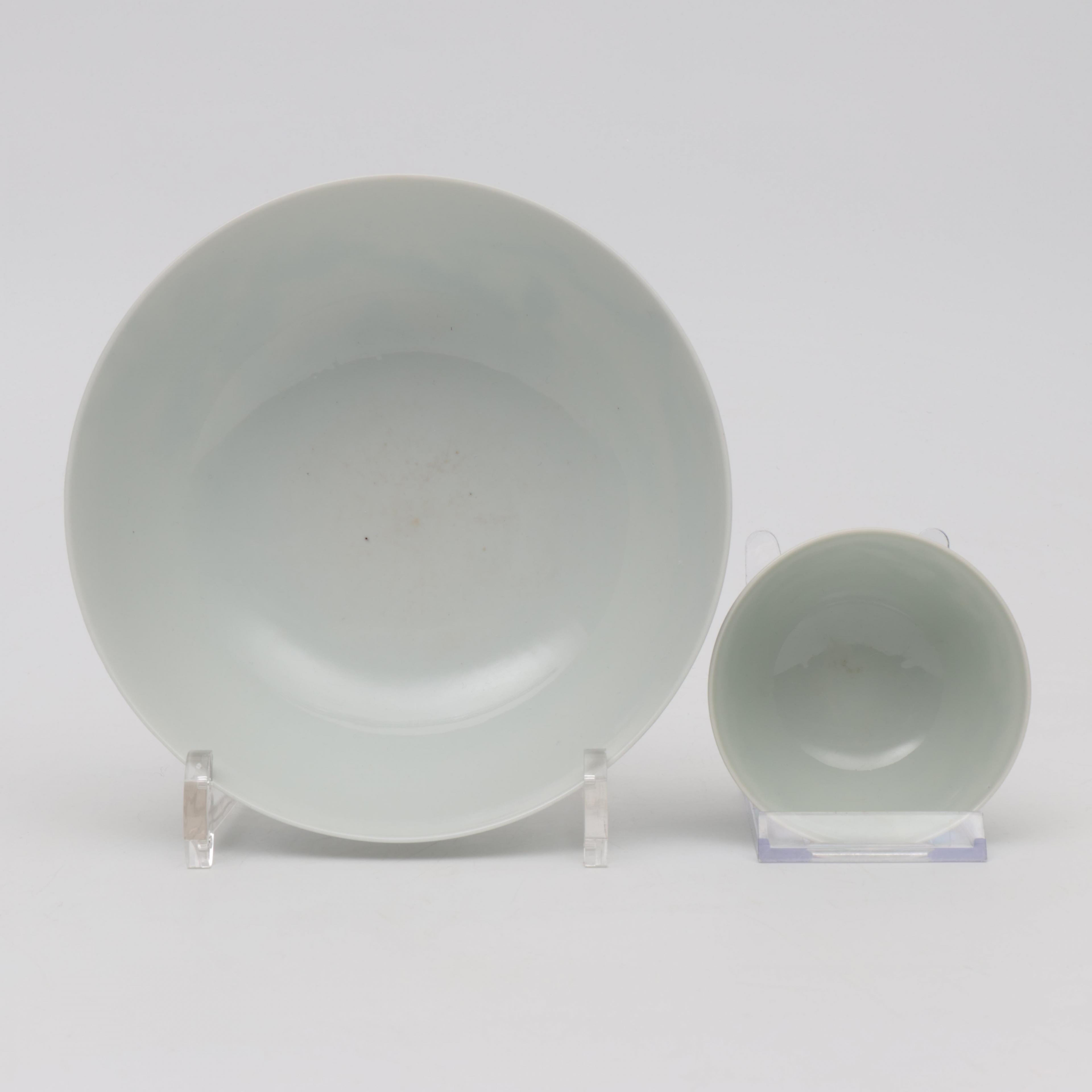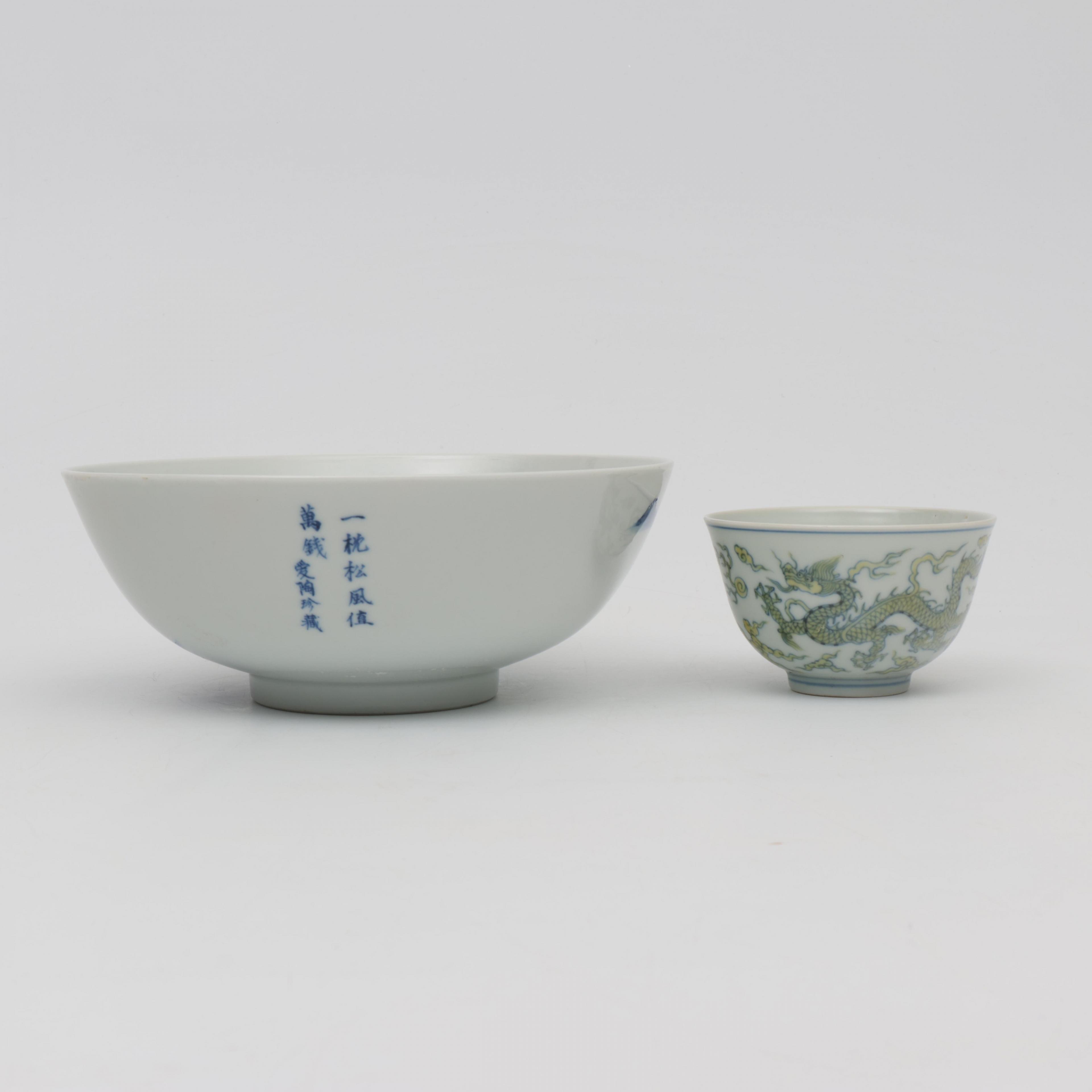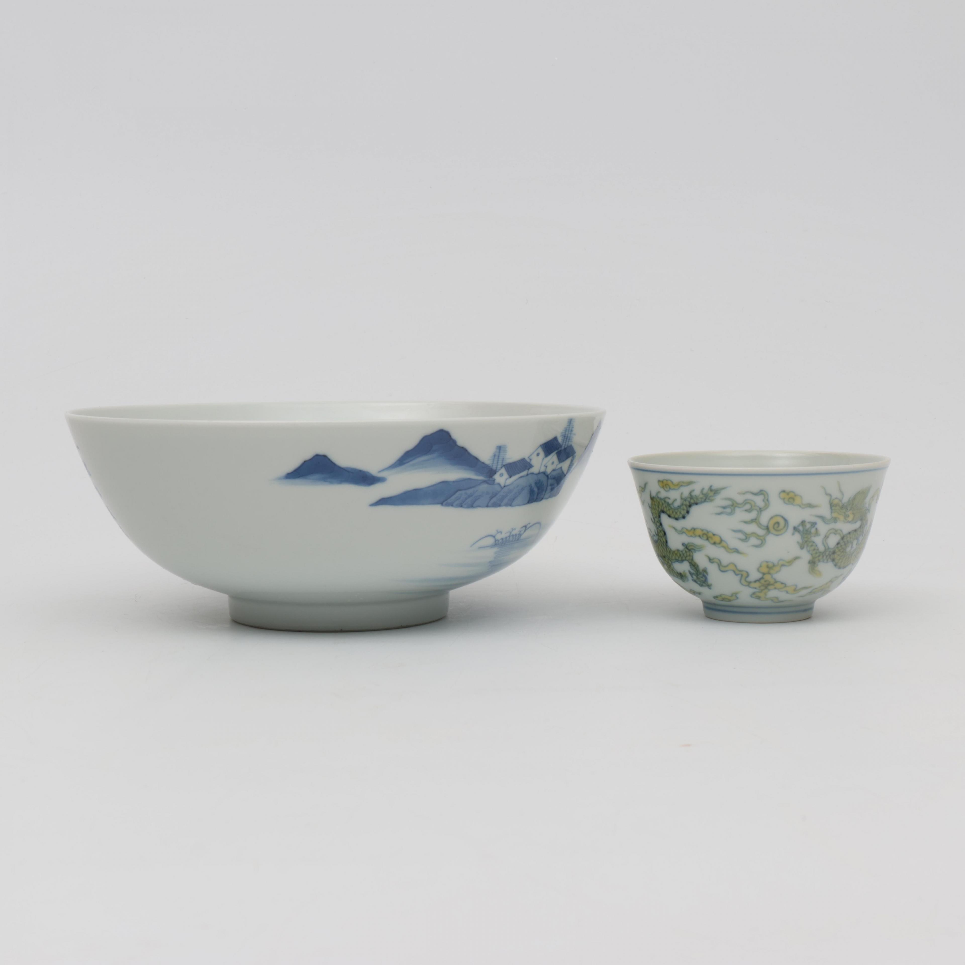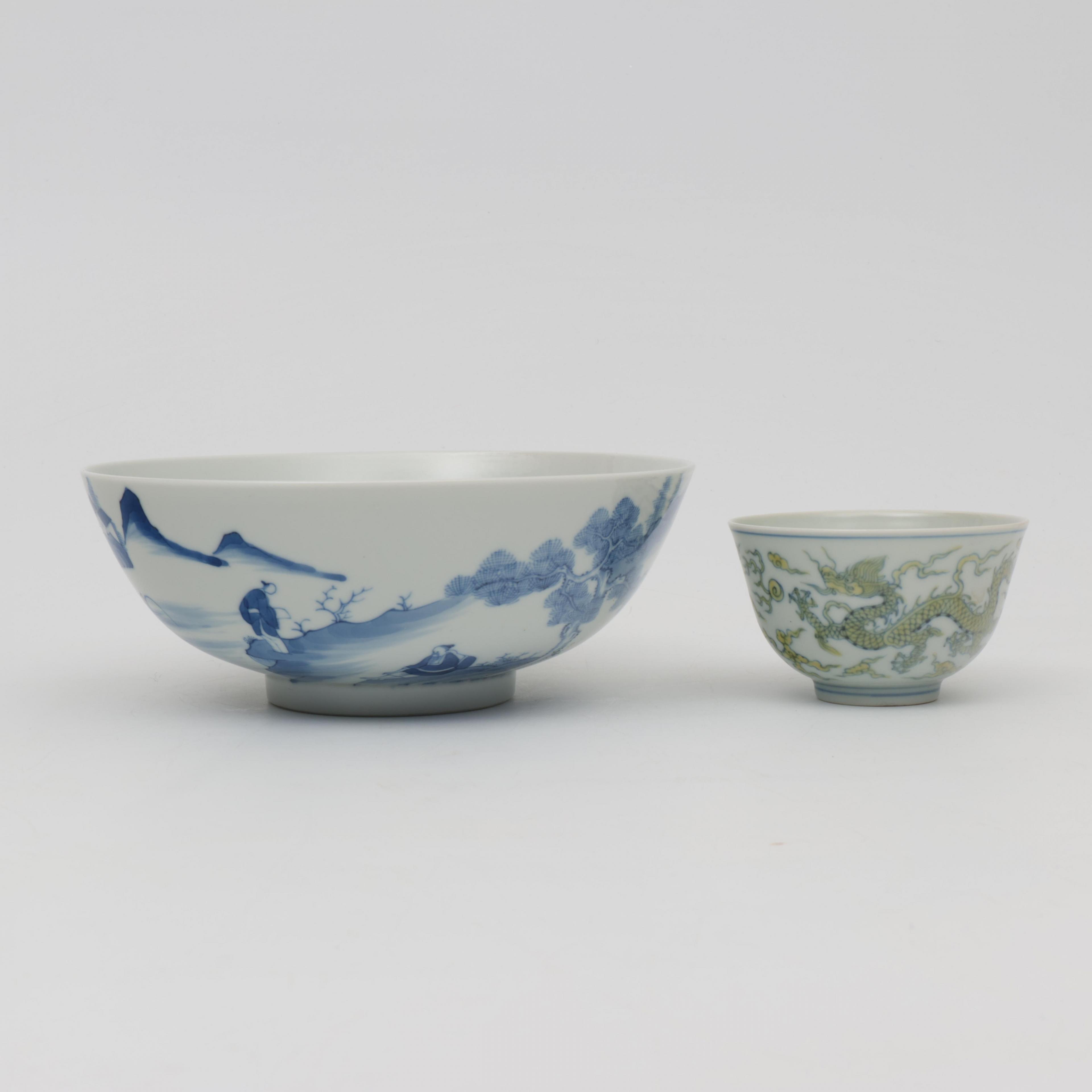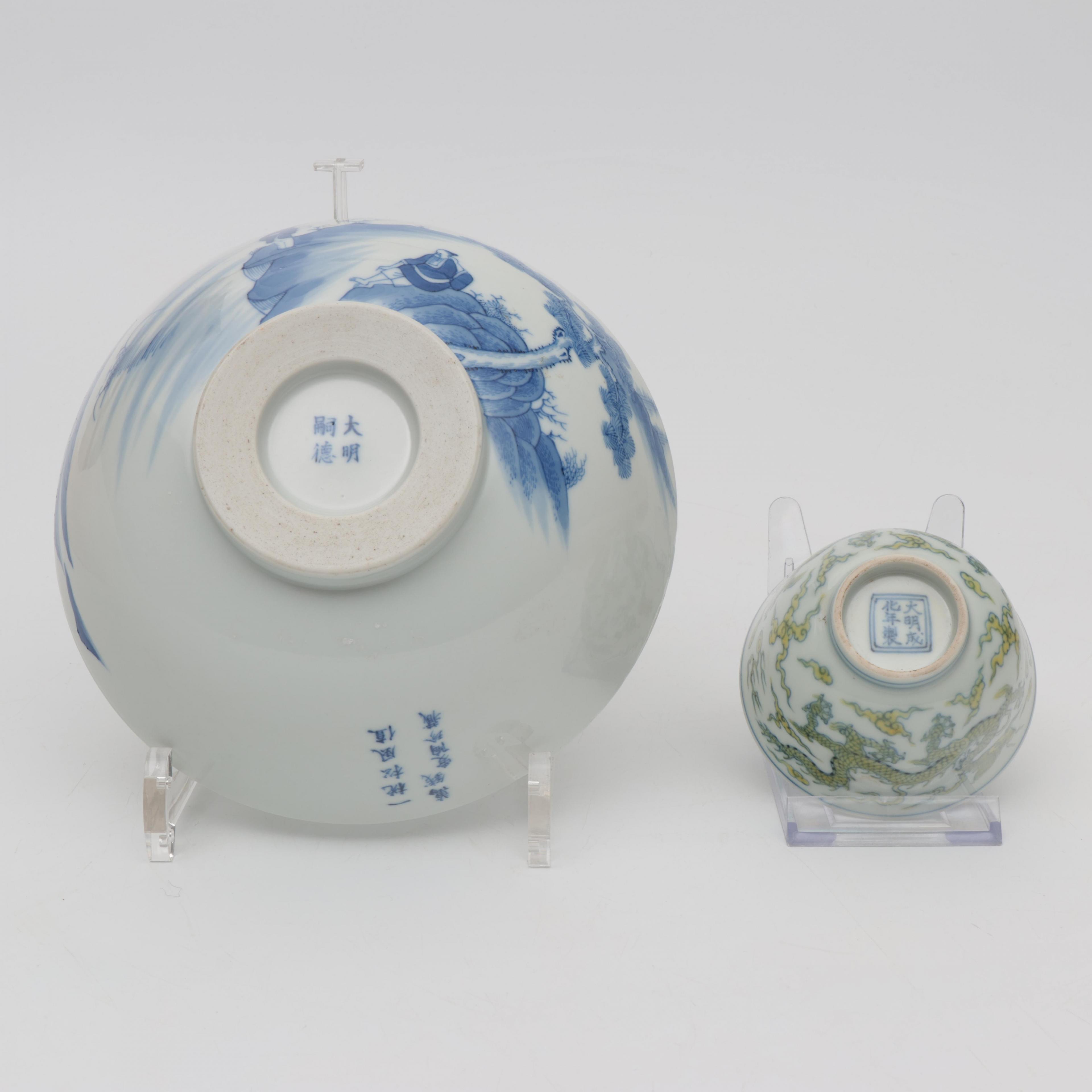 the blue and white bowl painted with figures in a landscape and a calligraphy, the base with apocryphal Tu Duc mark, the doucai bowl decorated with dragons contesting the flaming pearl, the base with an apocryphal Chenghua mark