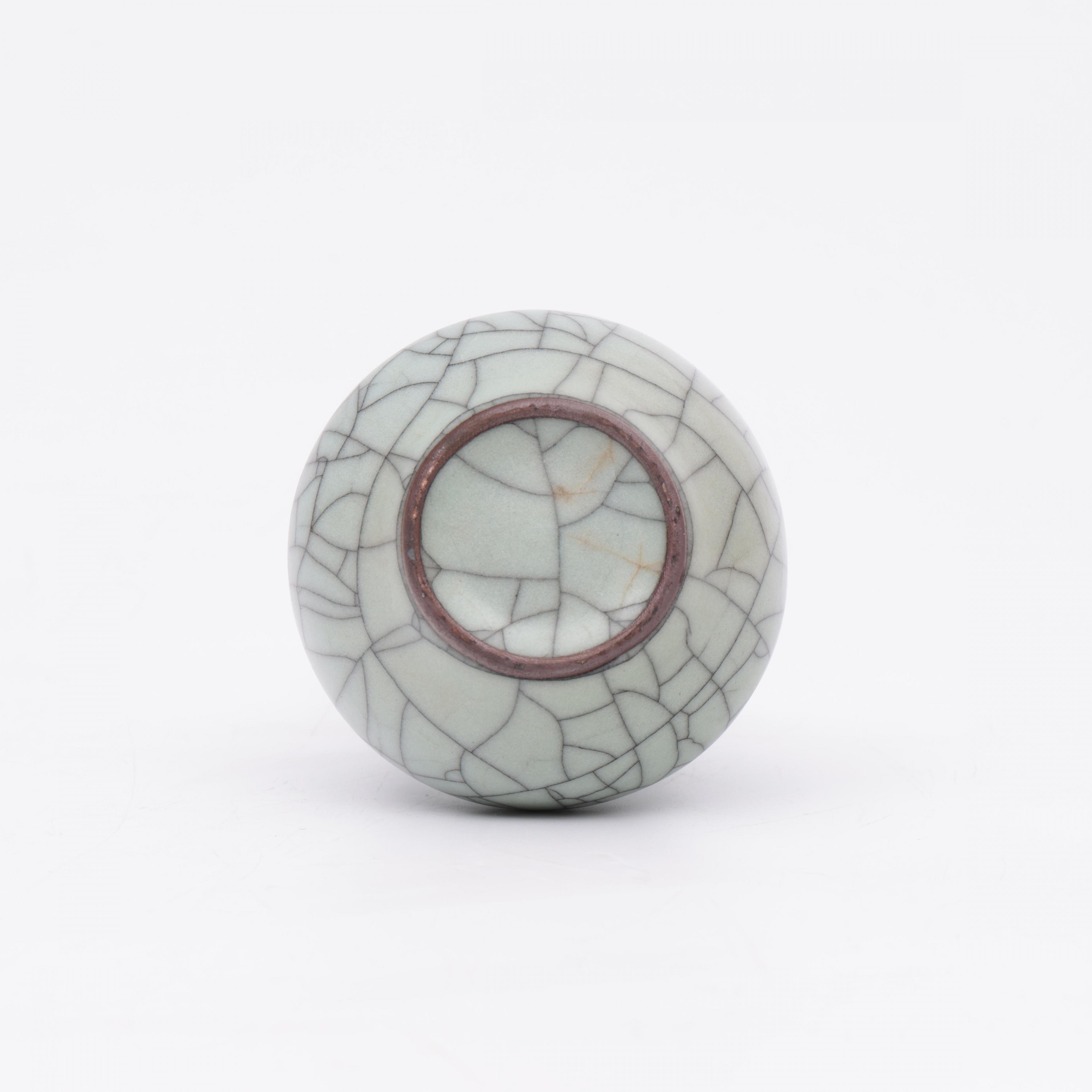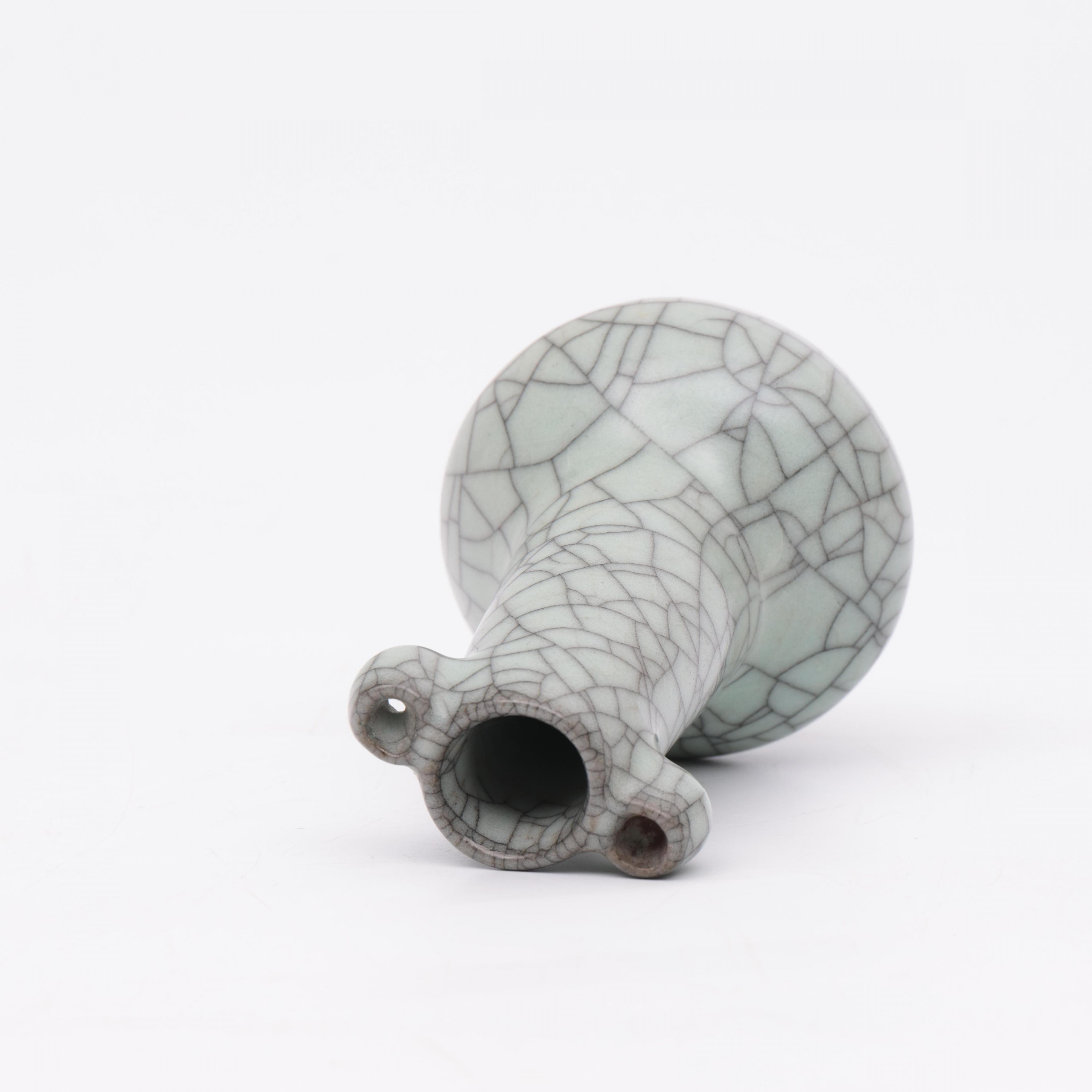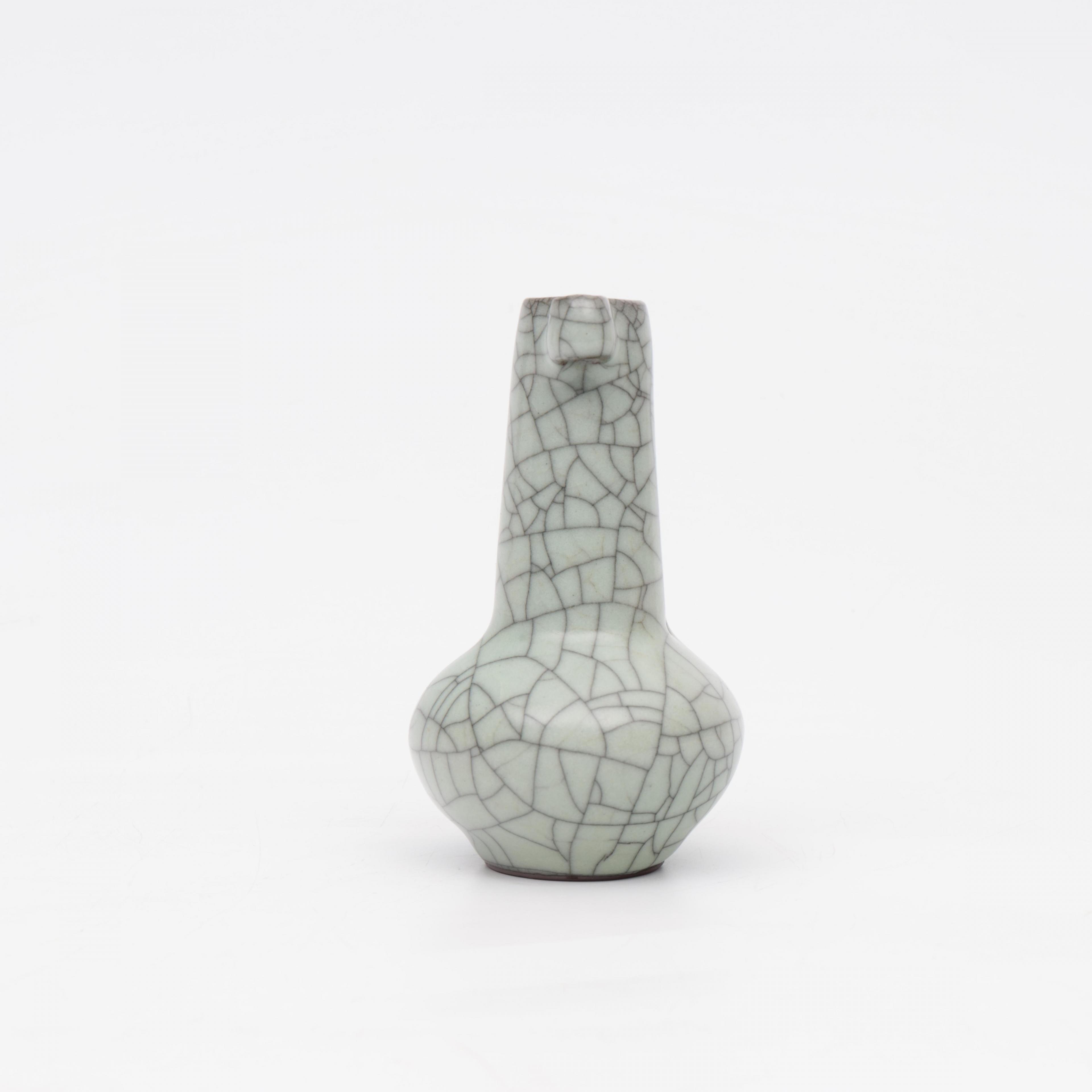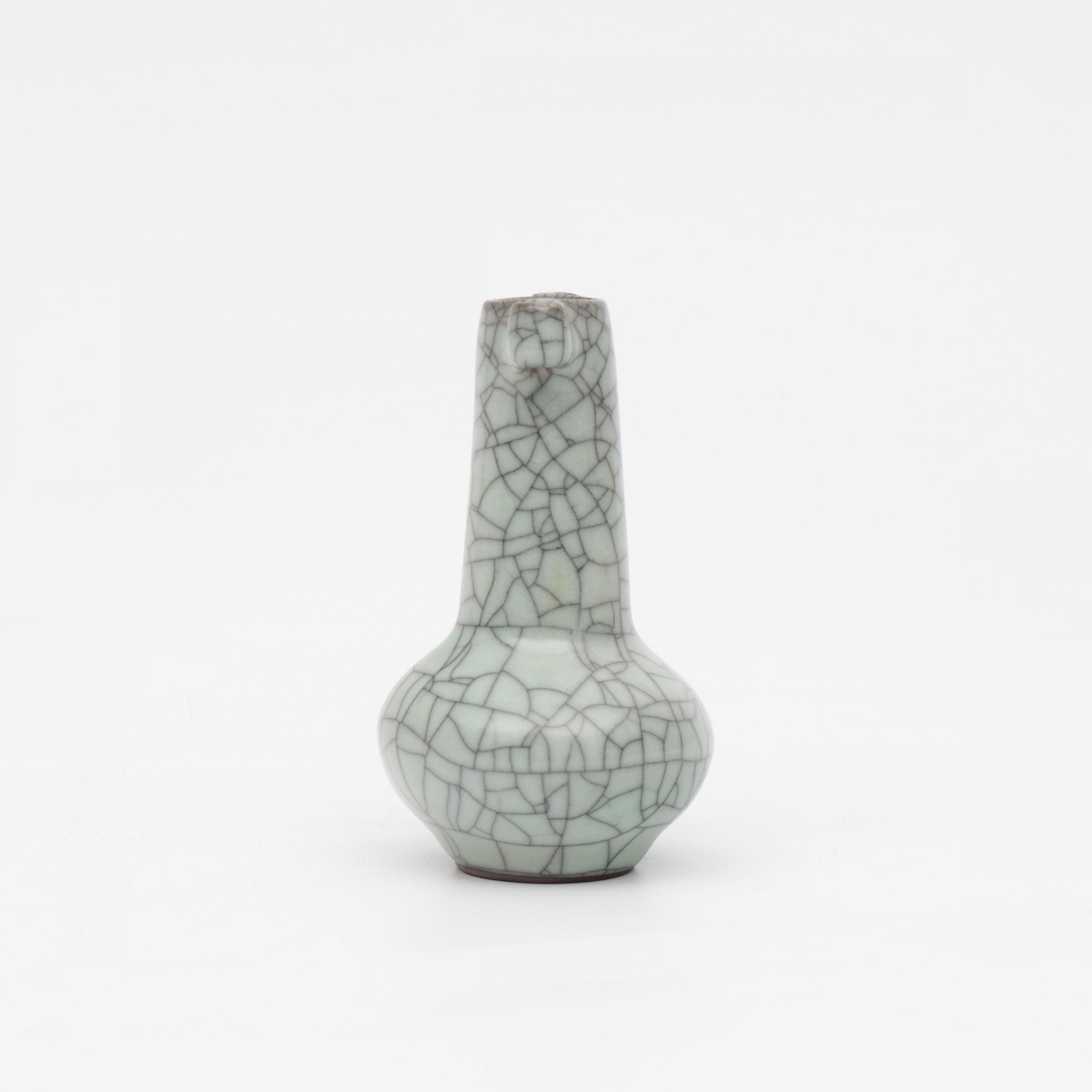 with bulbous body, tal neck and two lug handles, covered with a grayish green glaze suffused with grey and cream crackles