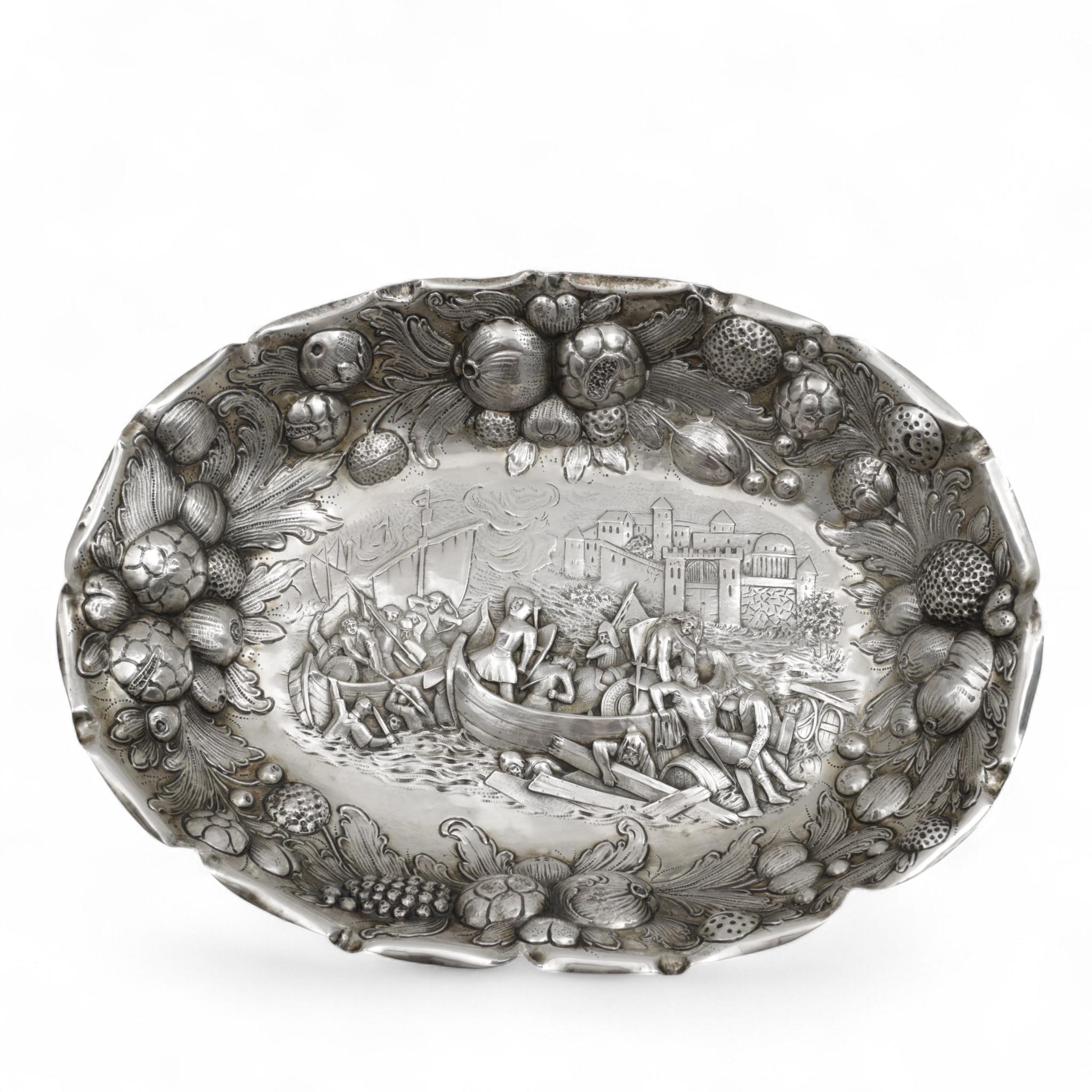 schaal versierd met voorstelling van het beleg van Wenen in 1683. De rand gedecoreerd met vruchten, mt. AB, 3e gehalte,