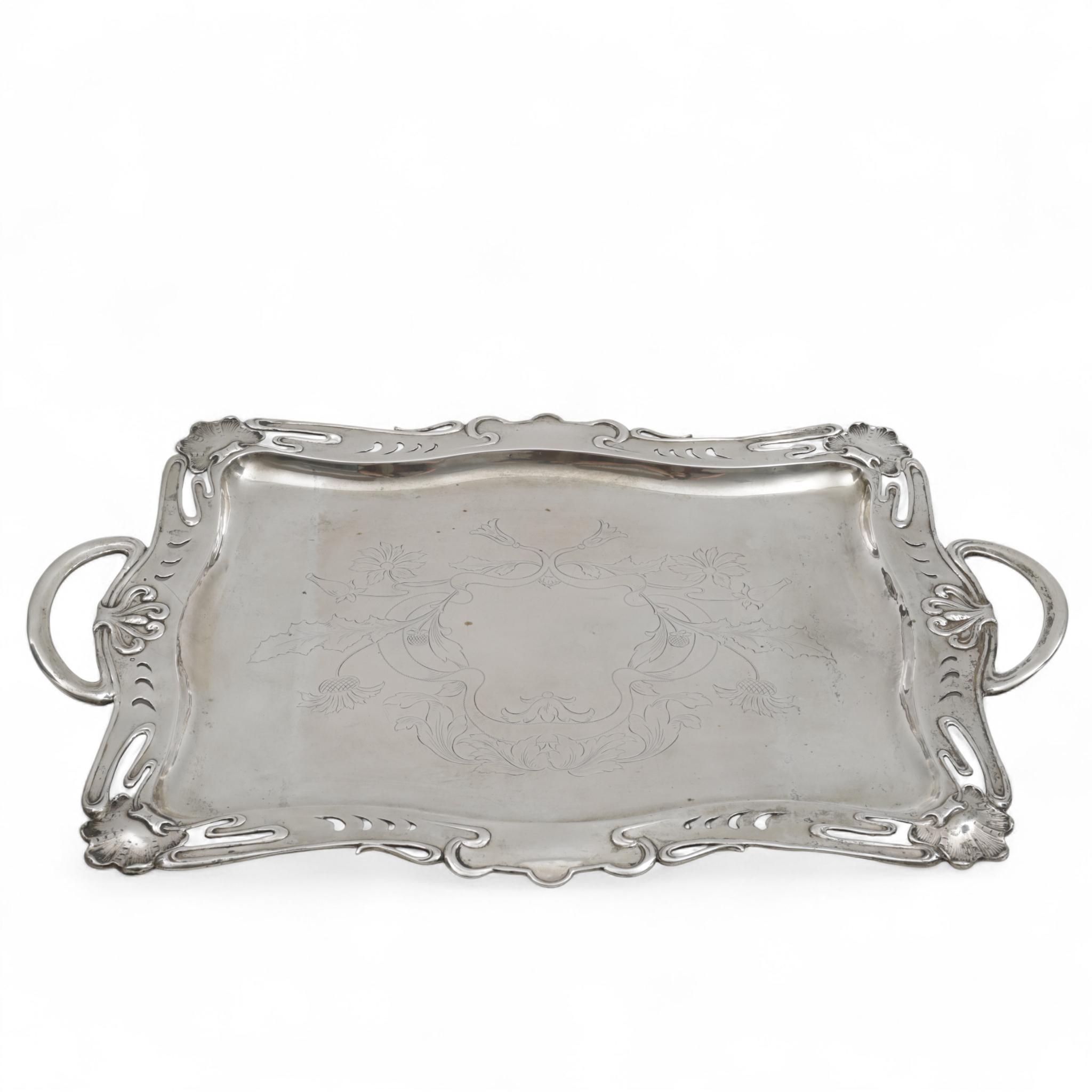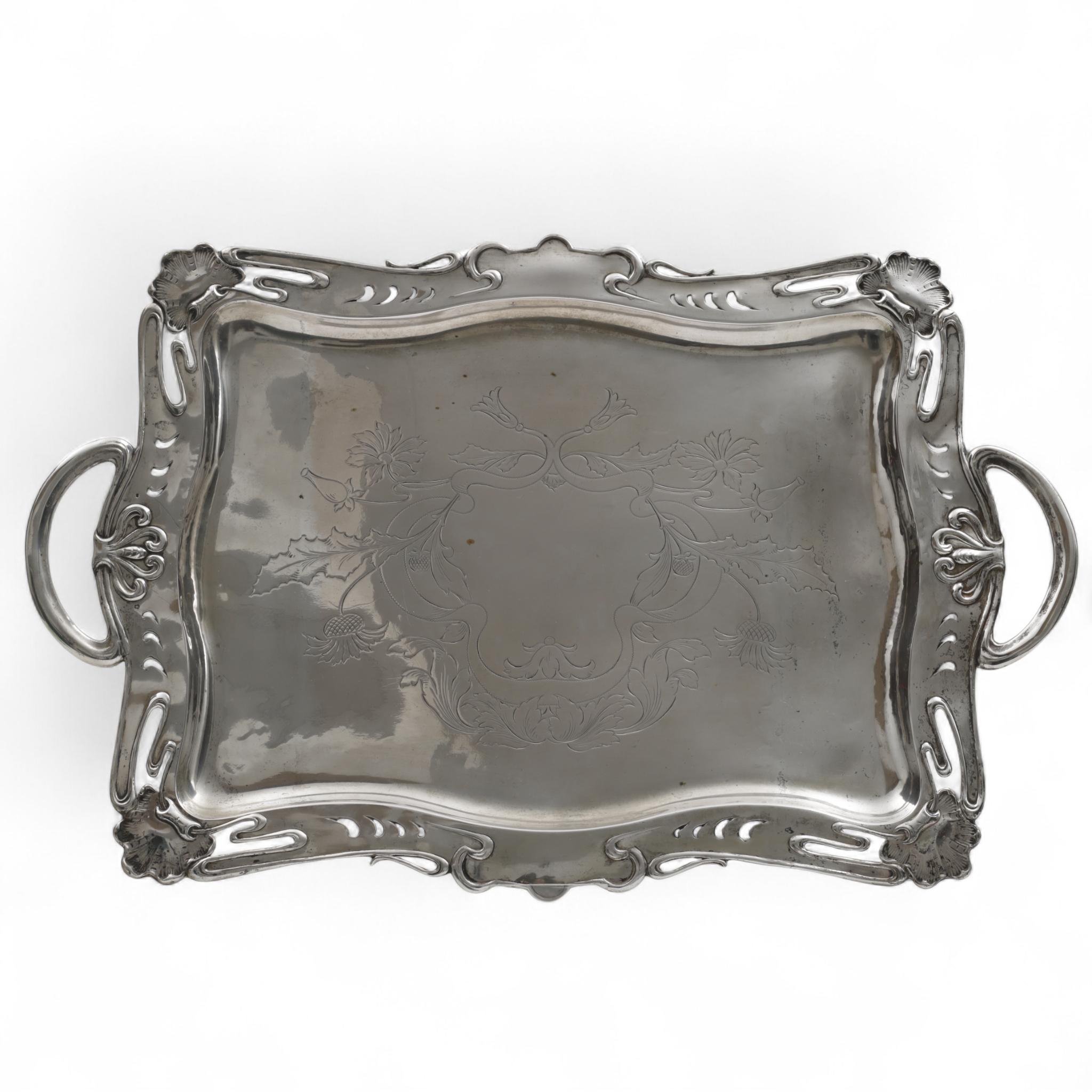 in het midden een gegraveerd cartouche met distels, de rand deels ajour, gedecoreerd met schelpmotieven en twee grepen, 3e gehalte,
