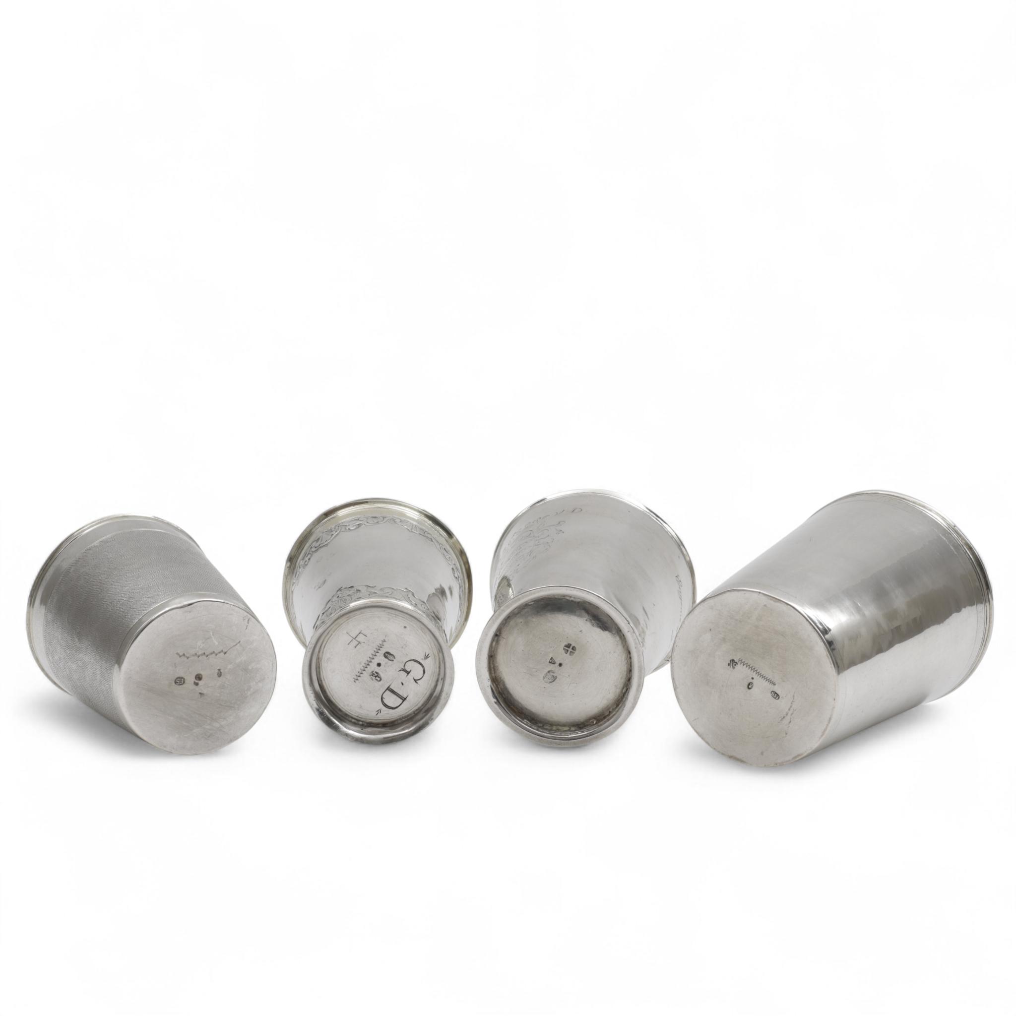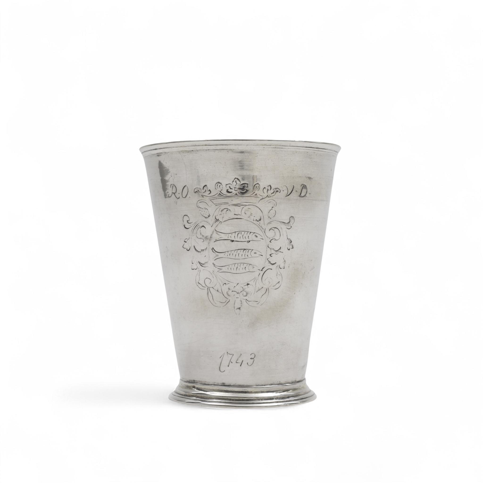 strak coninsch model mt. HS(niet geïdentificeerd) Augsburg 1739/41,3e gehalte, kelkvormige beker met versiering mt. M, ( zie Rosenberg nr 953) Augsburg 1743/5, met intialen G.D., 2e gehalte, huwelijksbeker R.O. en V.D. datering 1743 en wapengravure verso huwelijksgravering uit 1902 met wapen en echtlieden, mt, VA Bruchsal (vermoedelijk) 18e eeuw BWG, beker met mt. FS, stadskeur onduidelijk, gehamerde huid, 3e gehalte, alle met licht vergulde binnenzijde, 2e gehalte,