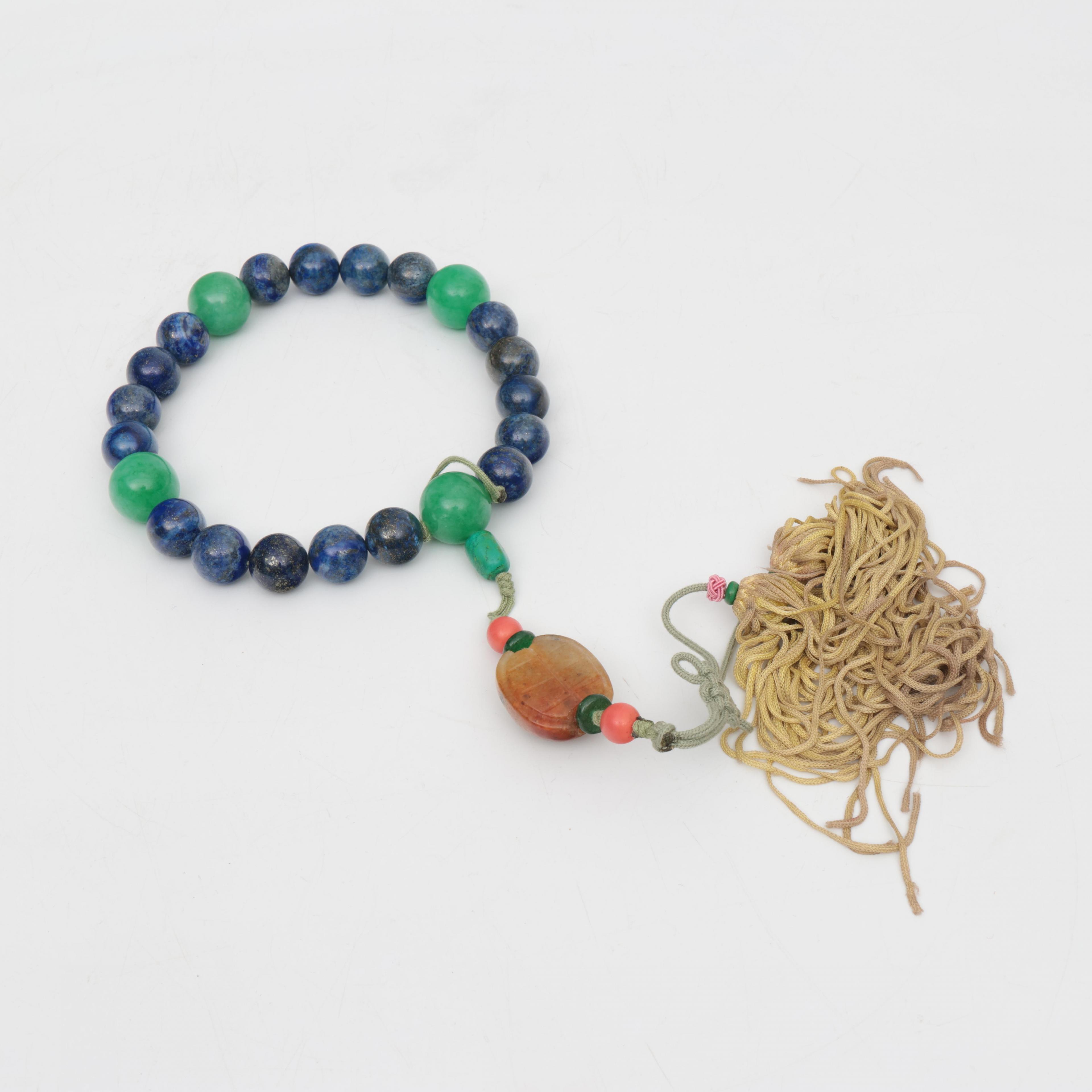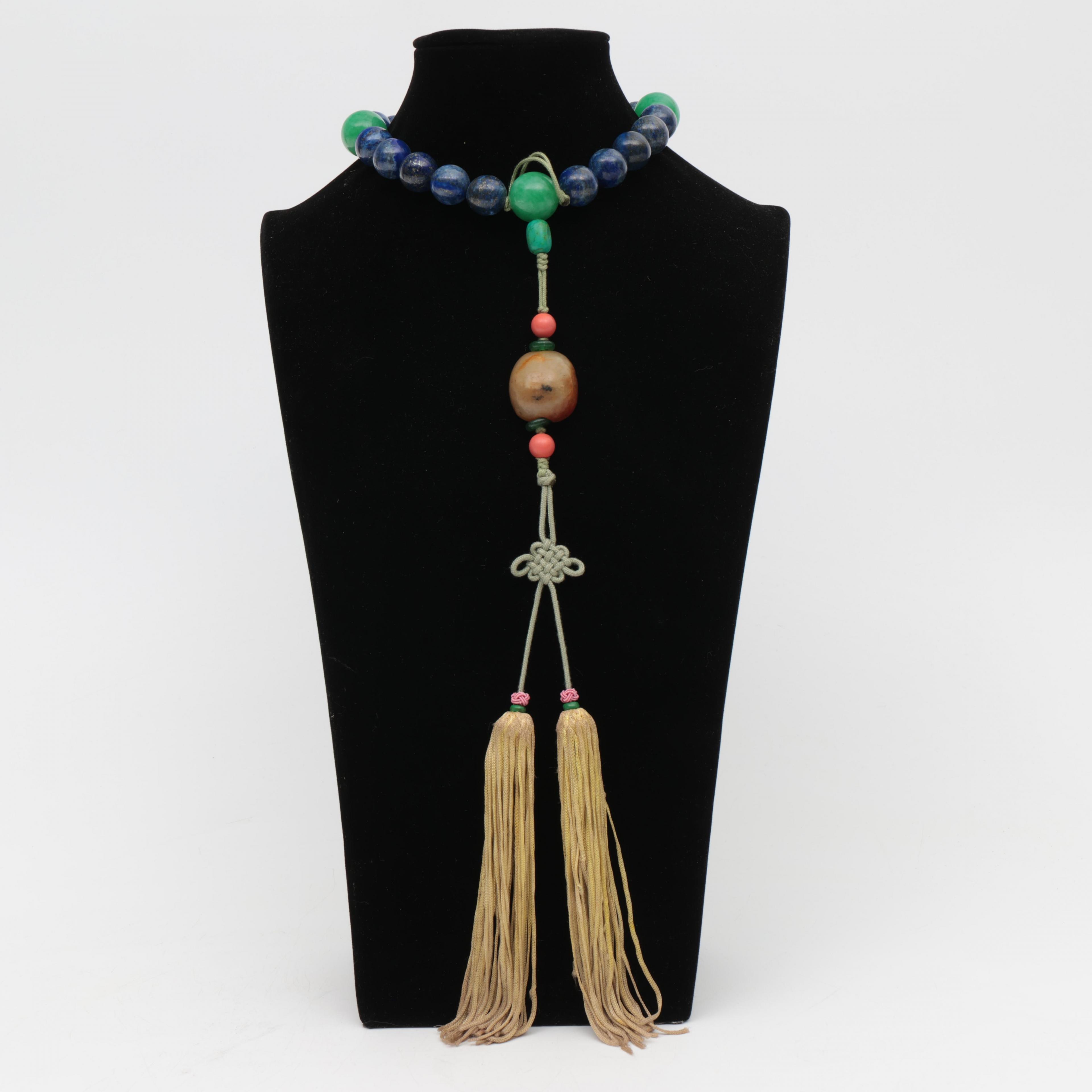 comprising beads of glass, lapis lazuli and jade, with jade pendant and hanging tassels
