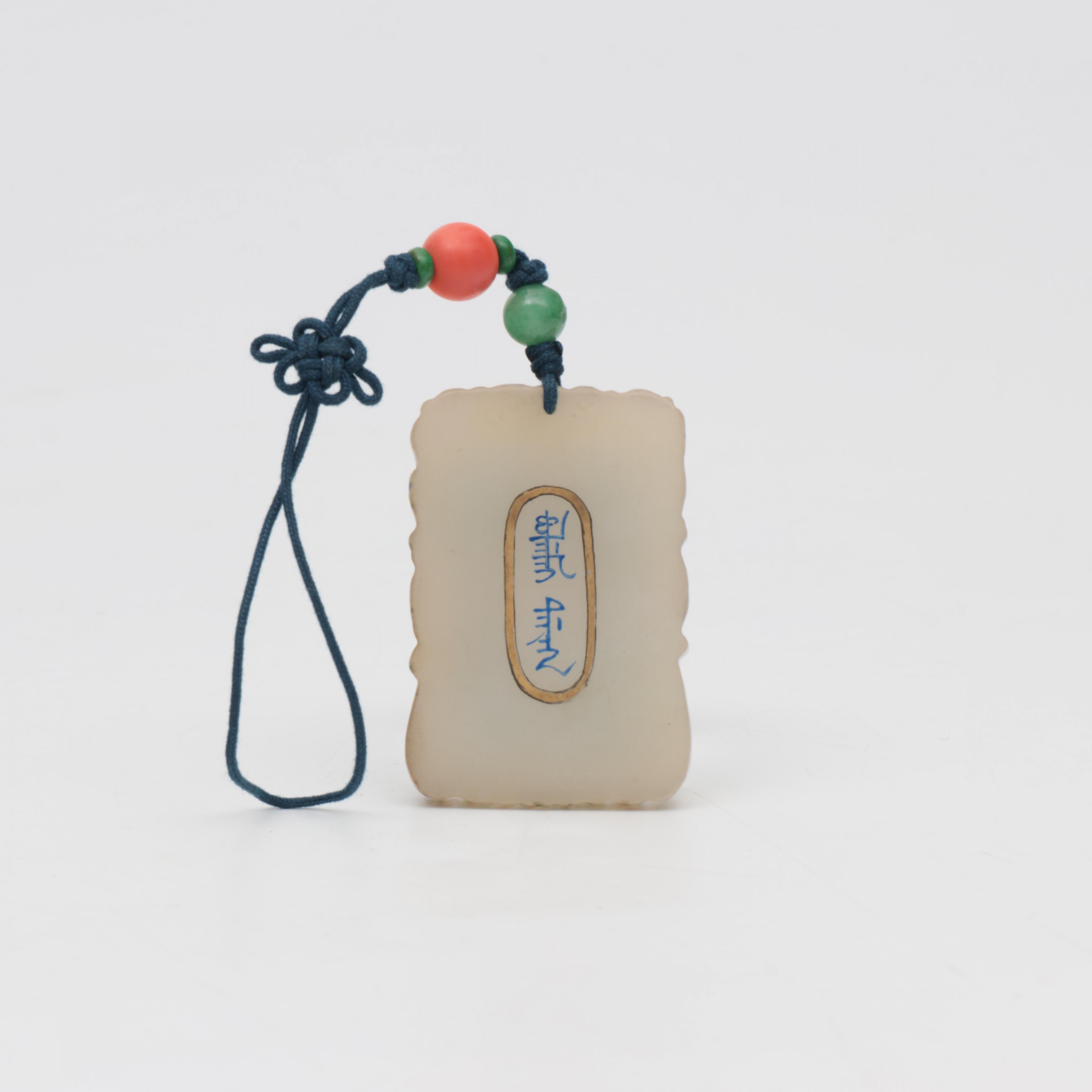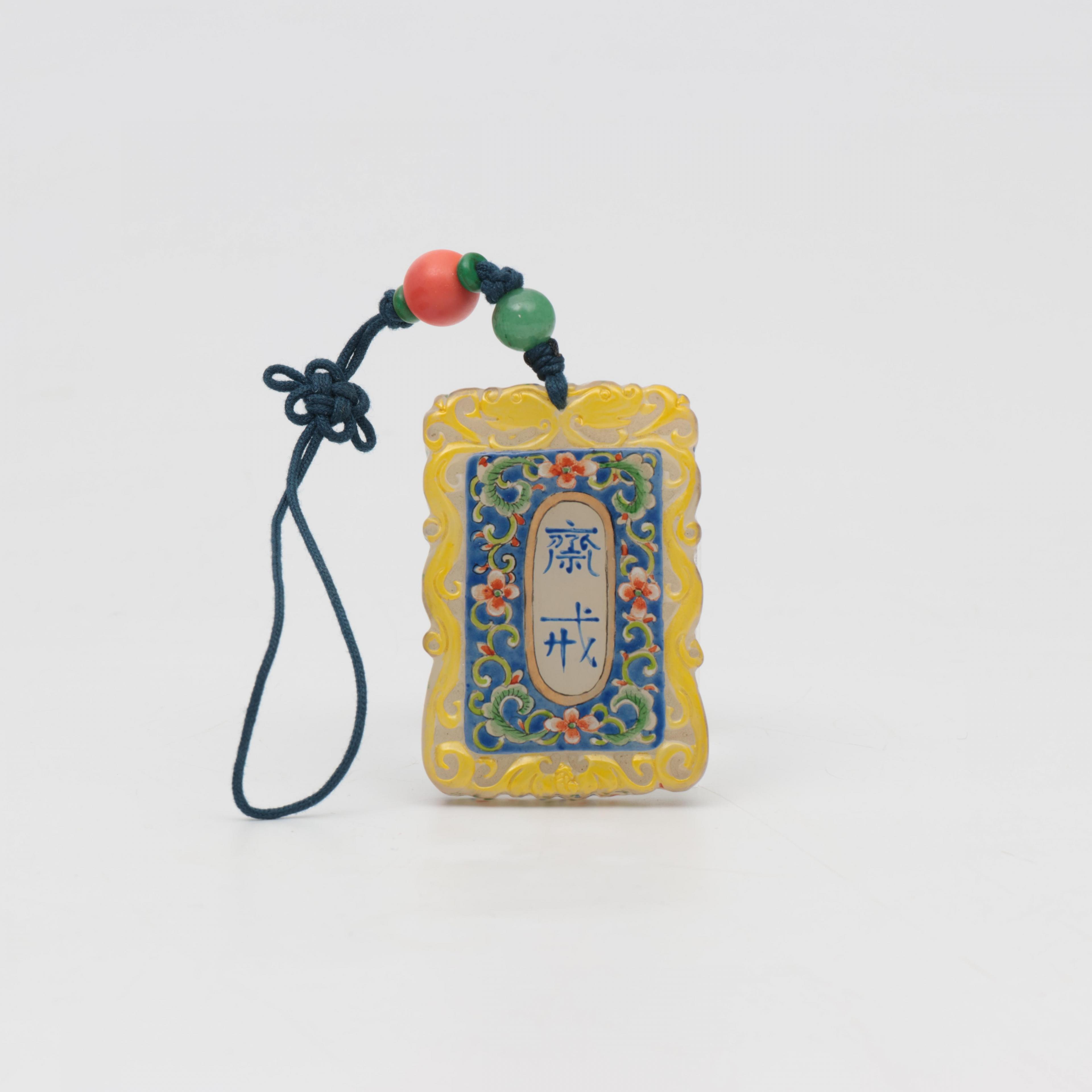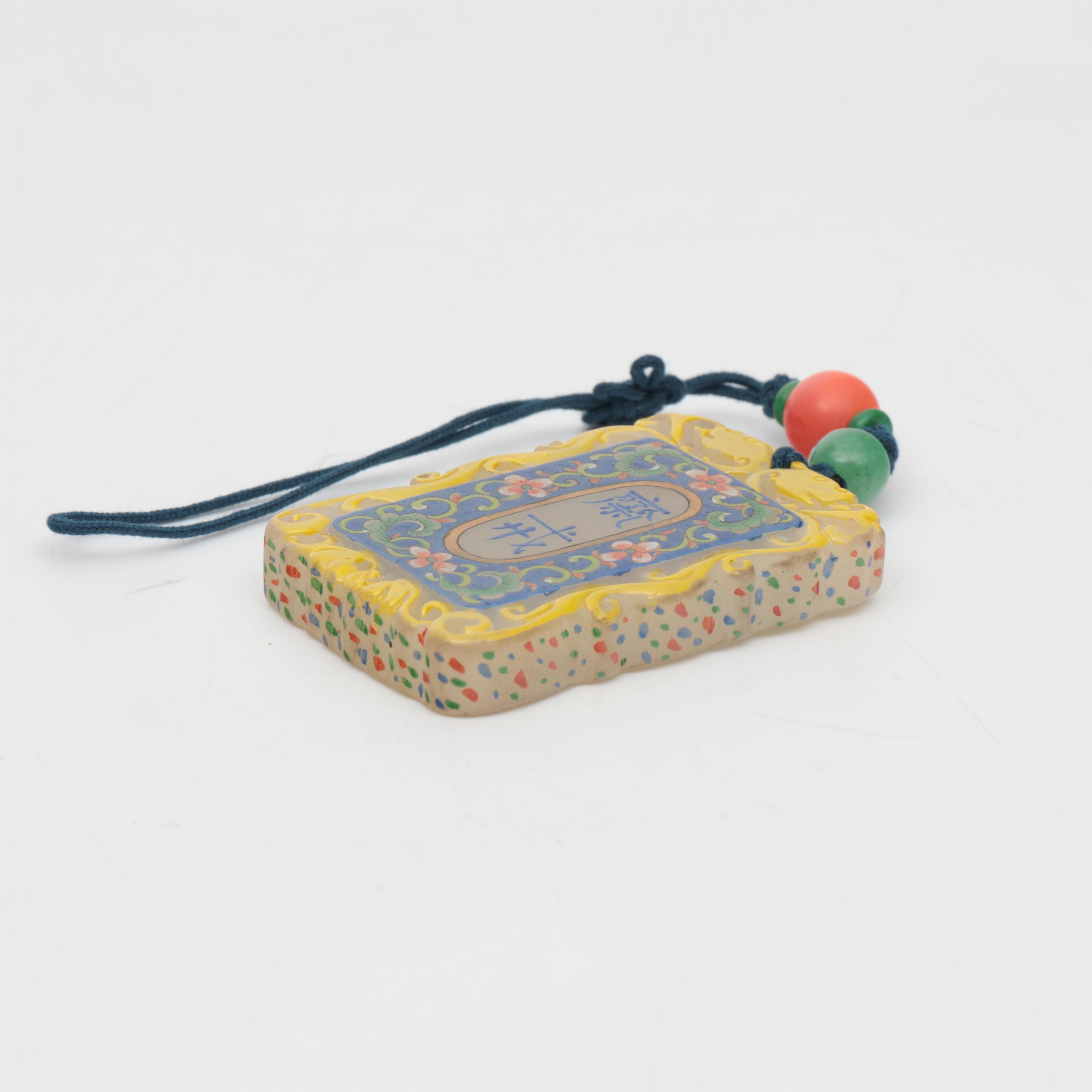 of rectangular shape and enamelled in yellow and blue with flower scrollsencircling a cartouche with characters, with malachite and coral bead