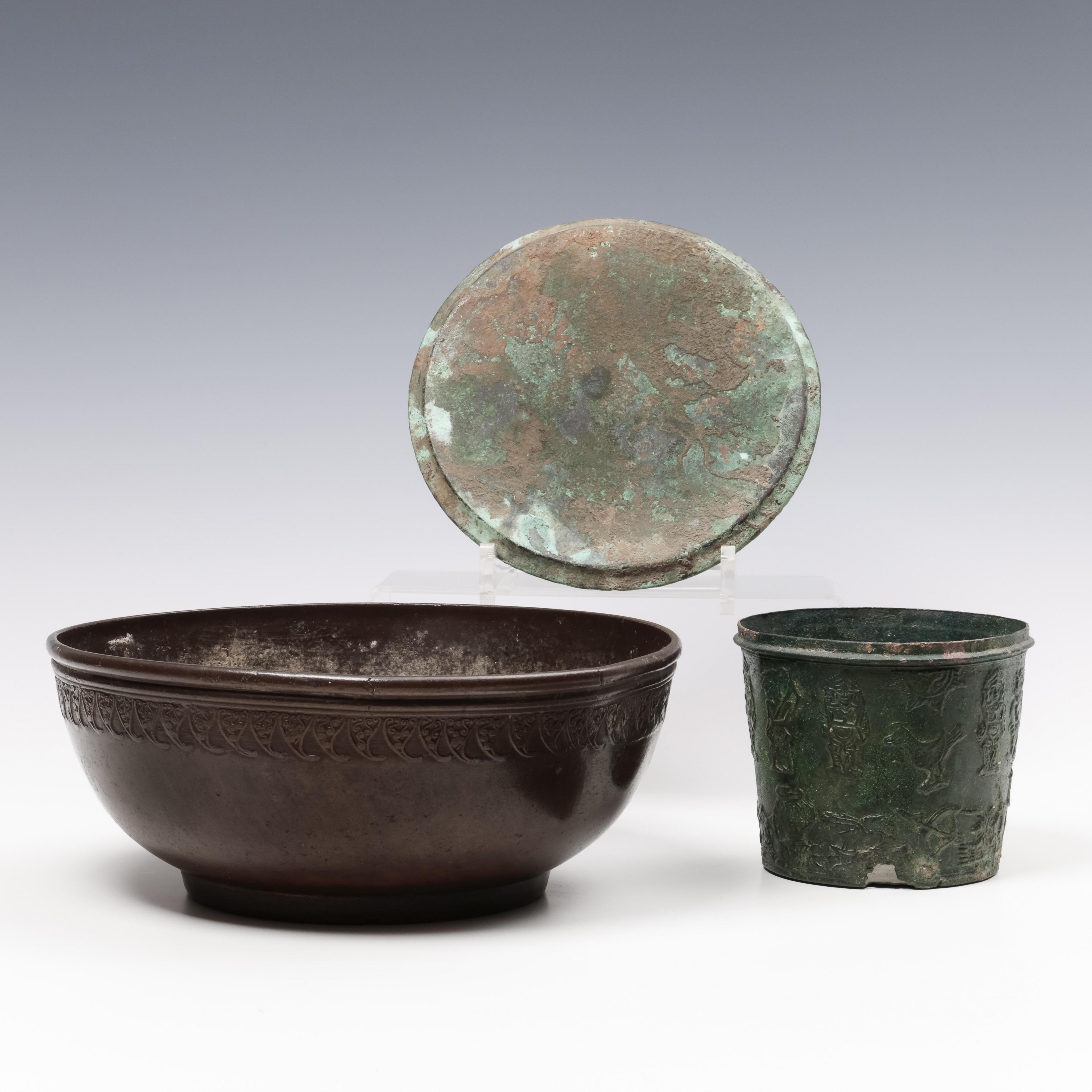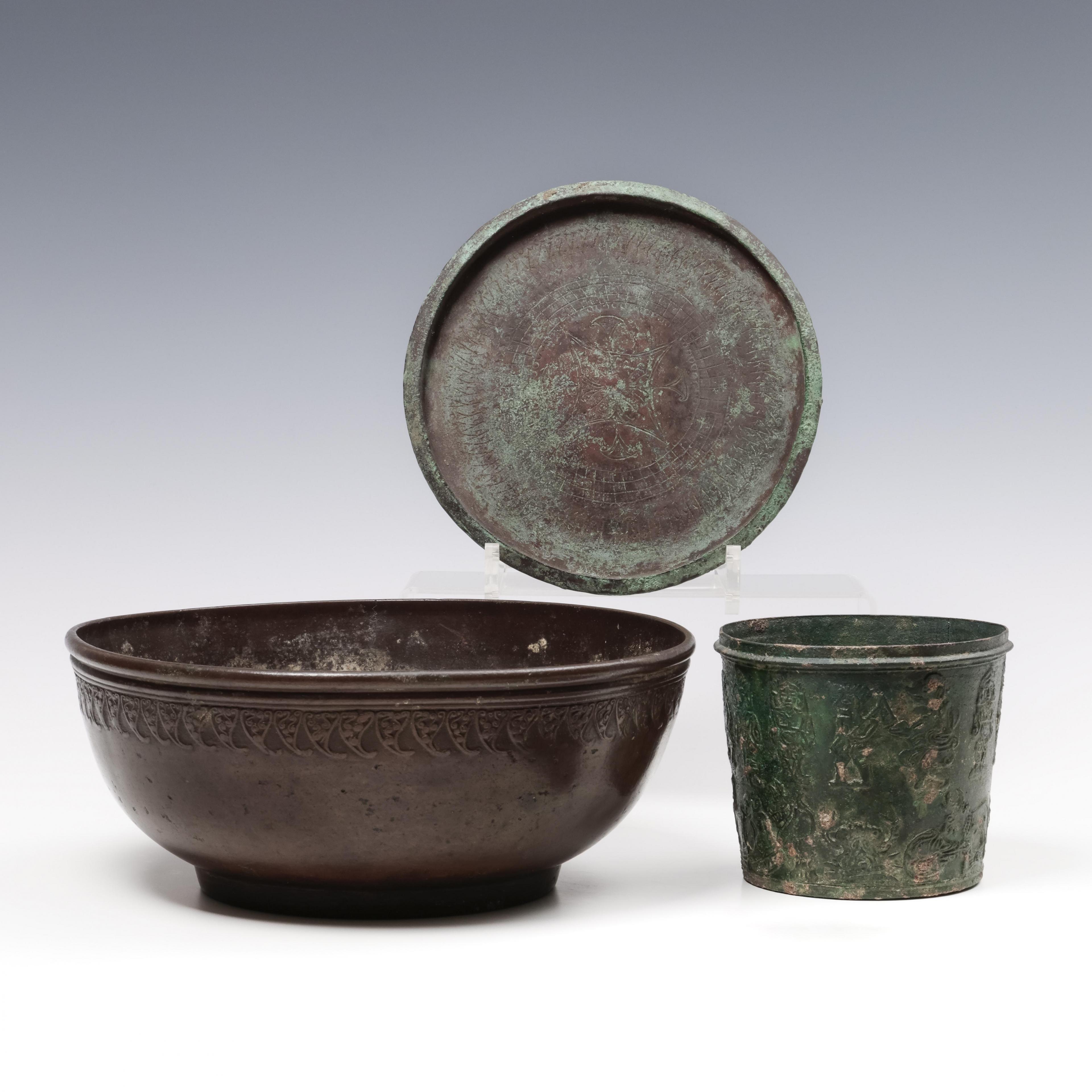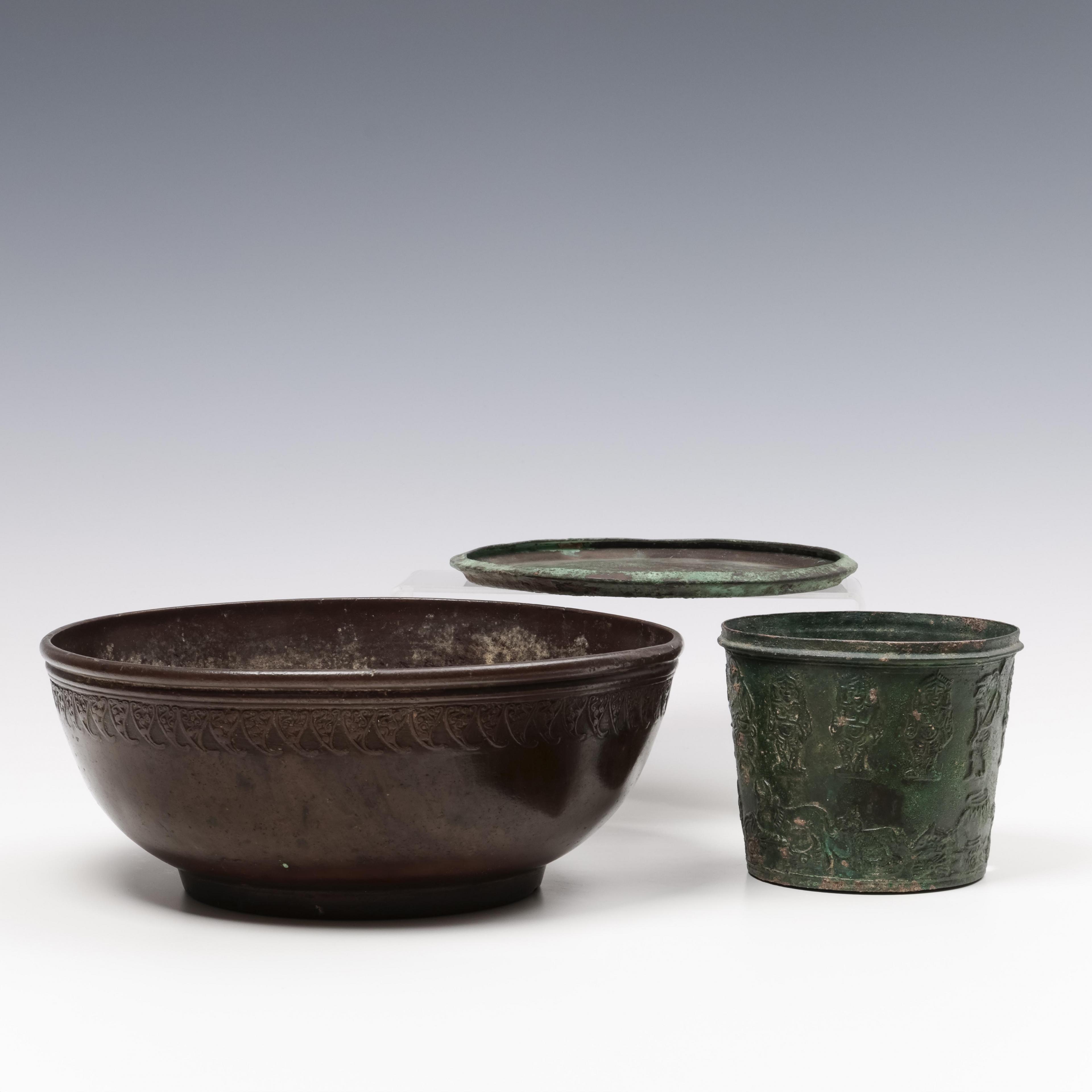 Herewith a small bronze talem, ca. 15th century and a 19th century bronze bowl. (zodiak beaker damaged)