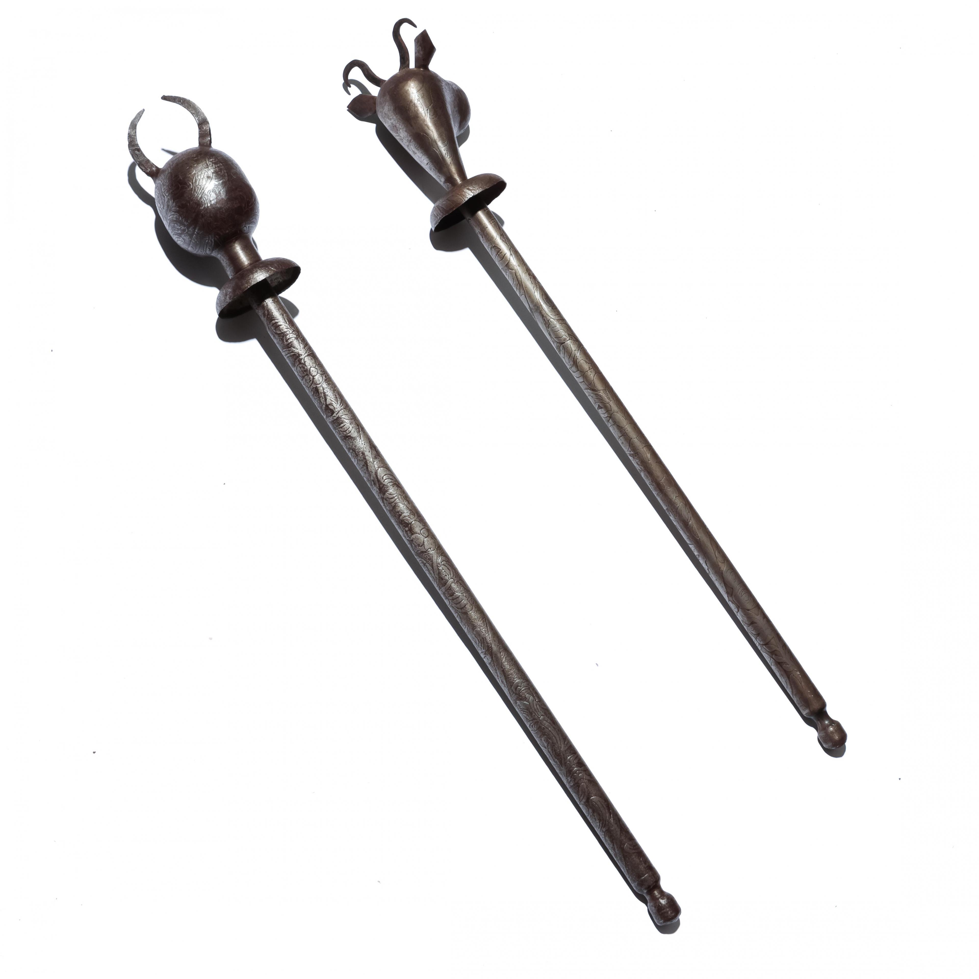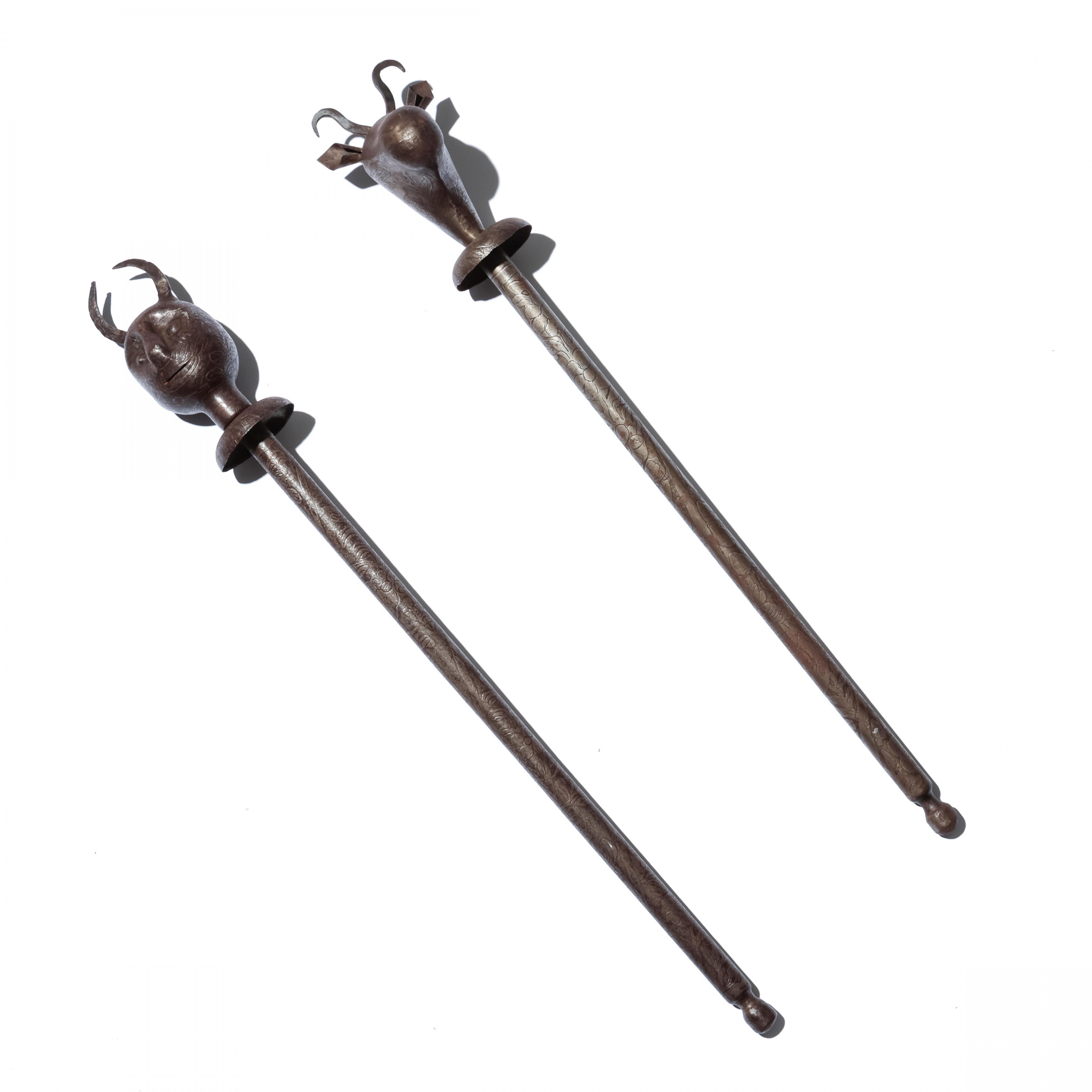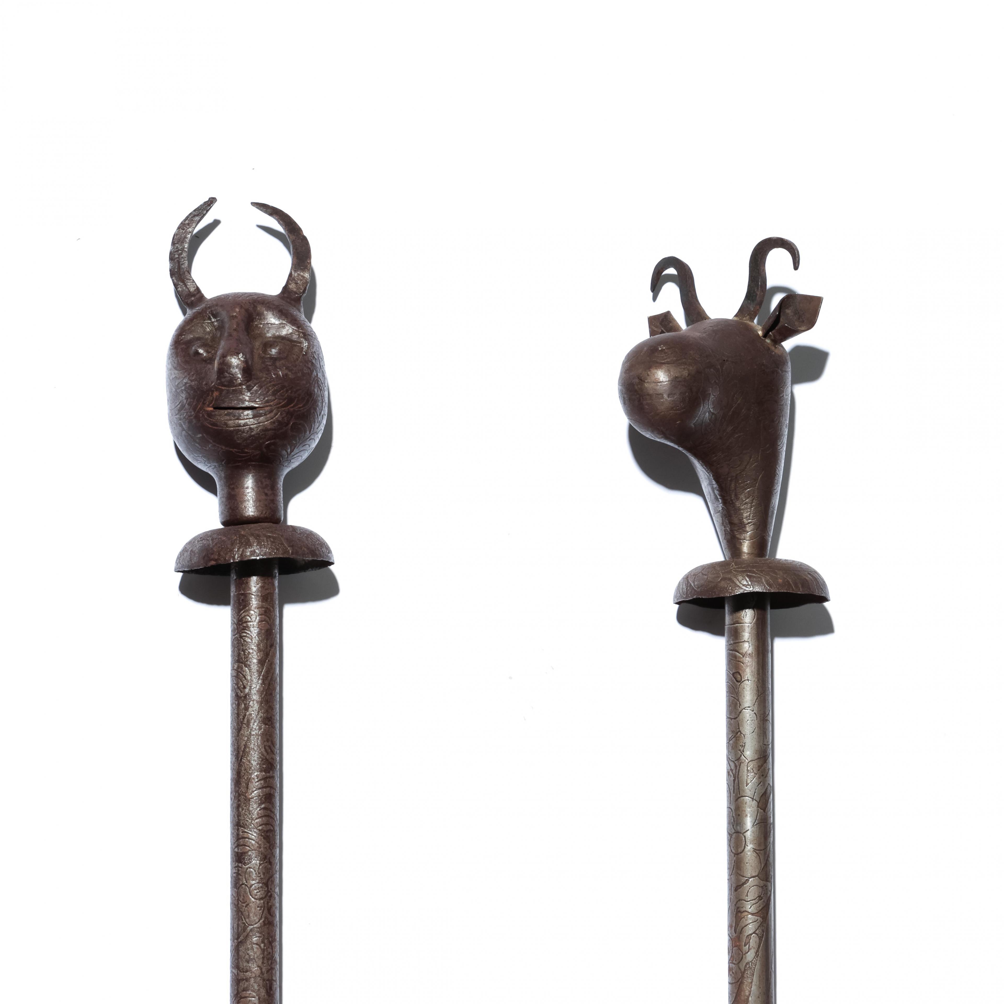 one staff finial in the shape of an animal, the other a anthropomorphic head.