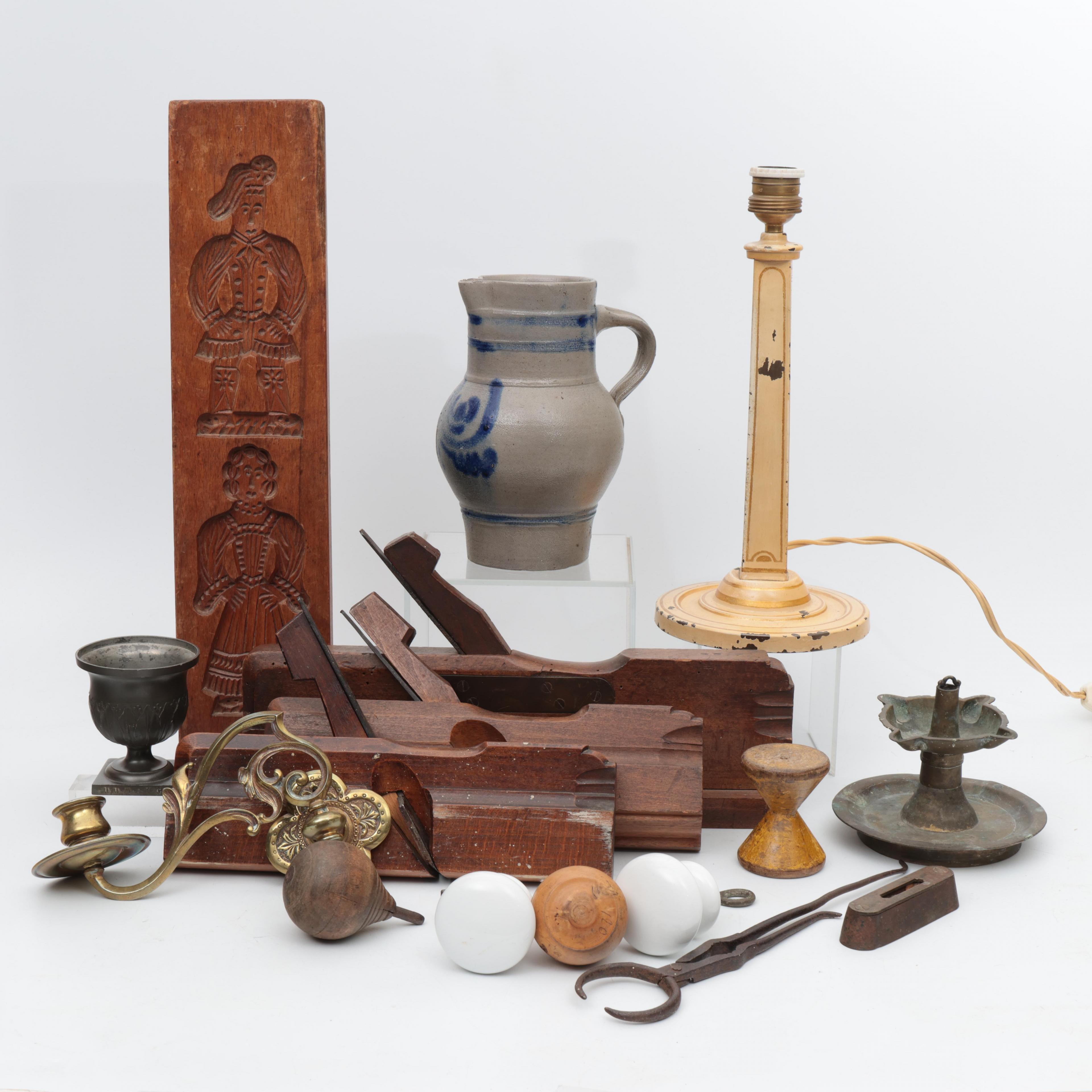w.o. houten antieke schaven, koekplank en wandapplique.