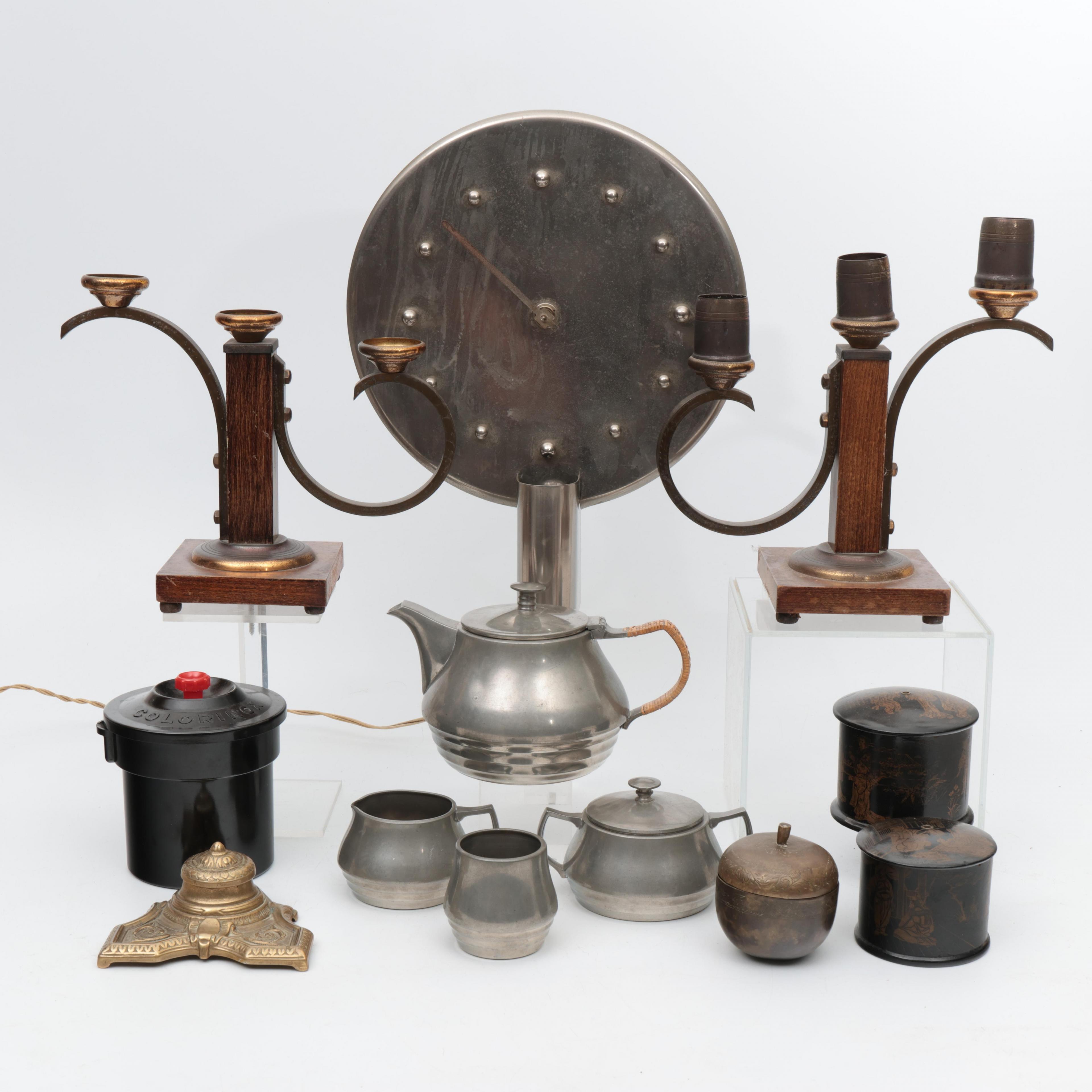 w.o. nikkelen art deco klok, Gero theeservies ontwerp Georg Nilsson en koperen kandelaren.