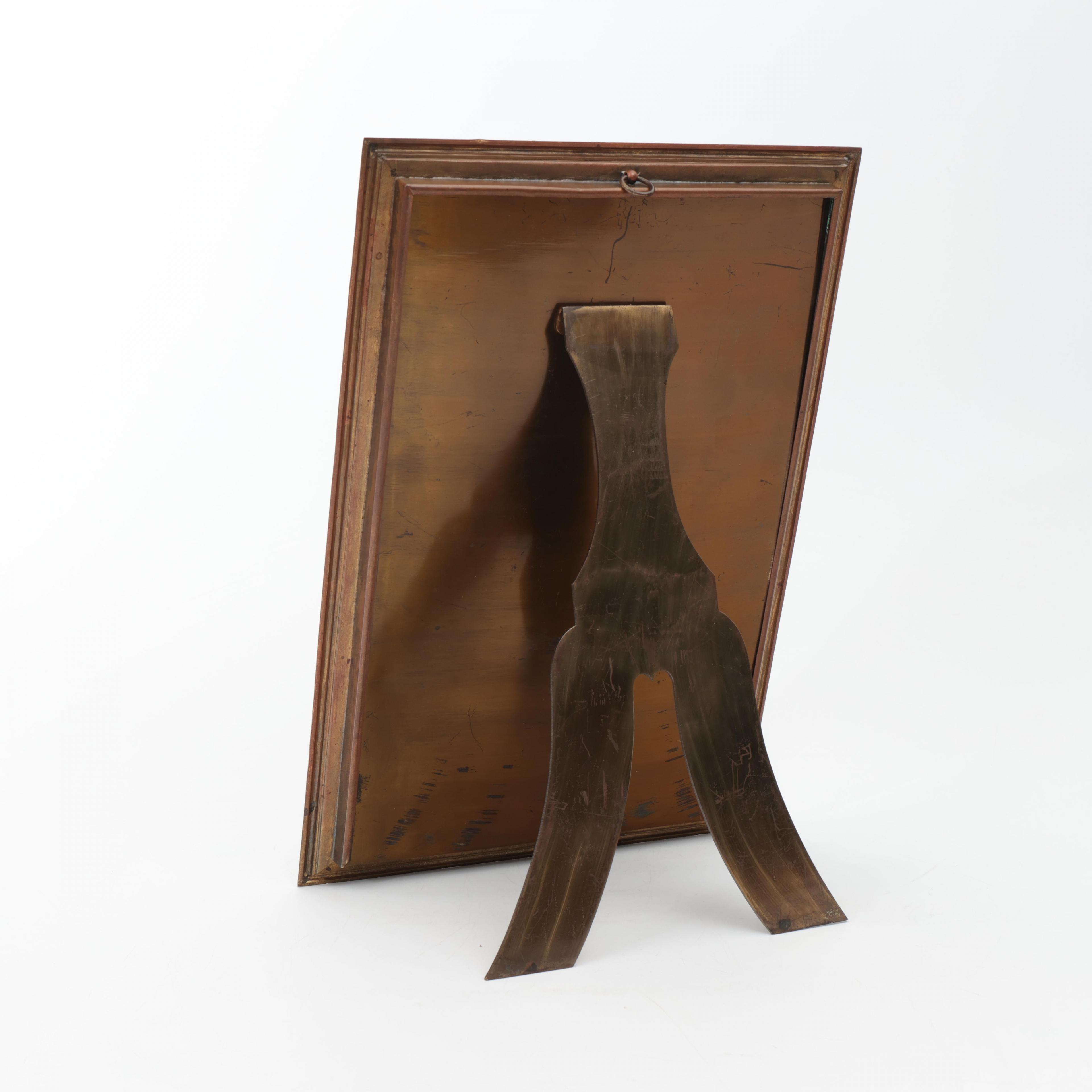 Uitgevoerd met wederkerige decoratie van palmetten. De achterzijde met standaard en ophangoog.
