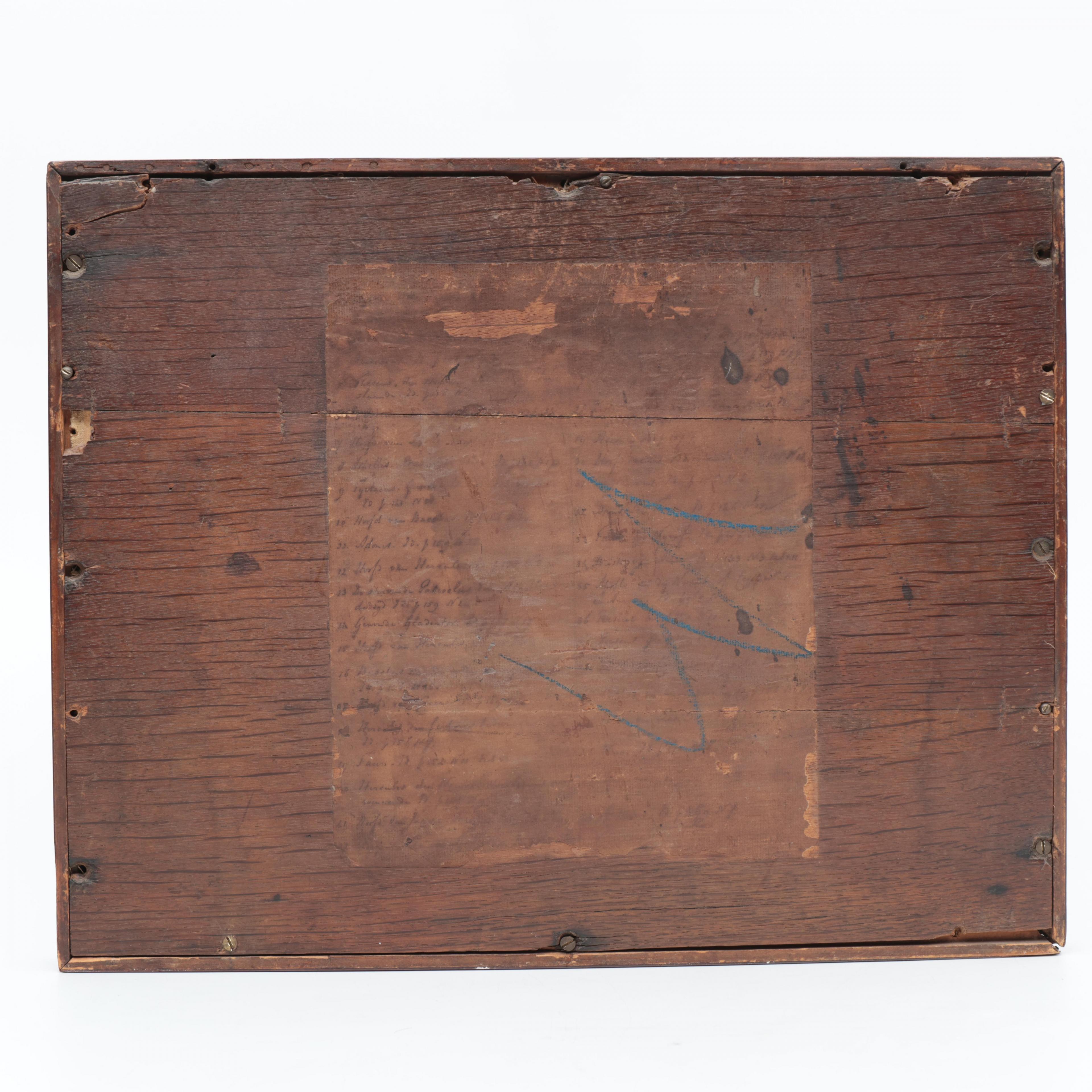 Uitgevoerd in rode was, in wandvitrine. Achterzijde met handgeschreven legenda.
