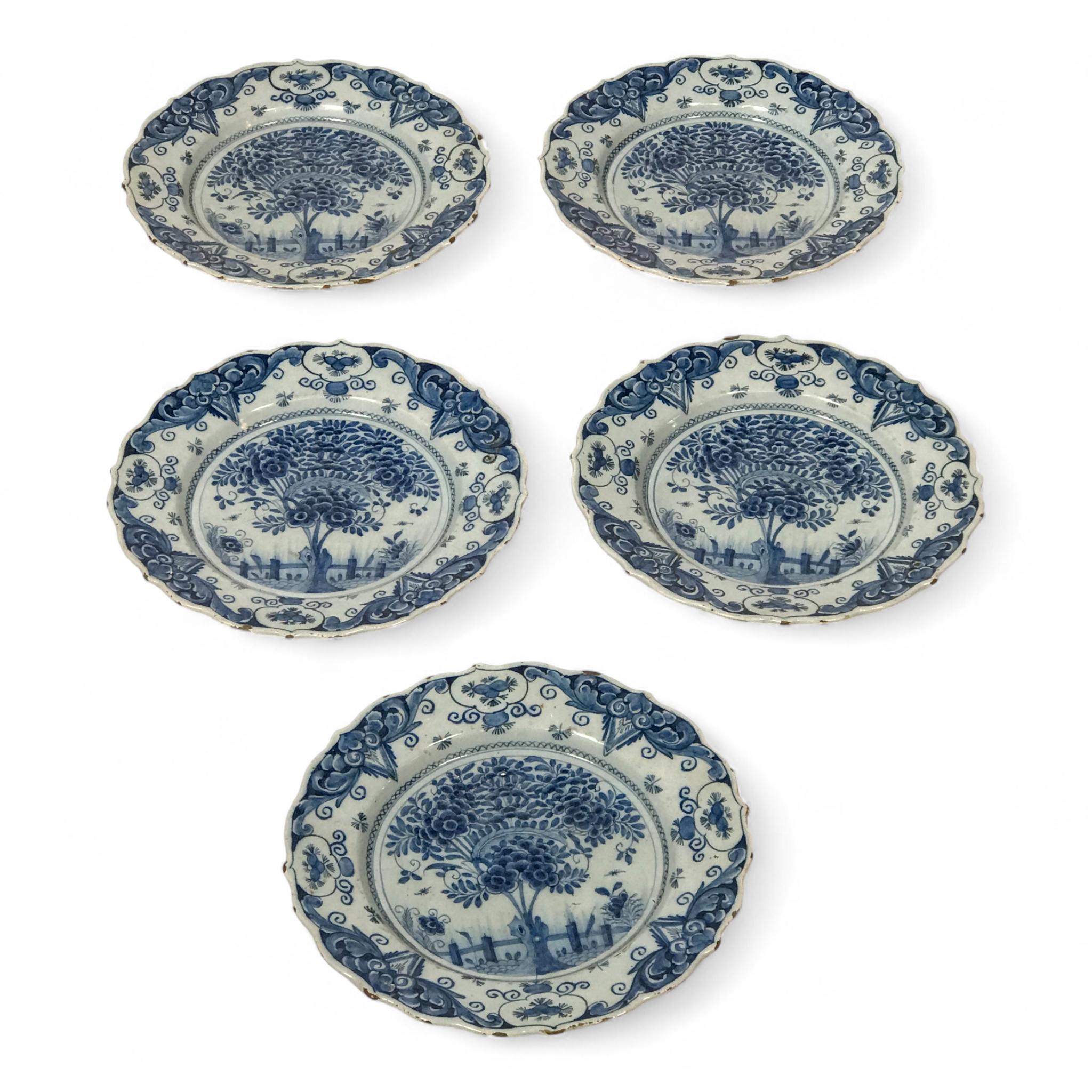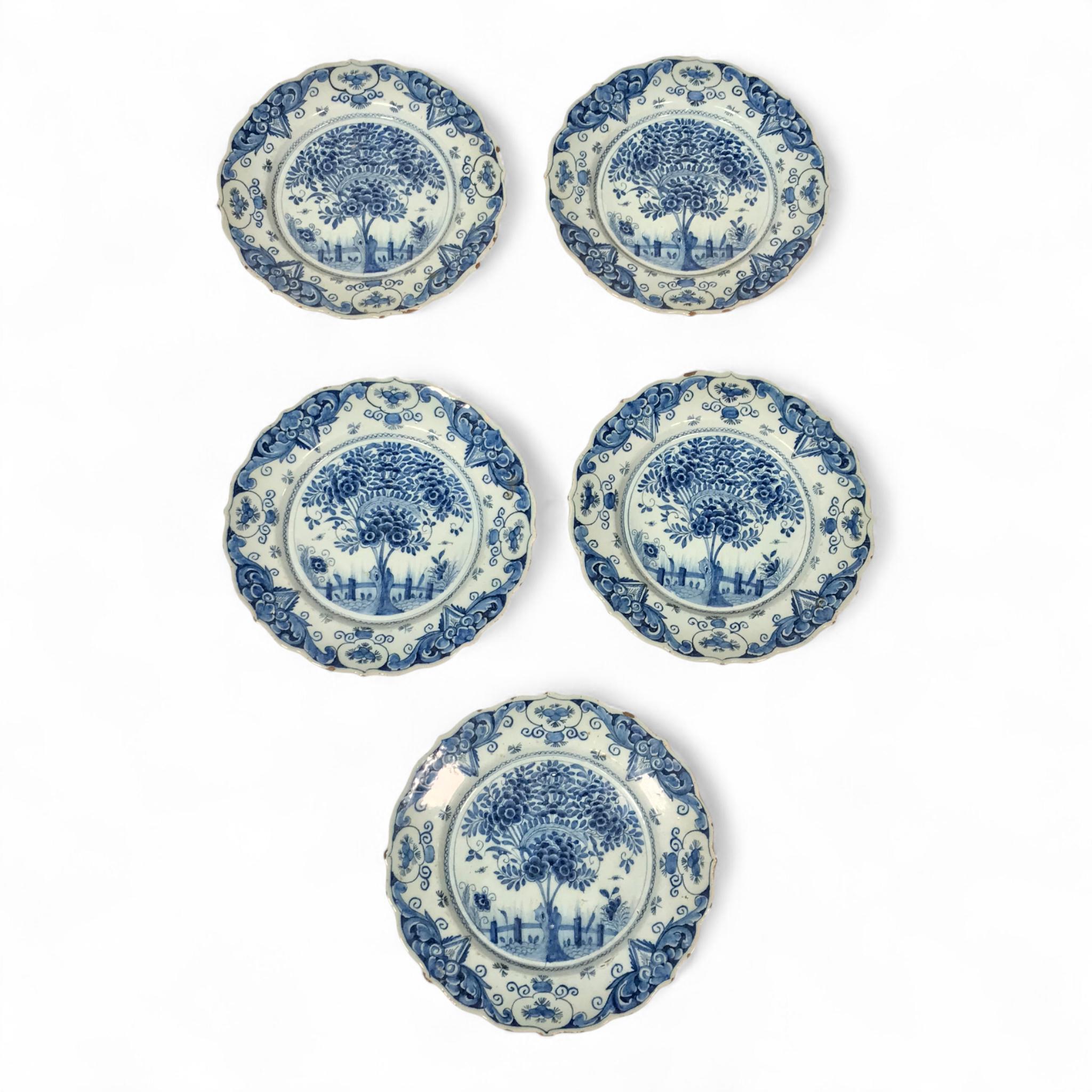 Delft, fabriek 't Fortuijn, serie van vijf blauw wit aardewerk borden, 18e eeuw,
