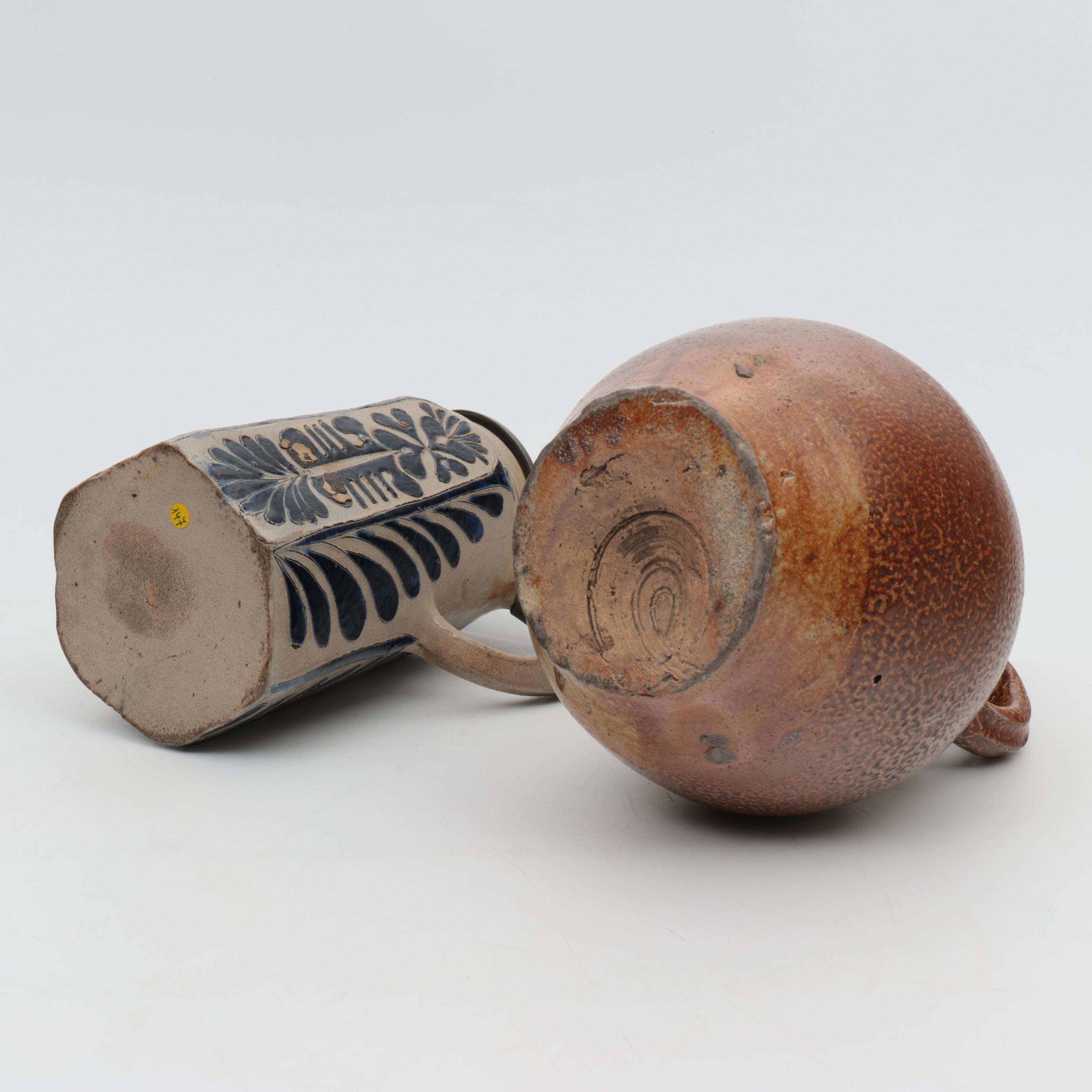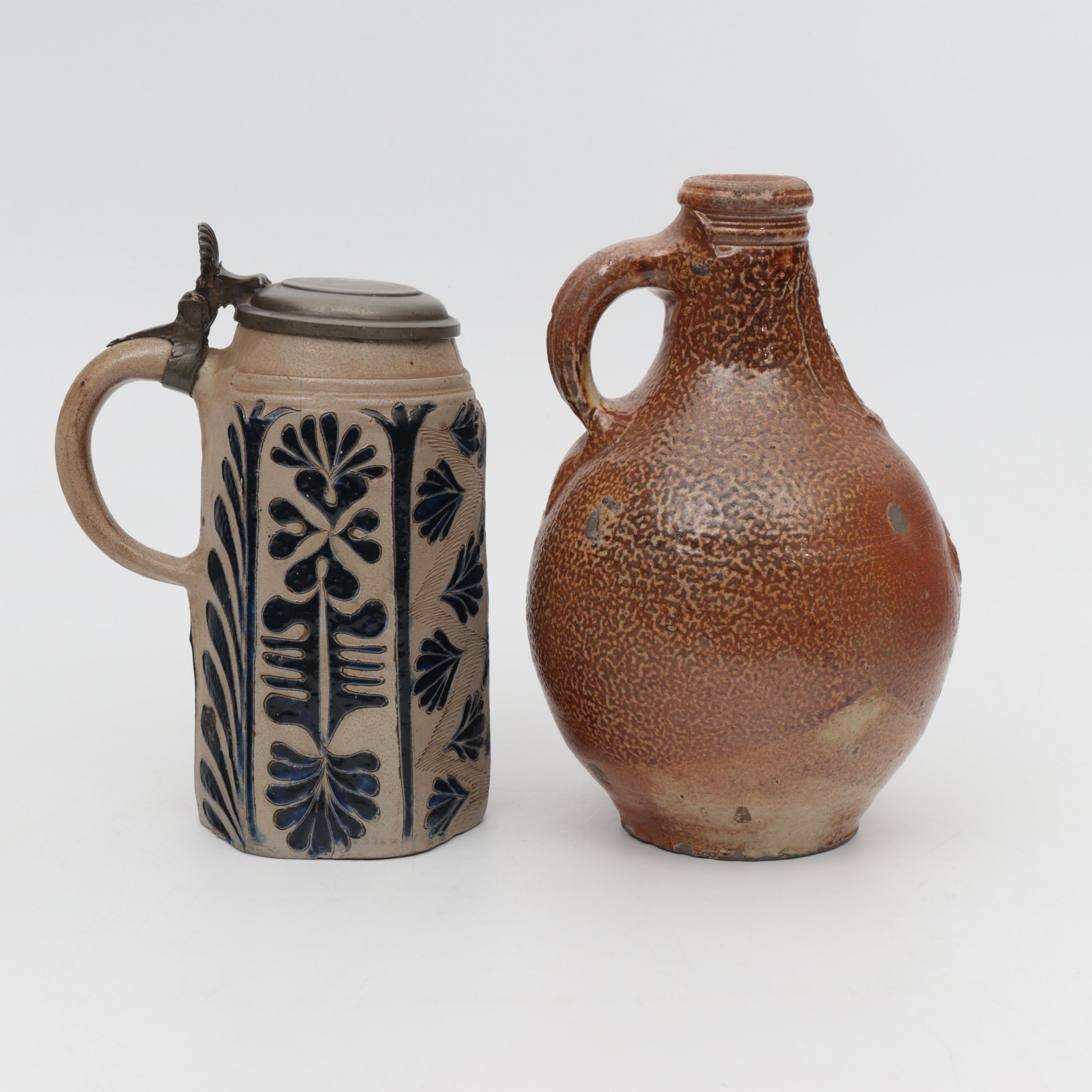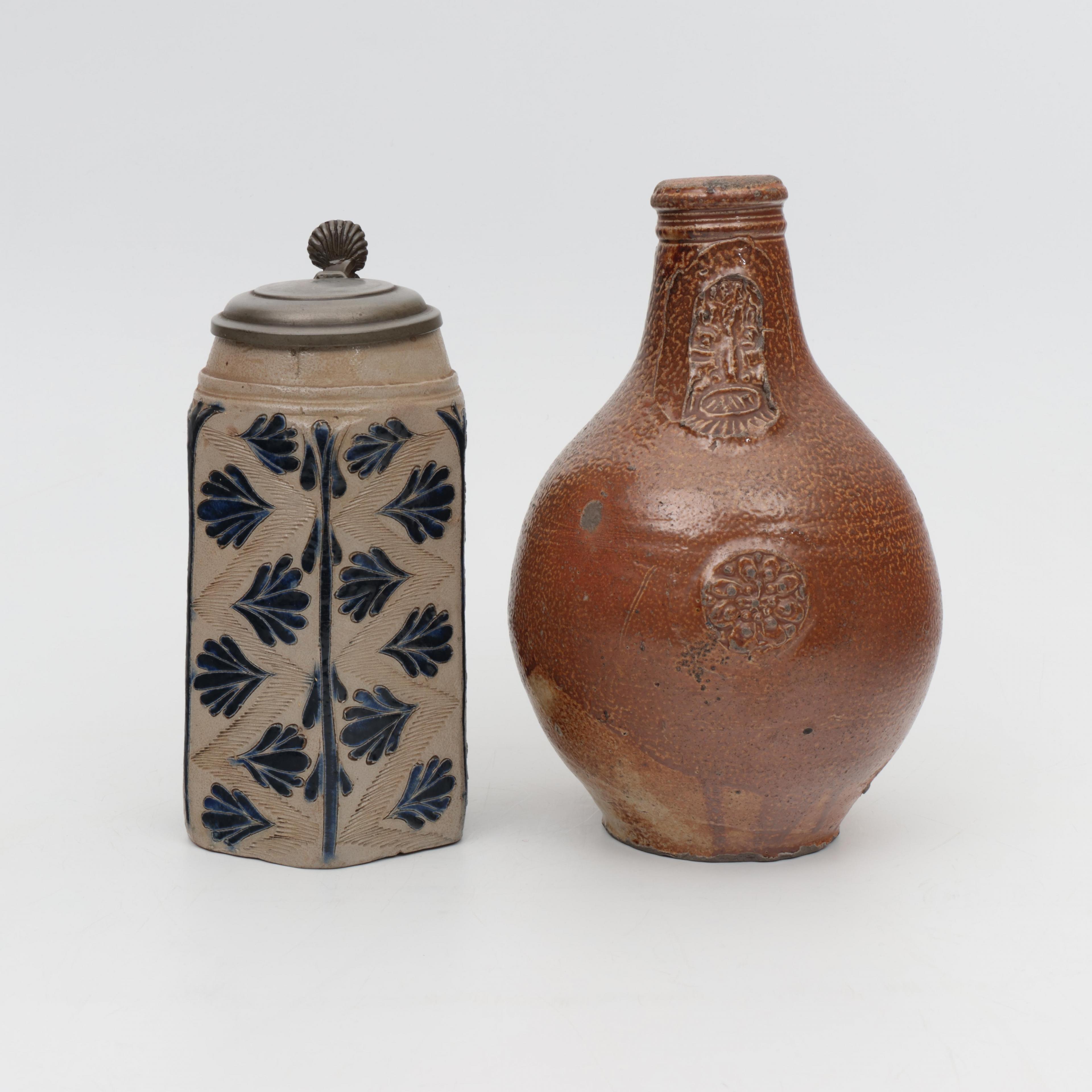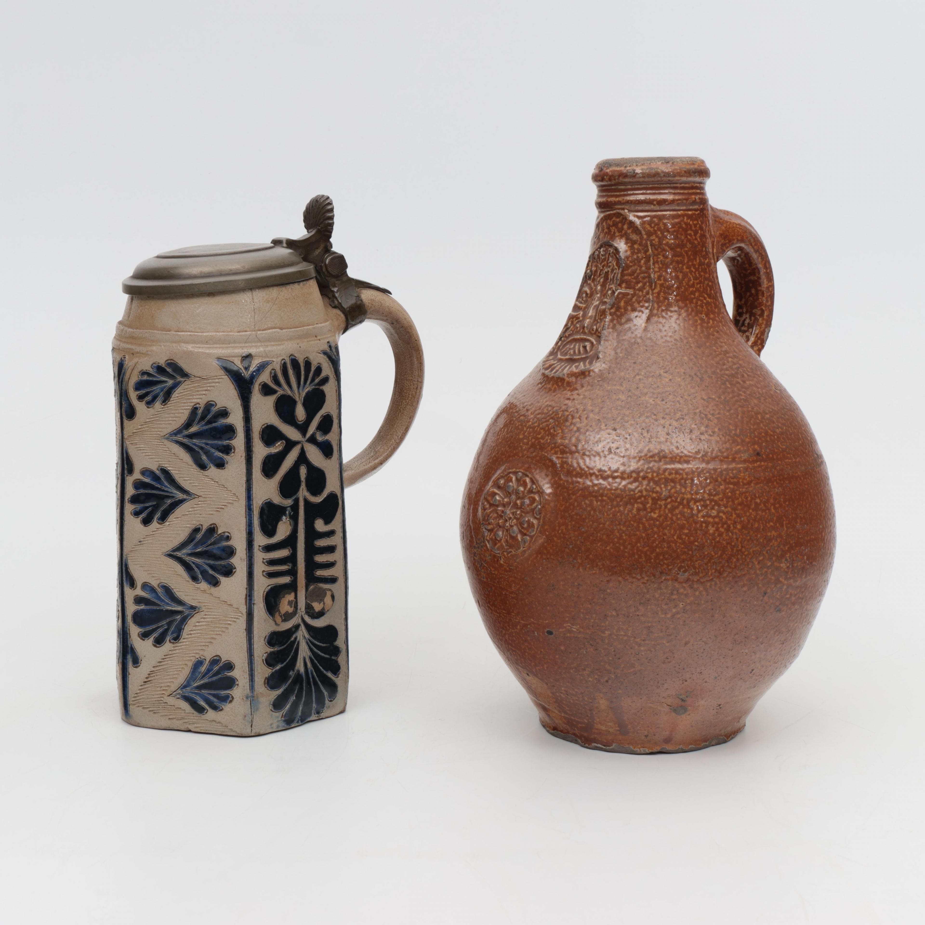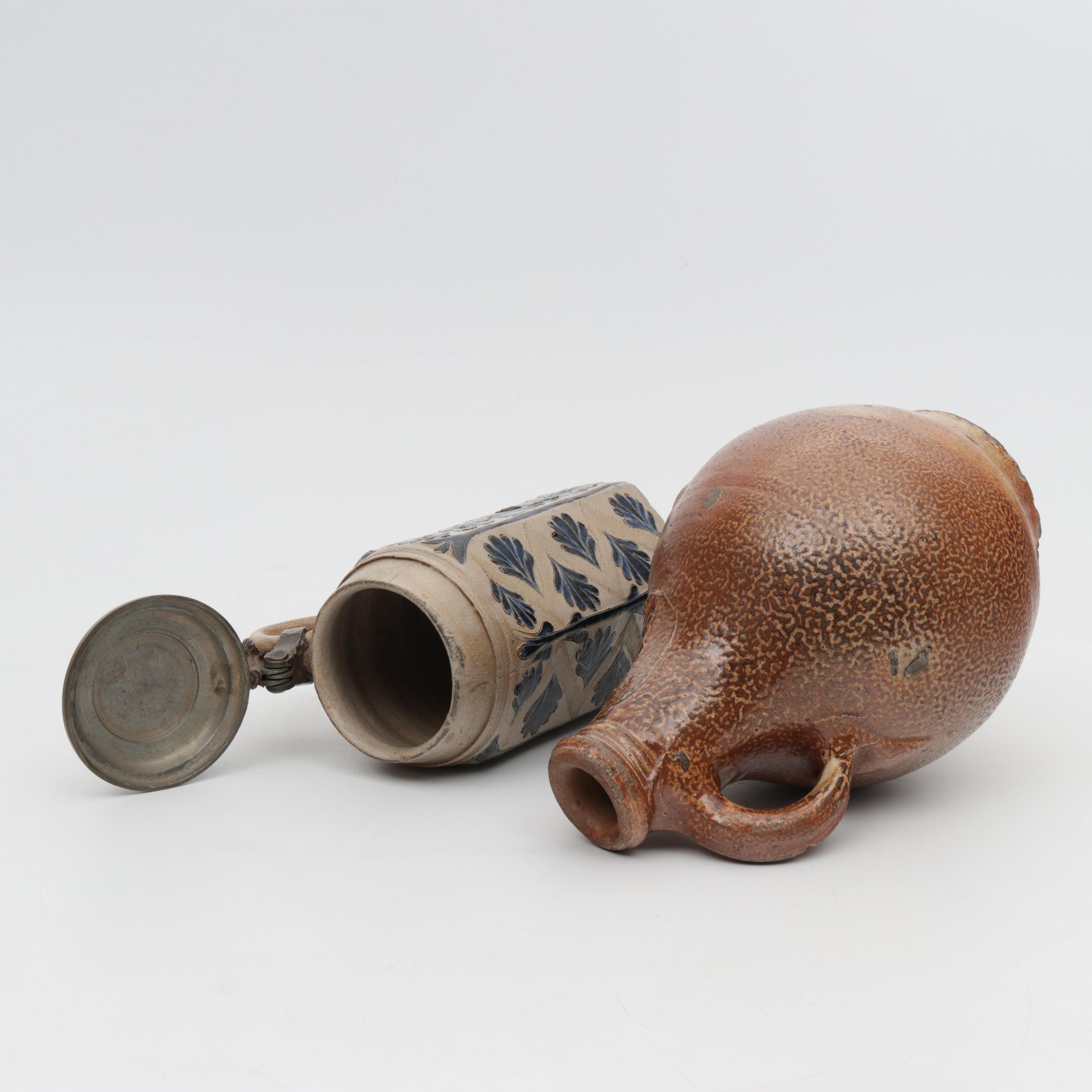 Duitsland, bruin steengoed baardmankruikje en blauw-grijs pul met tinnen deksel, 18e eeuw