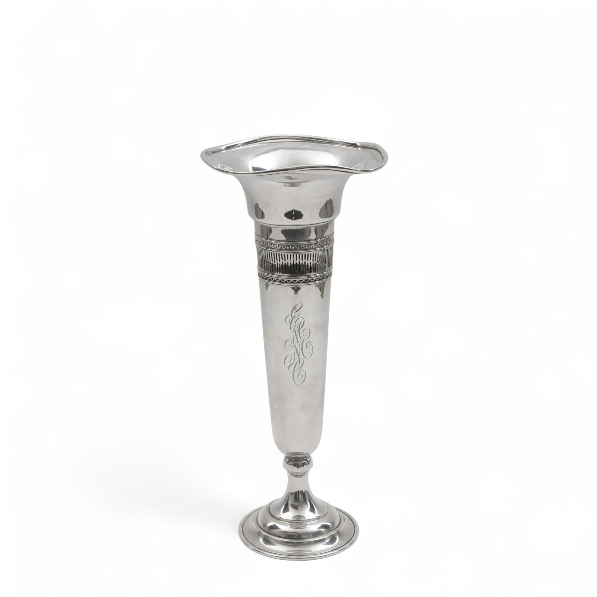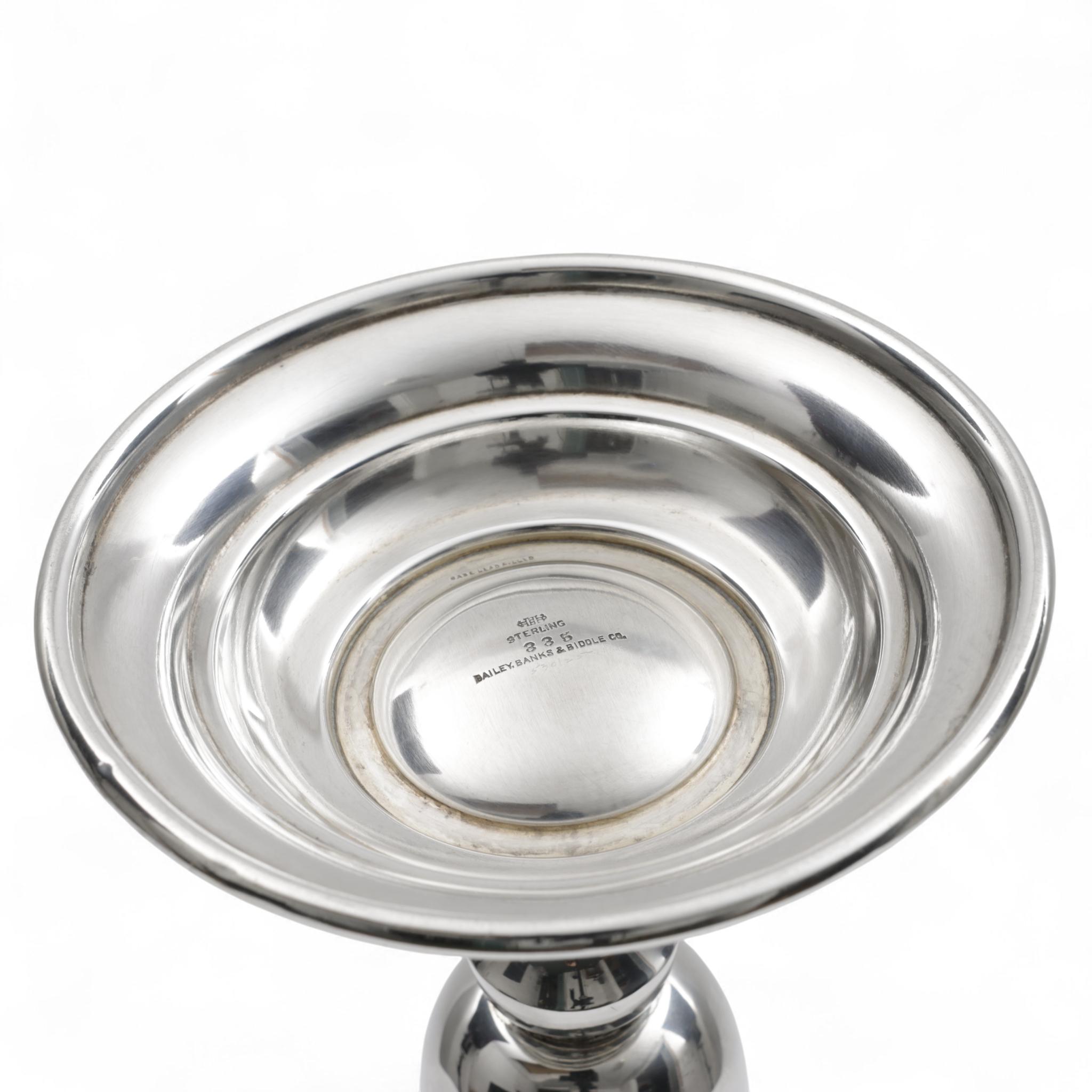 kelkvormig model met lettergravure op ronde hoge voet, ajourrand met geometrische motieven, mt. Bailey Banks & Biddle Co.(BB&B) Philadelphia, onduidelijke keur, 1e gehalte,