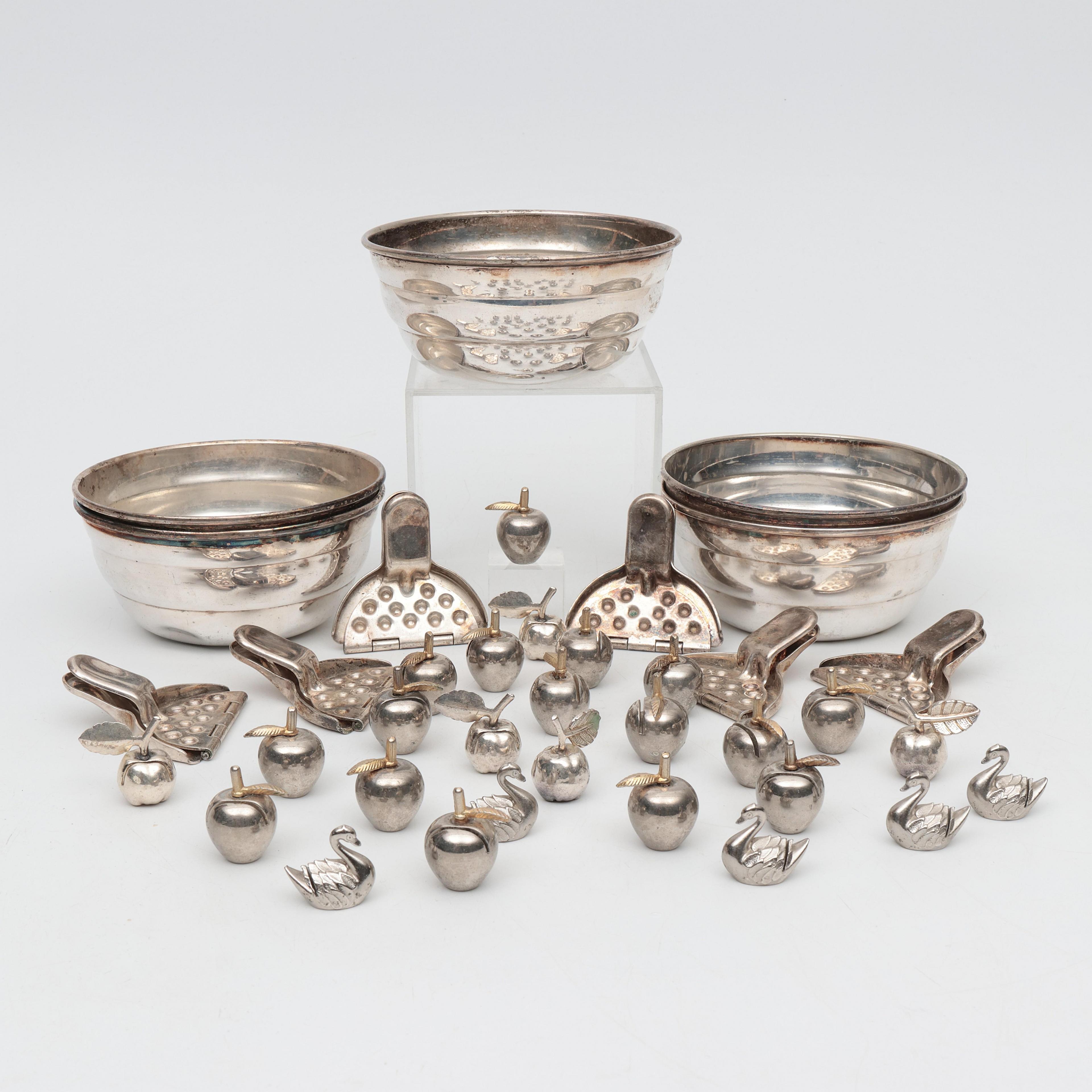 w.o. schalen en tafelnummerhouders in de vorm van appeltjes. Hierbij set verguld visbestek in groene cassette.