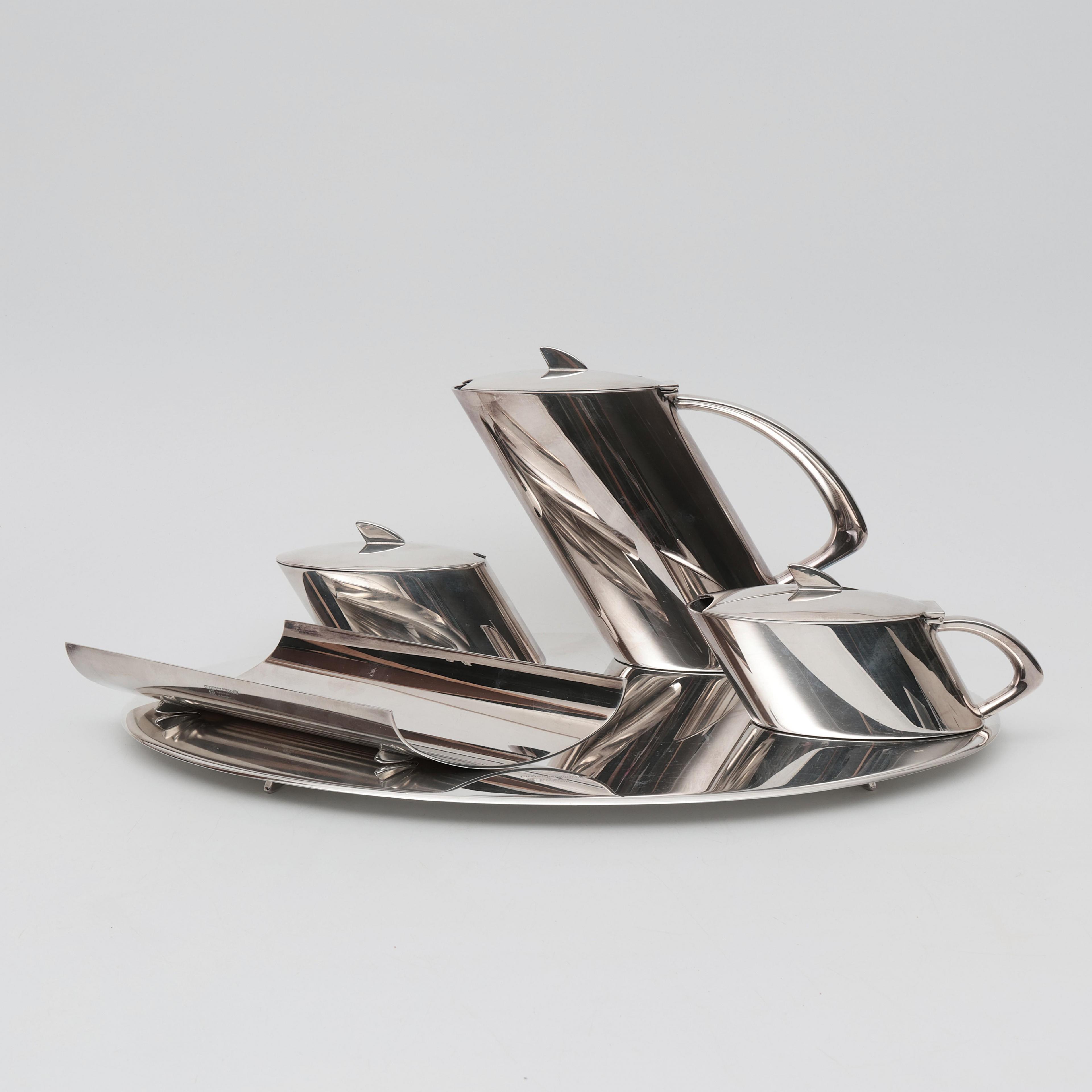 Bestaande uit koffiepot, melkkan, suikerpot, schaal en dienblad.