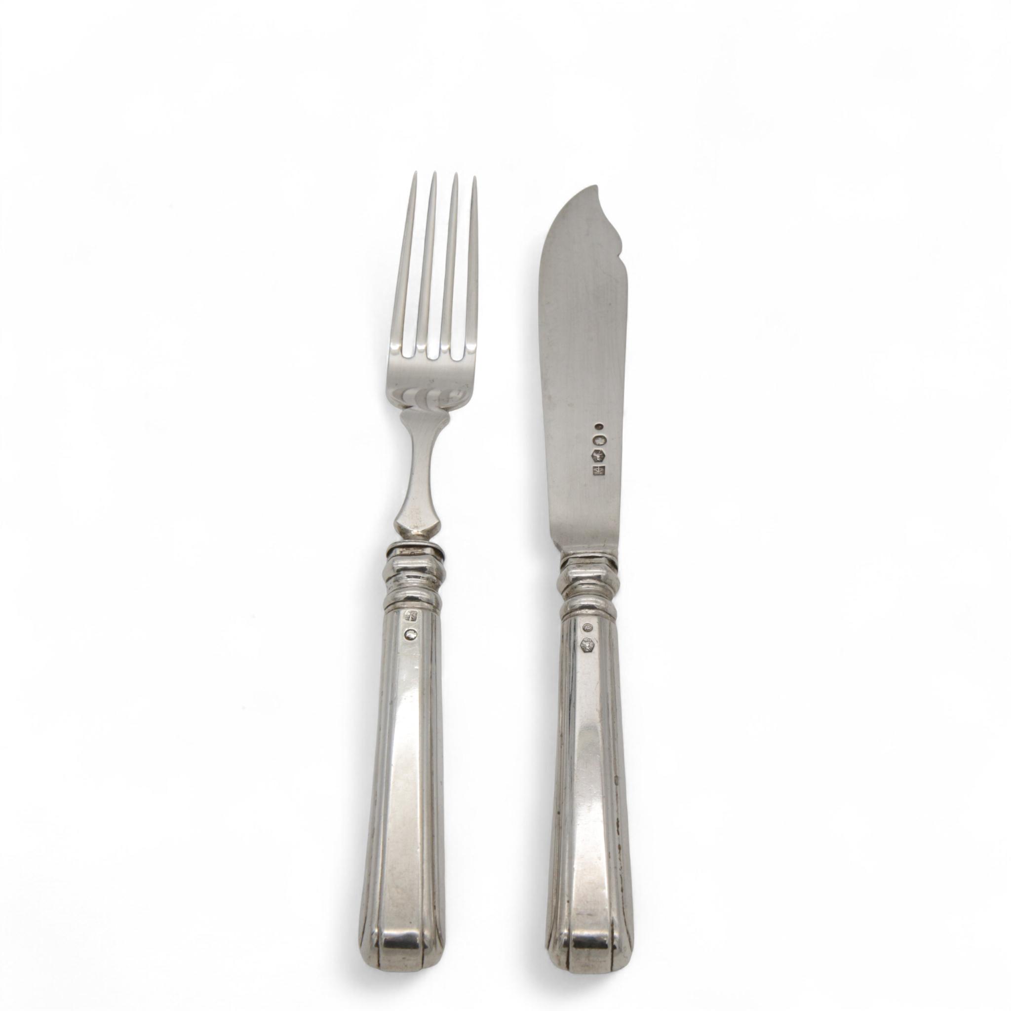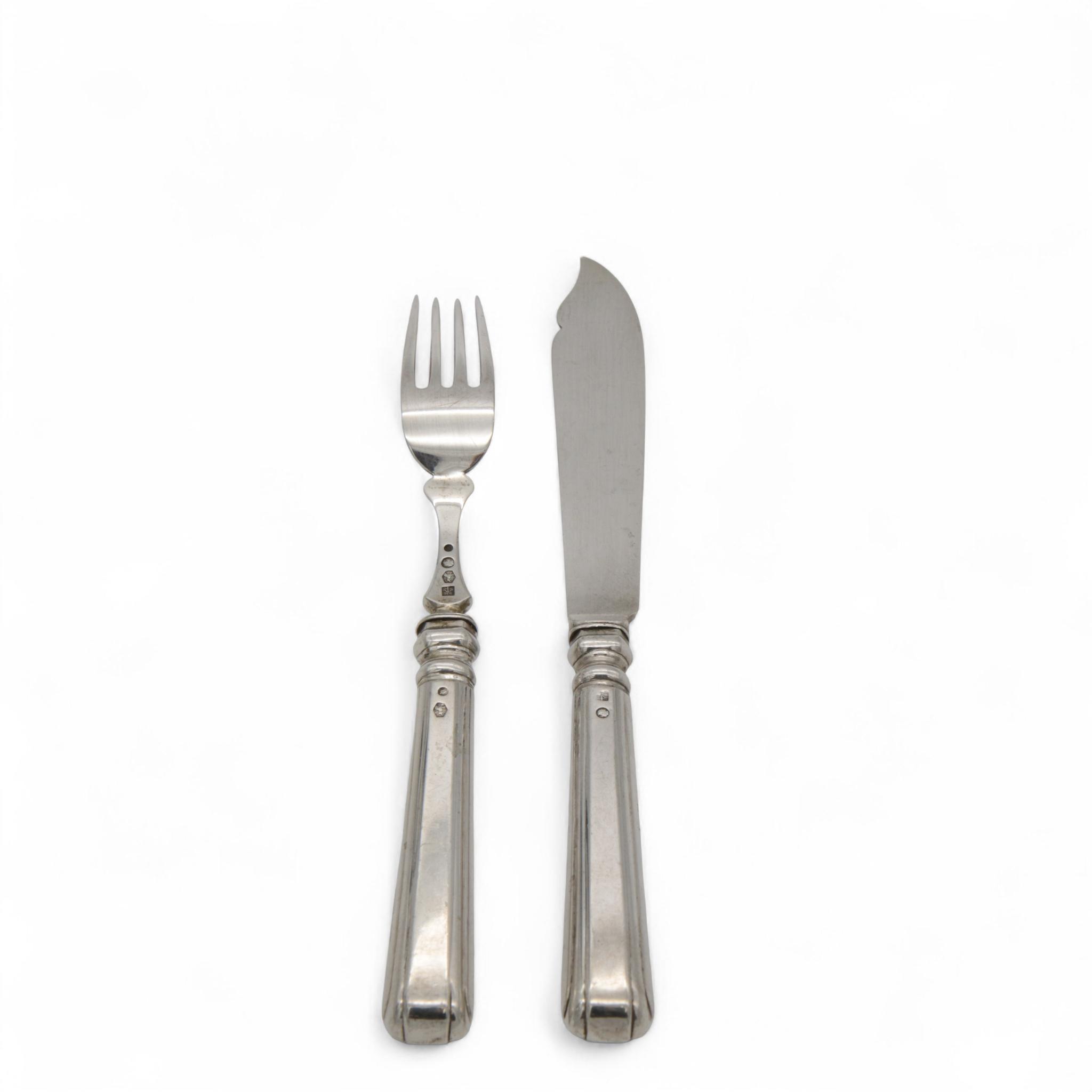 met geribd en afgeronde heften en zilveren lemmets, mt. Fa. Bonebakker Jzn. Amsterdam 1906 en één mes 1916, 2e gehalte, in eikenhouten cassette met slot en sleutel,