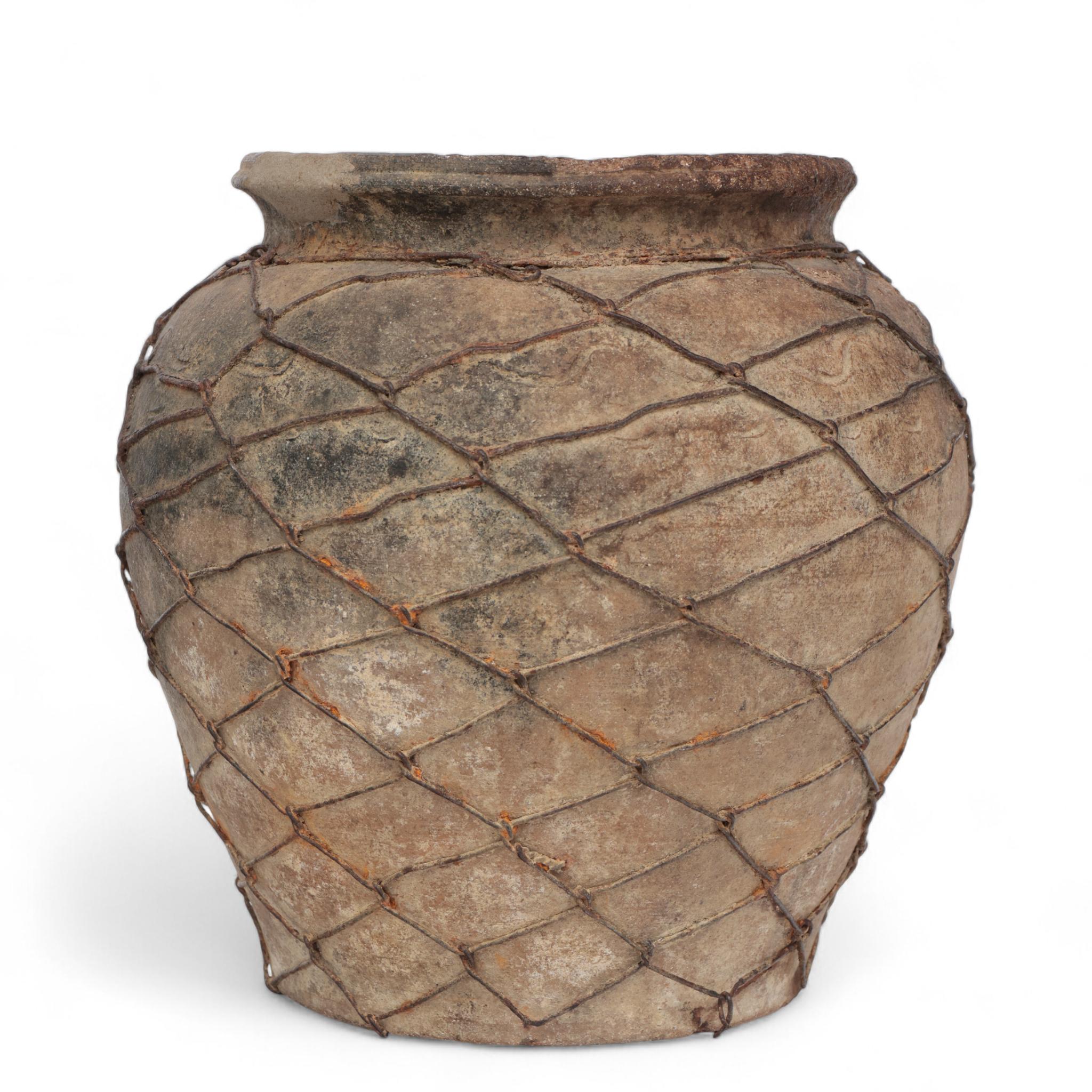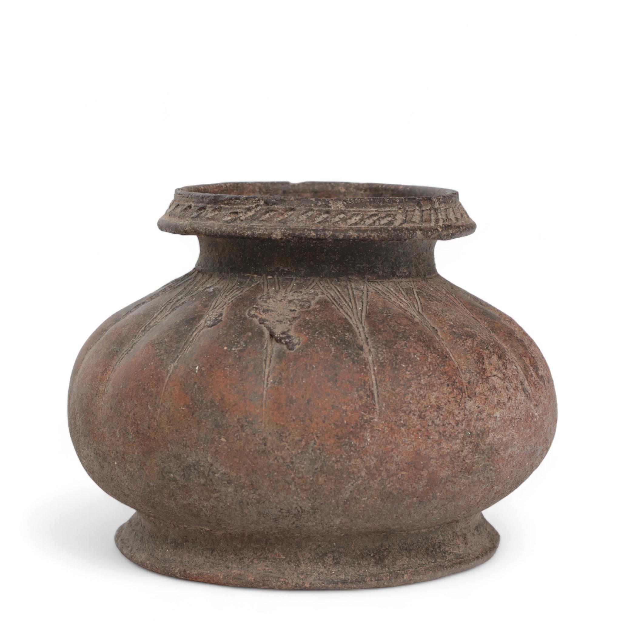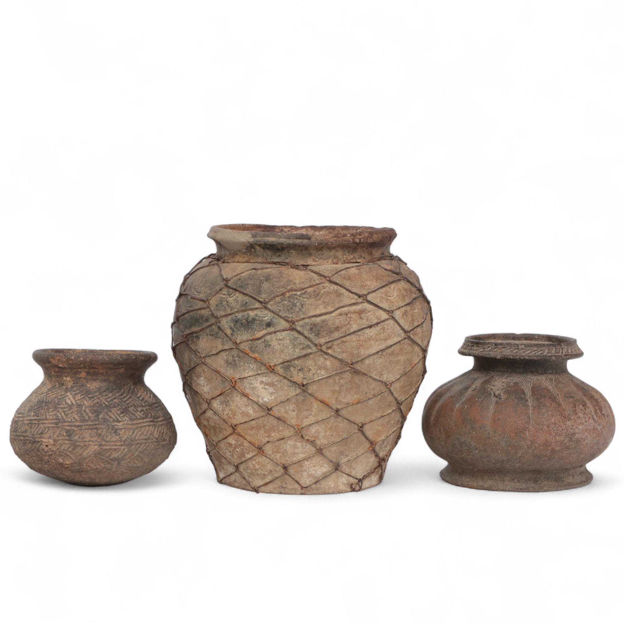 Indonesian antique globular pot, a Spanish antique pot with metal binding and an antique archaic pot with engraved line decor.