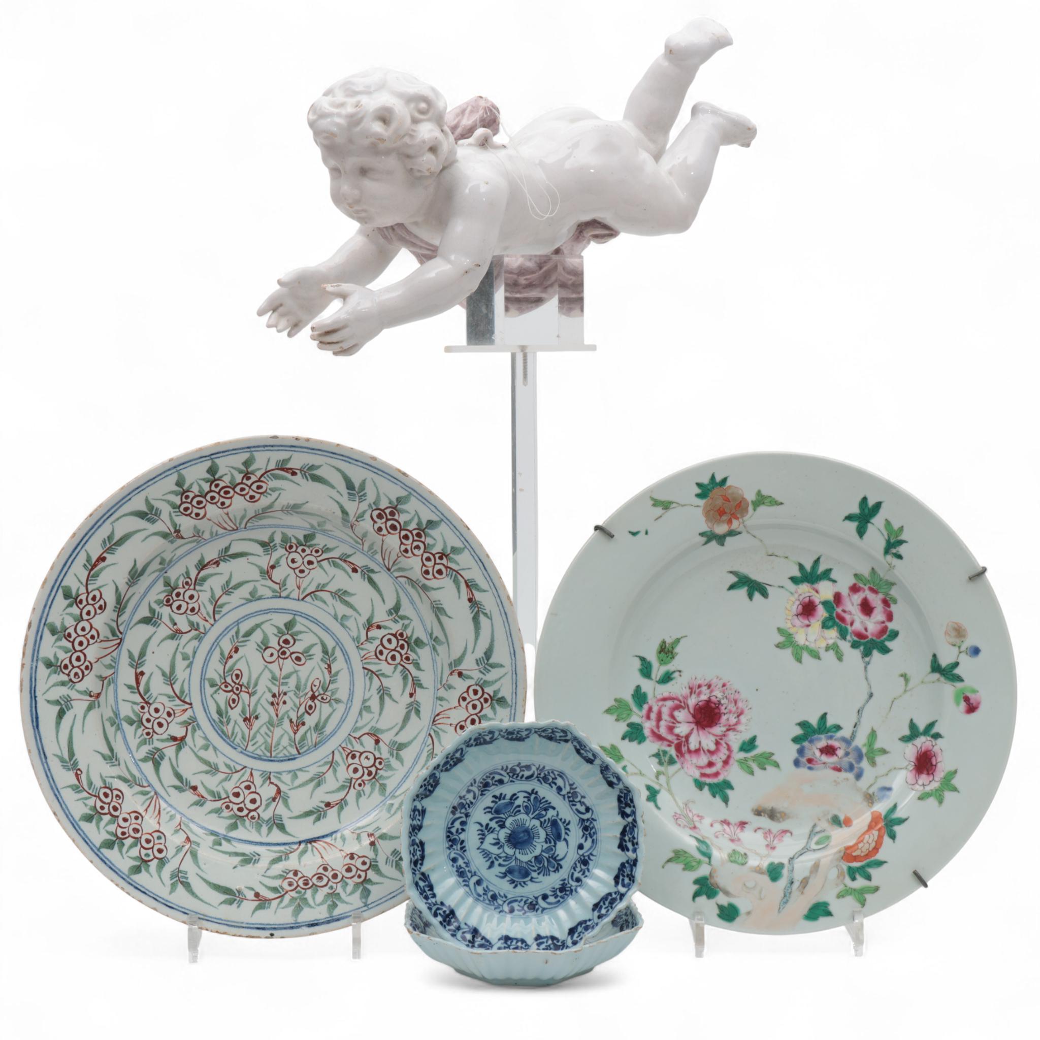 Delft, aardewerk grote schotel, twee kantige schoteltjes en China, een famile rose schotel, Qianlong,
