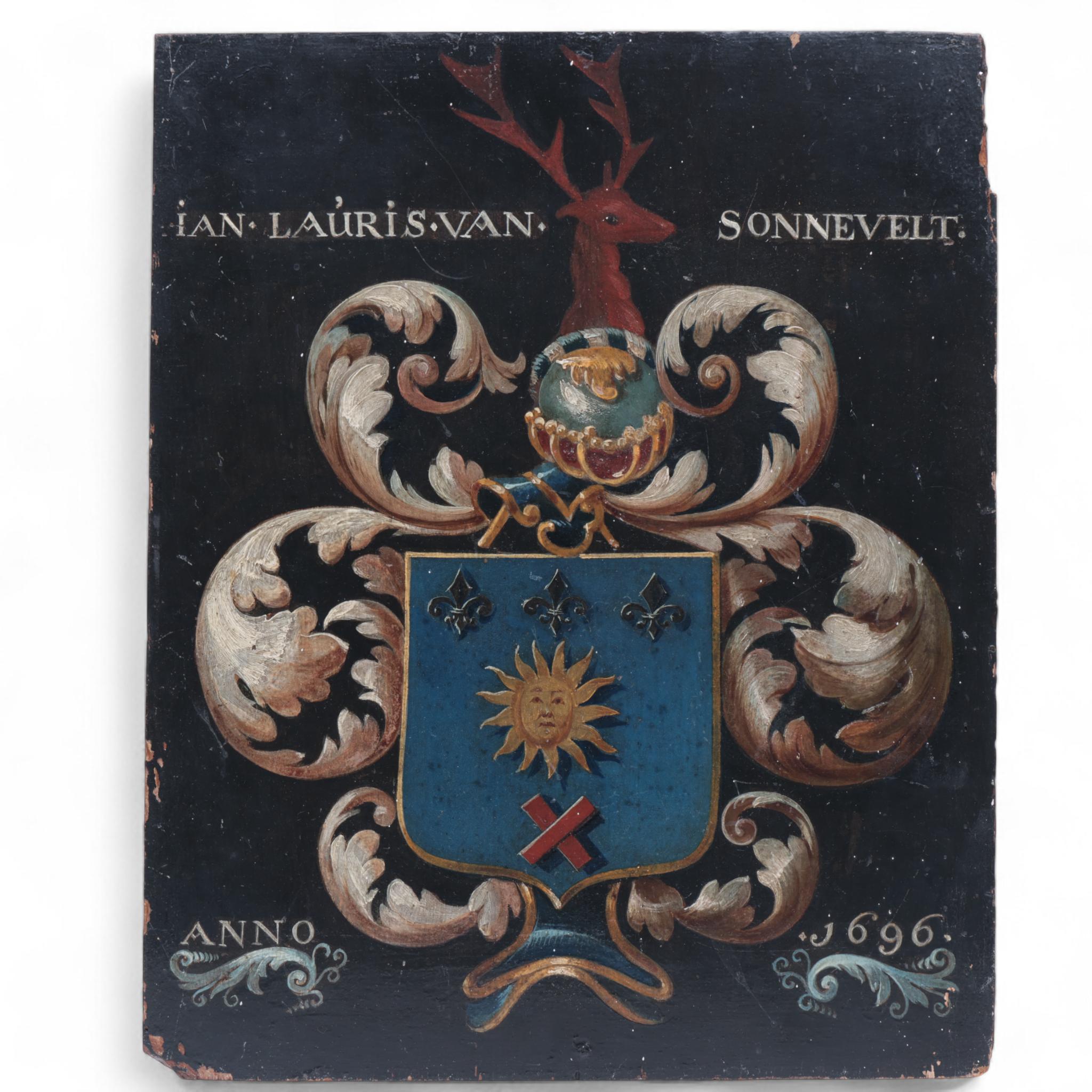 Houten paneel met geschilderde heraldische wapen, anno 1696;