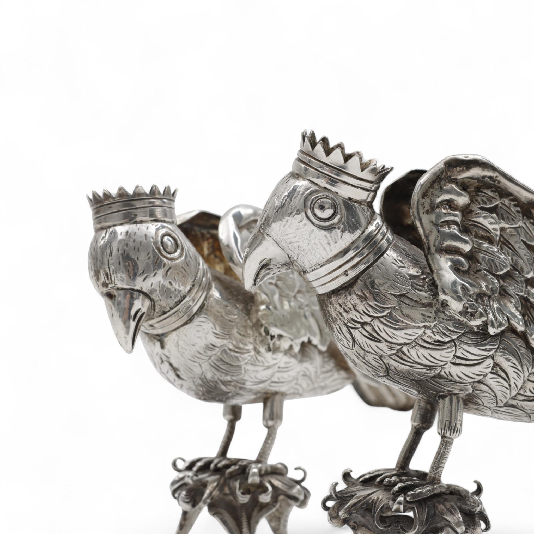 de vogels staand op drie potige standaard versierd met takjes, op het hoofd een afschroefbaar kroontje, gemerkt V buitenlandse werken 1906-1953 en ZII, 2e gehalte. Schuttersvogels zijn onderdeel van de traditie van Gilden en Schutterijen in Nederland, België en Duitsland.