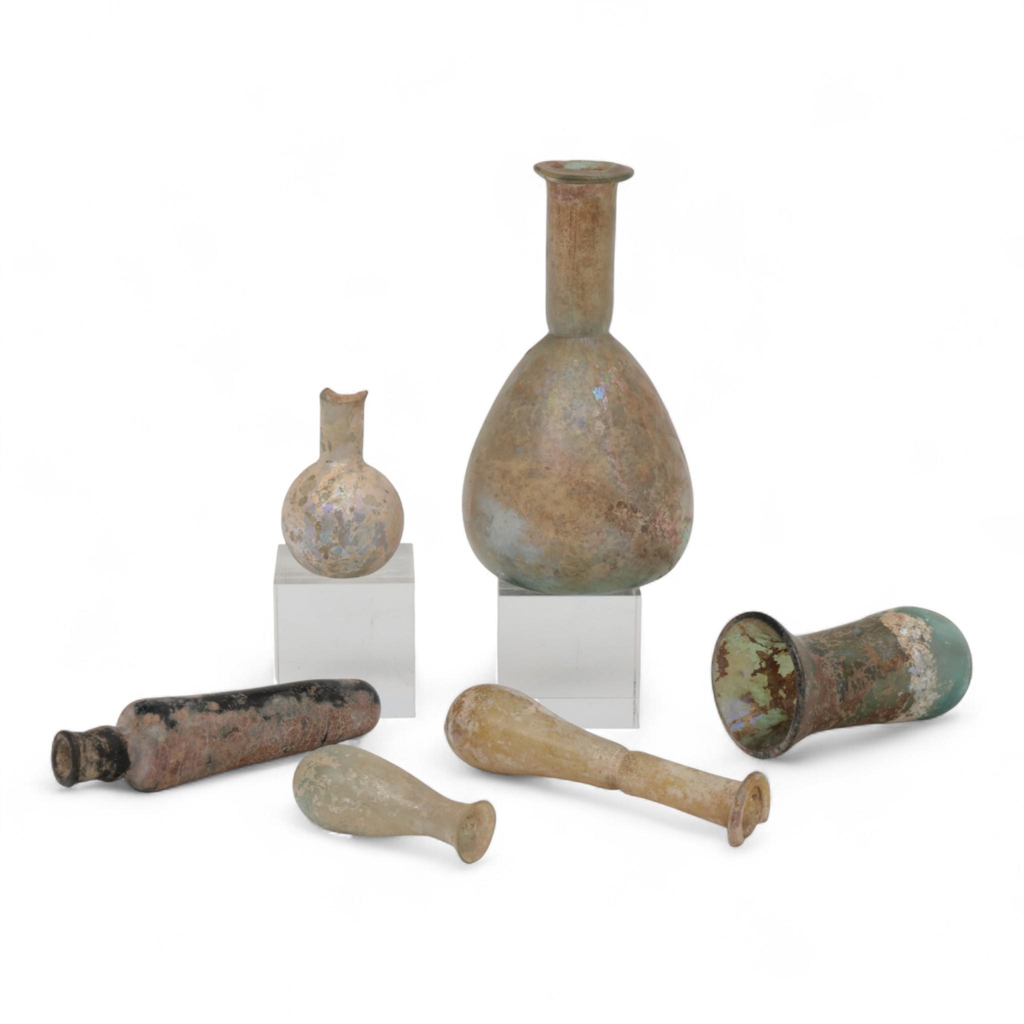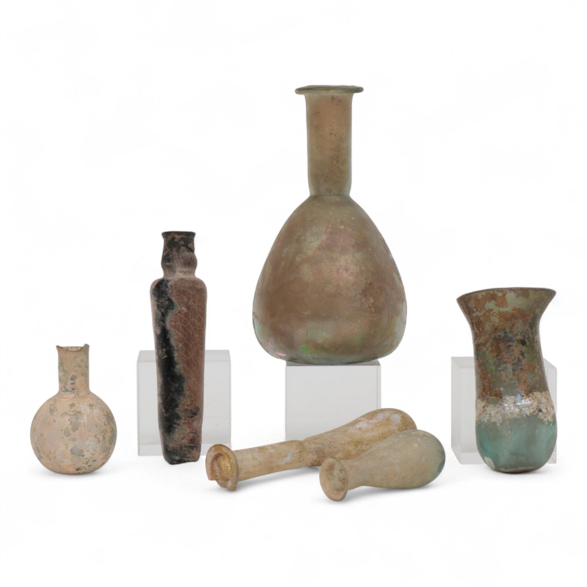 A collection of six various Roman glass bottles, ca. 3rd century AD;