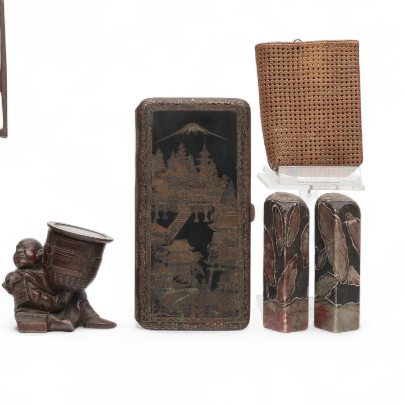 comprising a gilt-lacquered cigarette case, a small censer and cover shaped as a karako holding a basket and a par of soapstone and metal-decorated seals