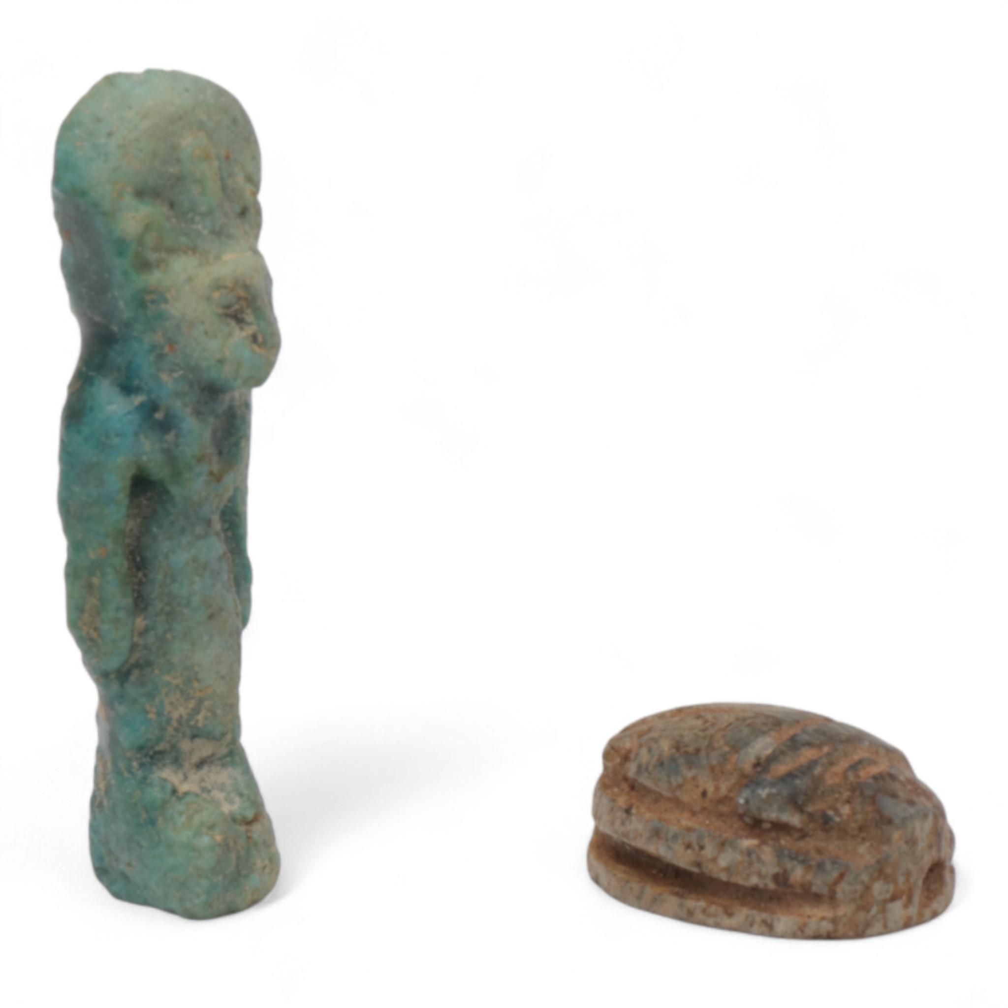 four Roman glass objects,3rd century; An Egyptian faicence amulet and scarab, Late Period and three antique terracotta miniature vases.