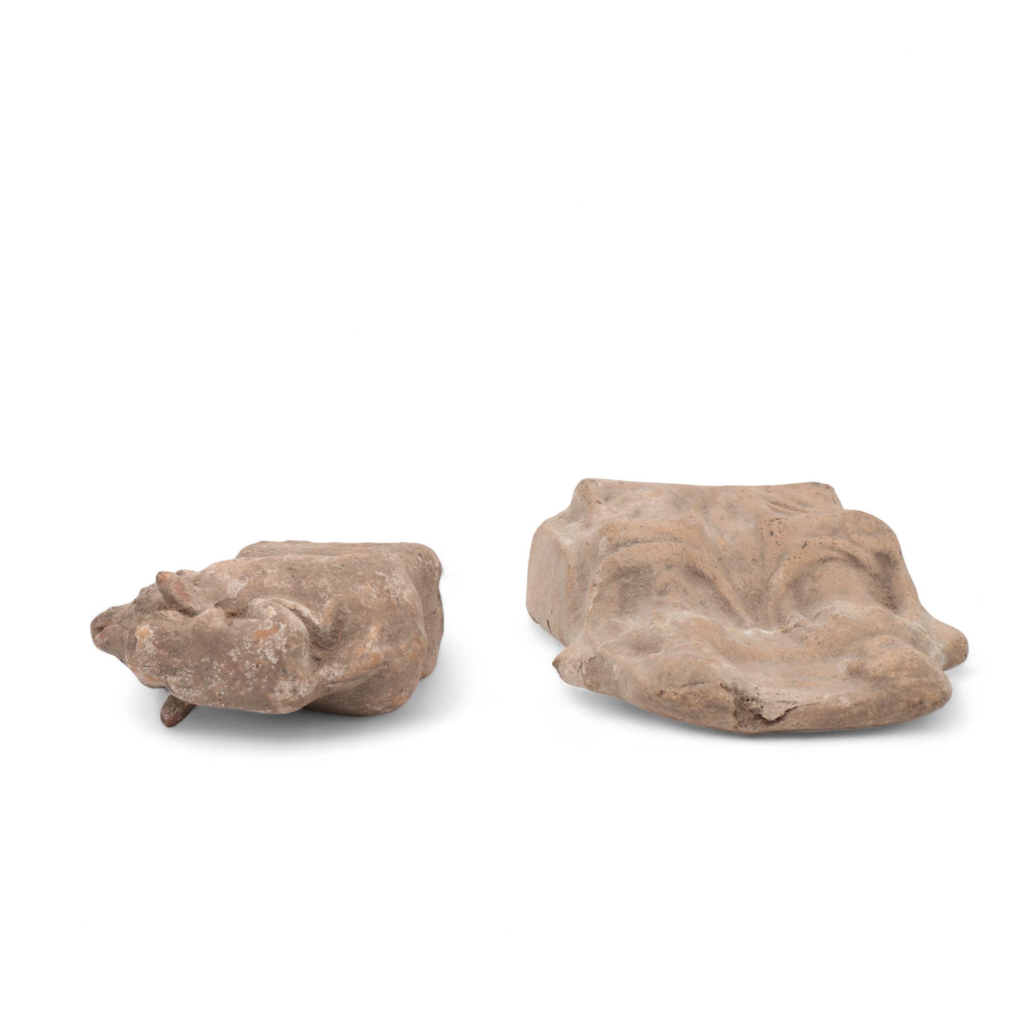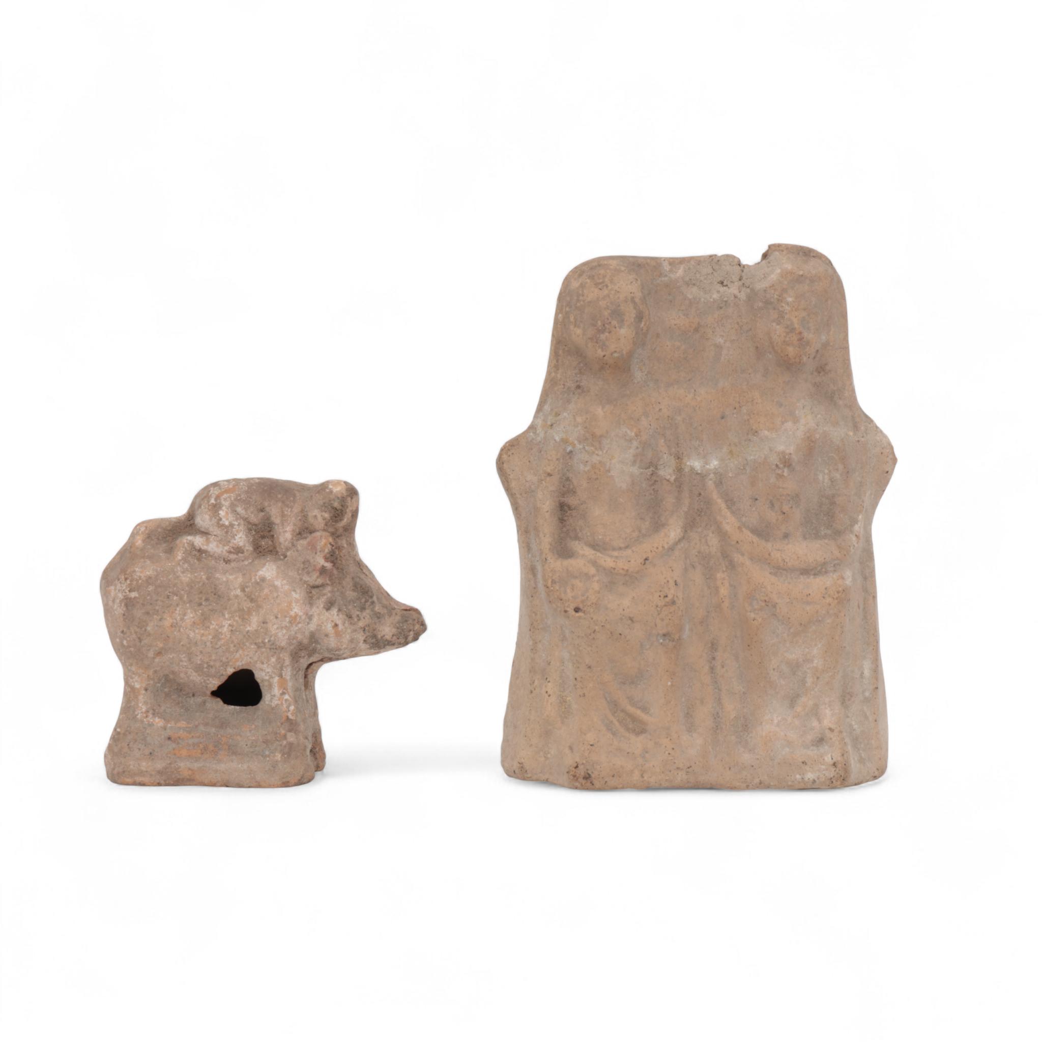 A Roman terracotta figure group of a figure lying on top of a pig and a terracotta sculpture of two seated female figures, ca. 3rd century AD;