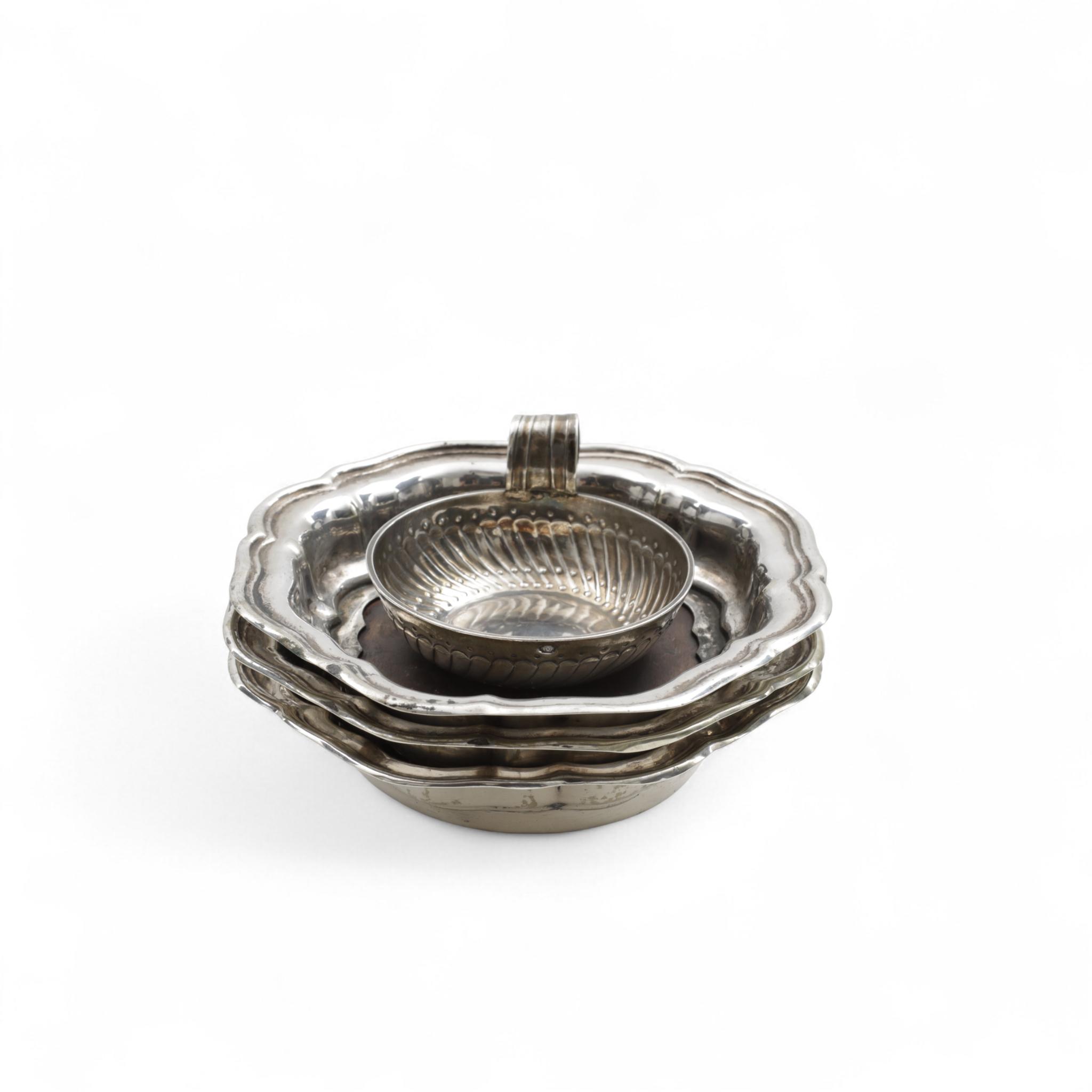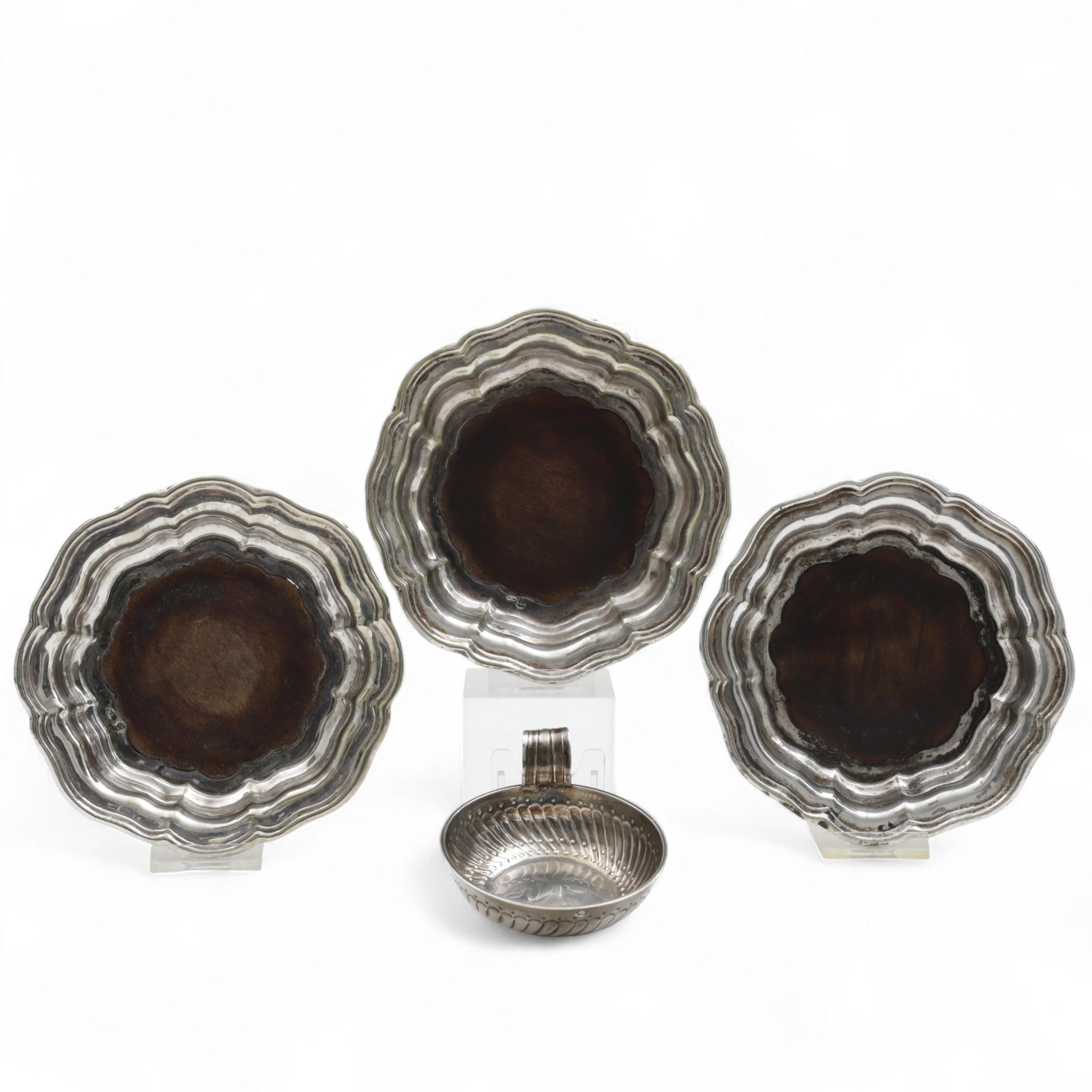 rond met golvende rand en houten bak, mt. Berliner Metallwarenfabrik H. A. Jürst & Co AG, met gelobde motieven en rond oor, de tastevin meester- of winkelierteken VB 1814-1831, 1e gehalte,