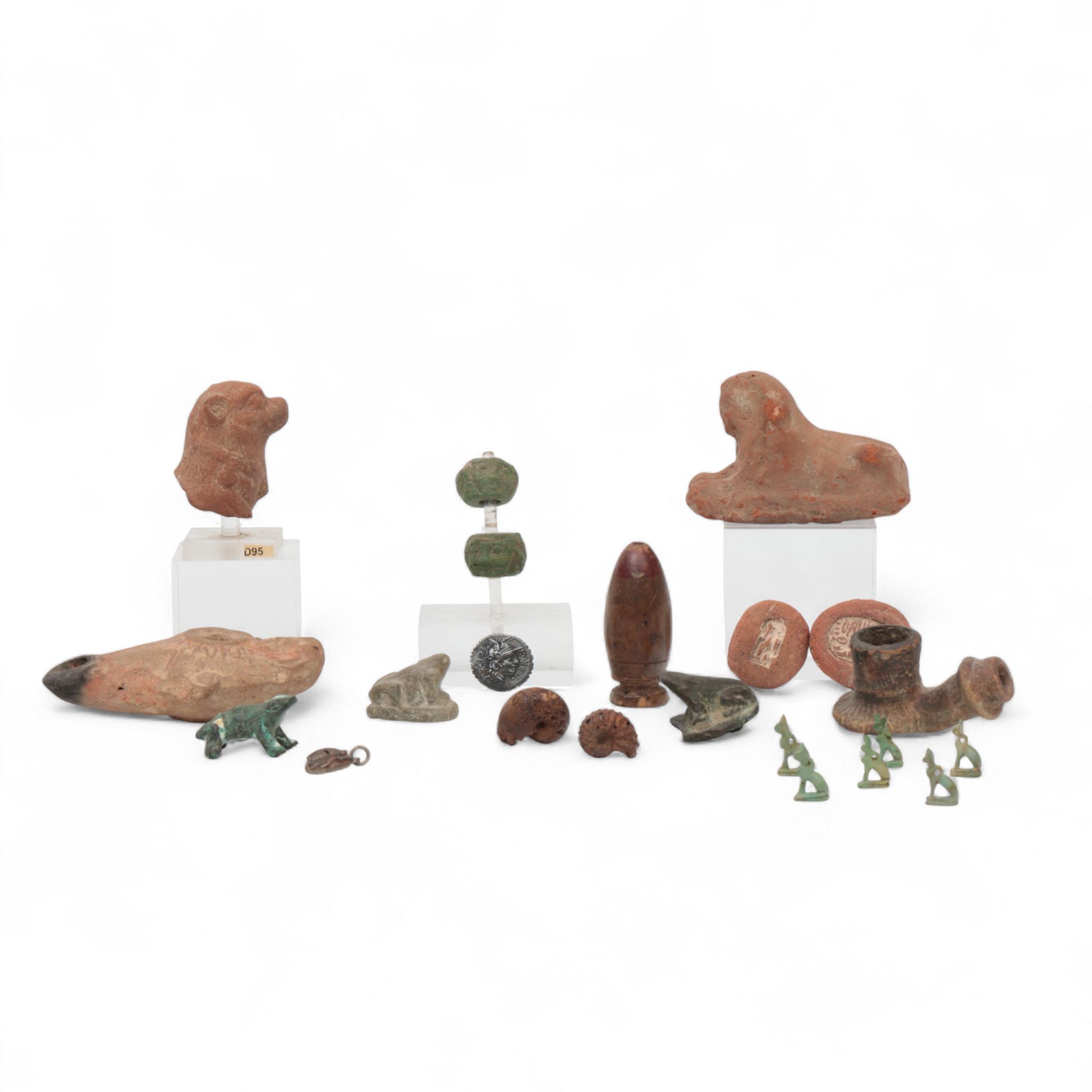 Egypt, a terracotta statue of a miniatur sphinx, a head of a bear and an oillamp, ca. 3rd century AD.