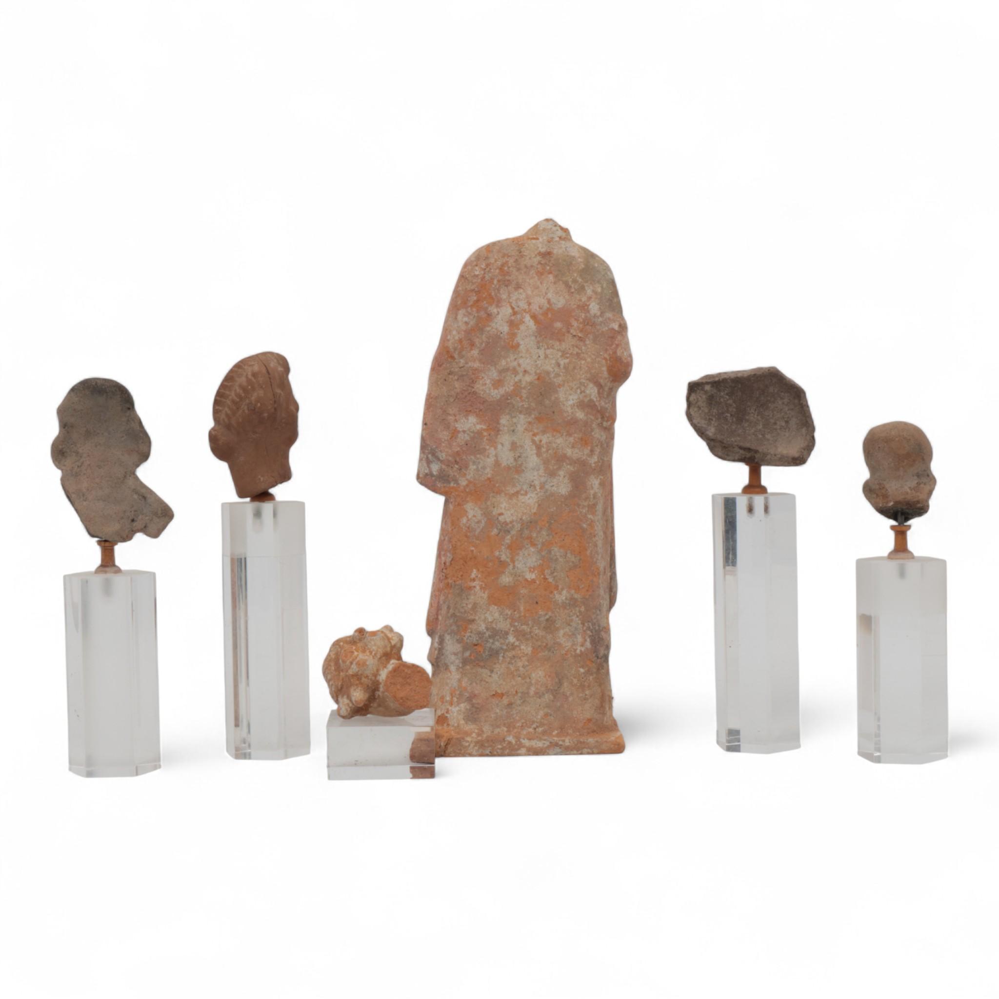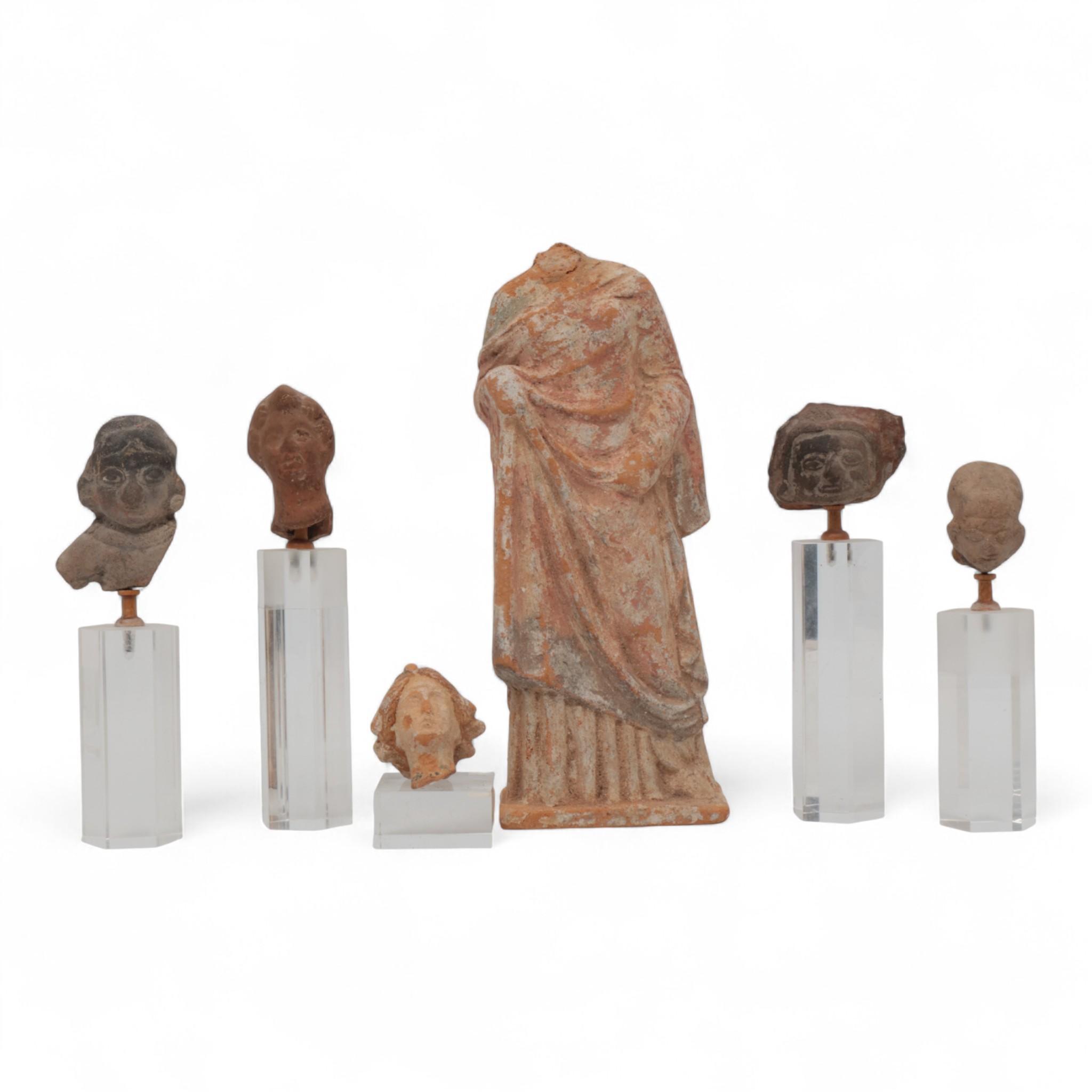Three Roman terracotta jars, ca. 3rd century (damaged) and four antique terracotta heads.