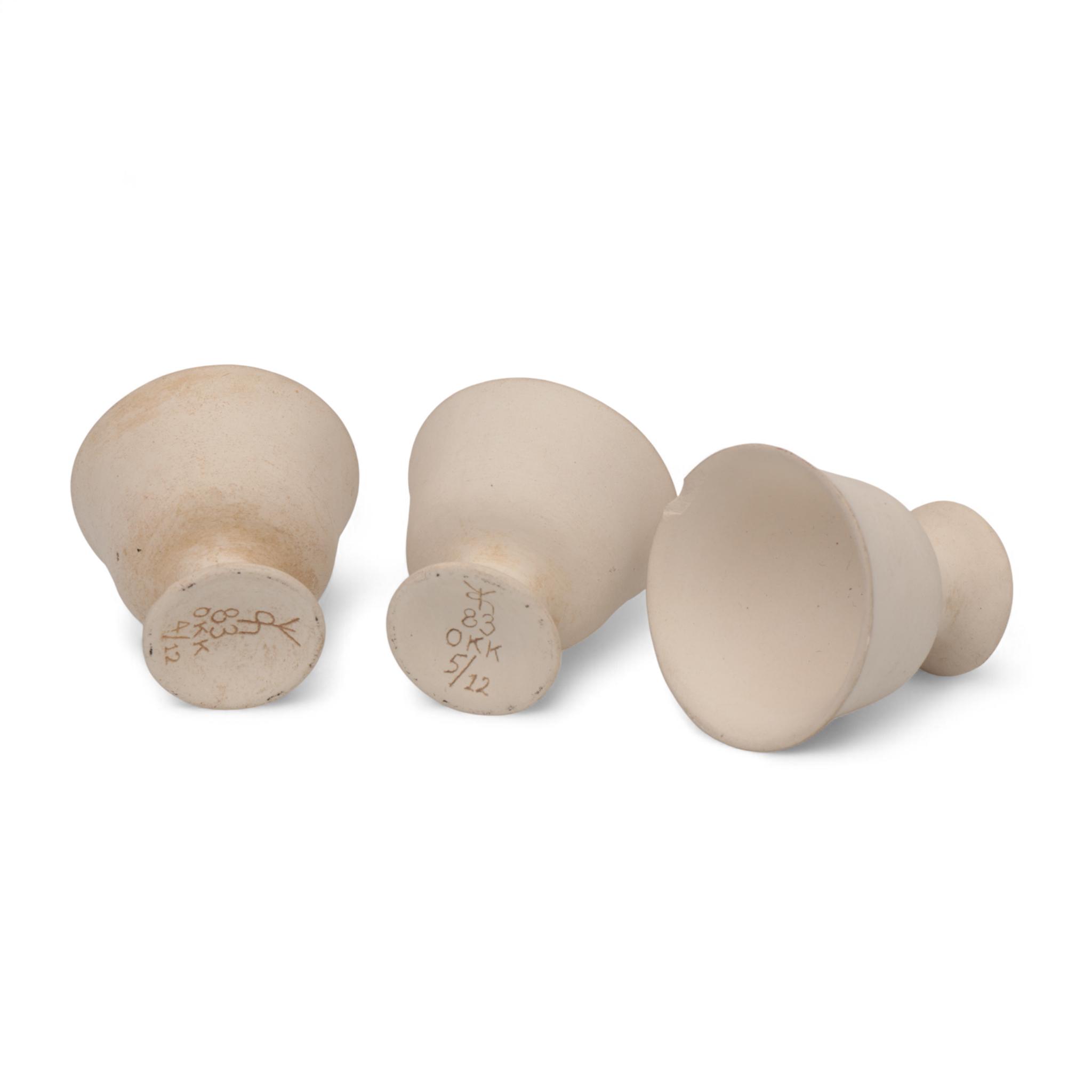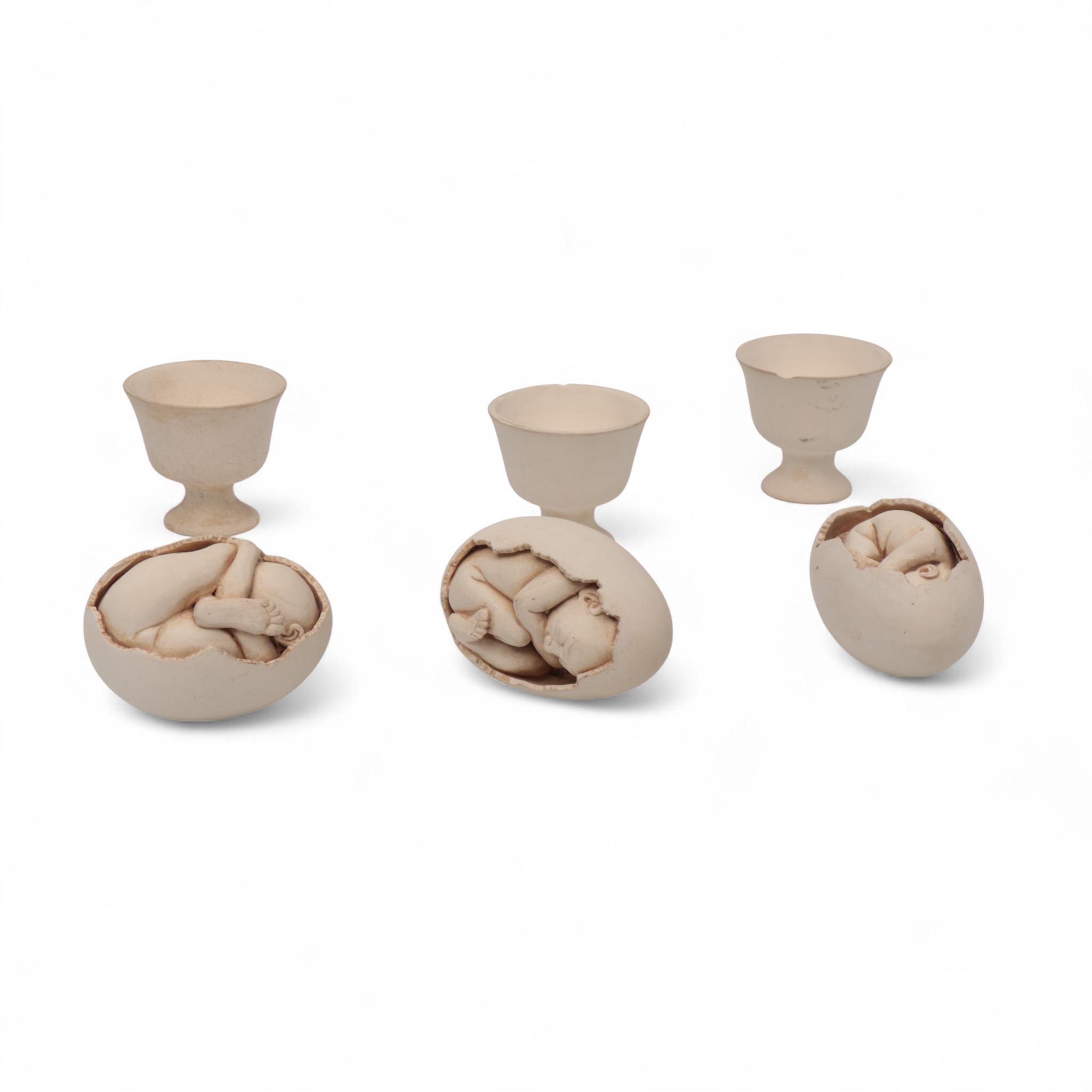 Vincent Dame (1946-1995), drie keramische beeldjes. (Eén eierdopje heeft een chip)