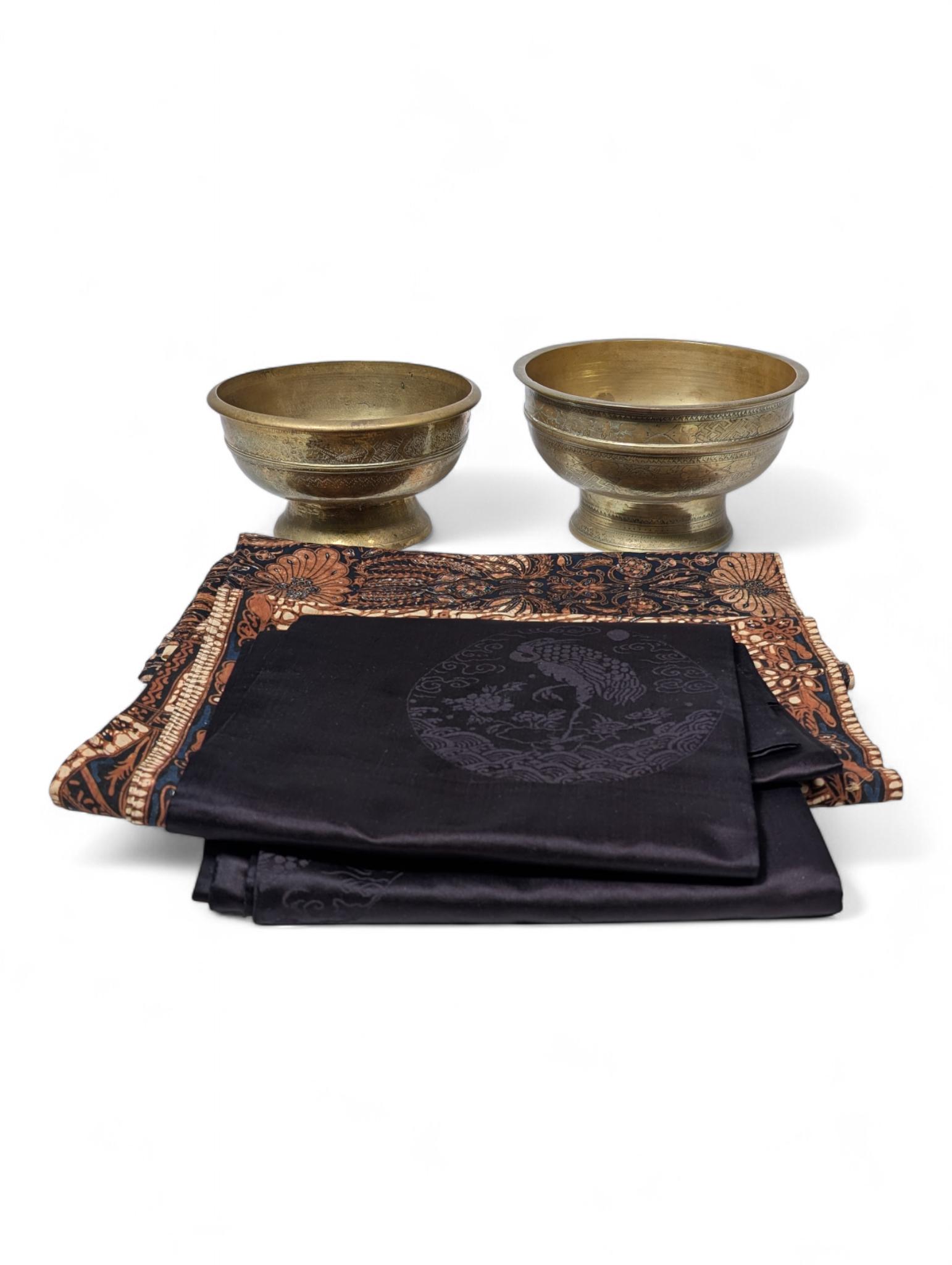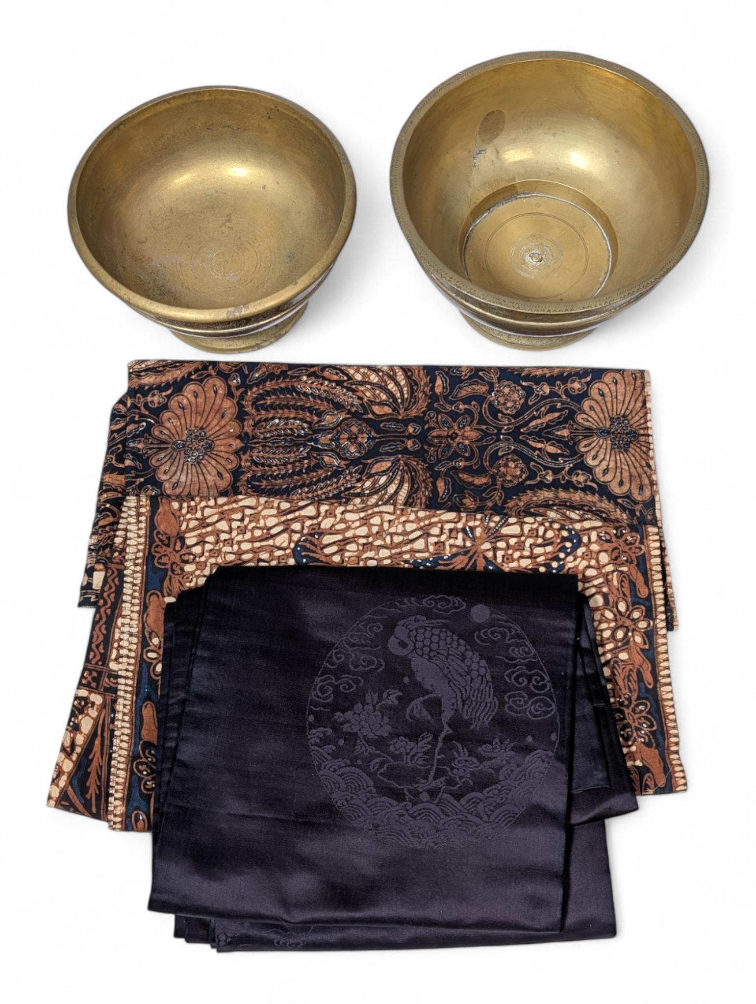 Java, two batik cloth fragments, Japan, deep blue silk obi and Java, two brass ceremonial bowls.