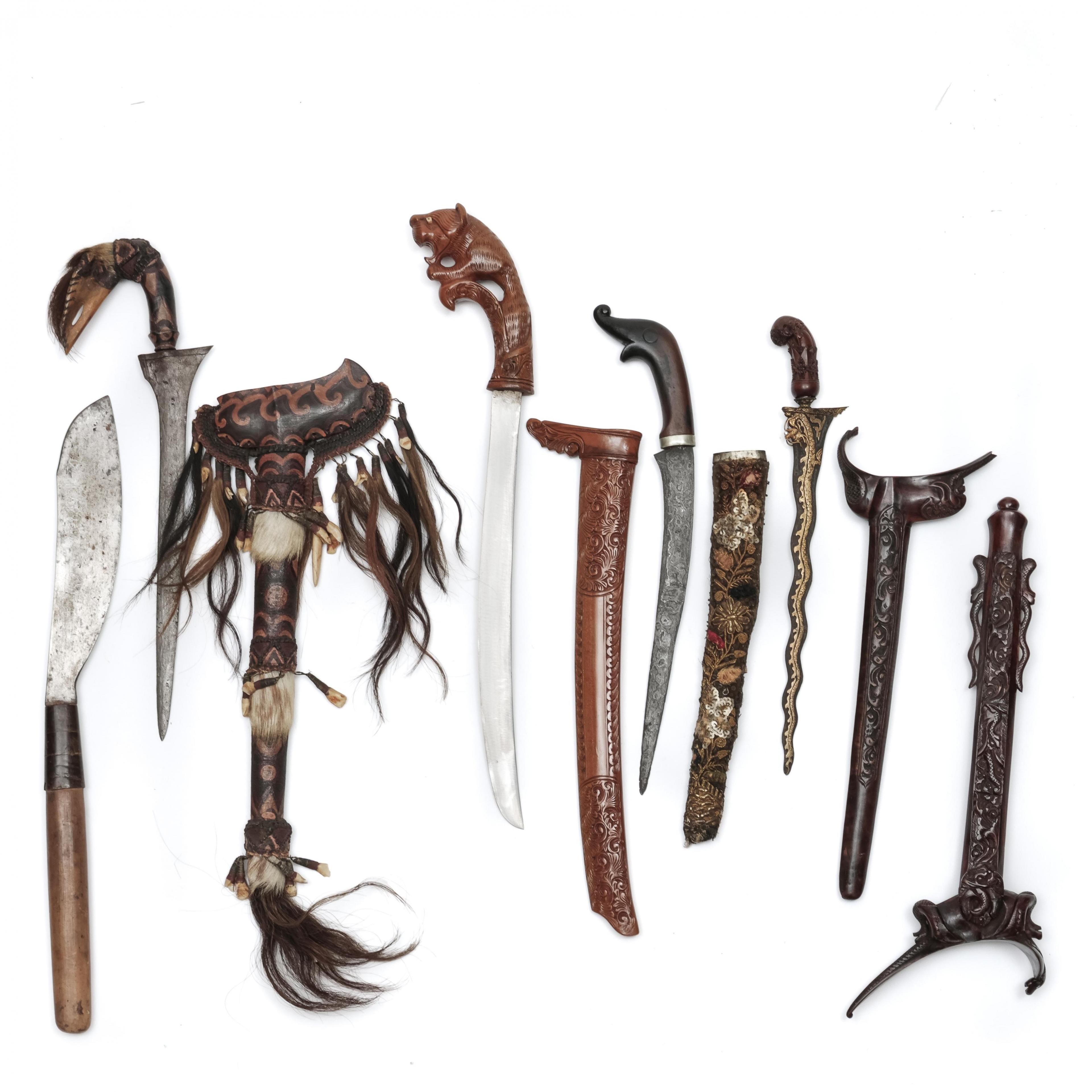 A collection of four Indonesian krisses, a kris sheath and a hoe.