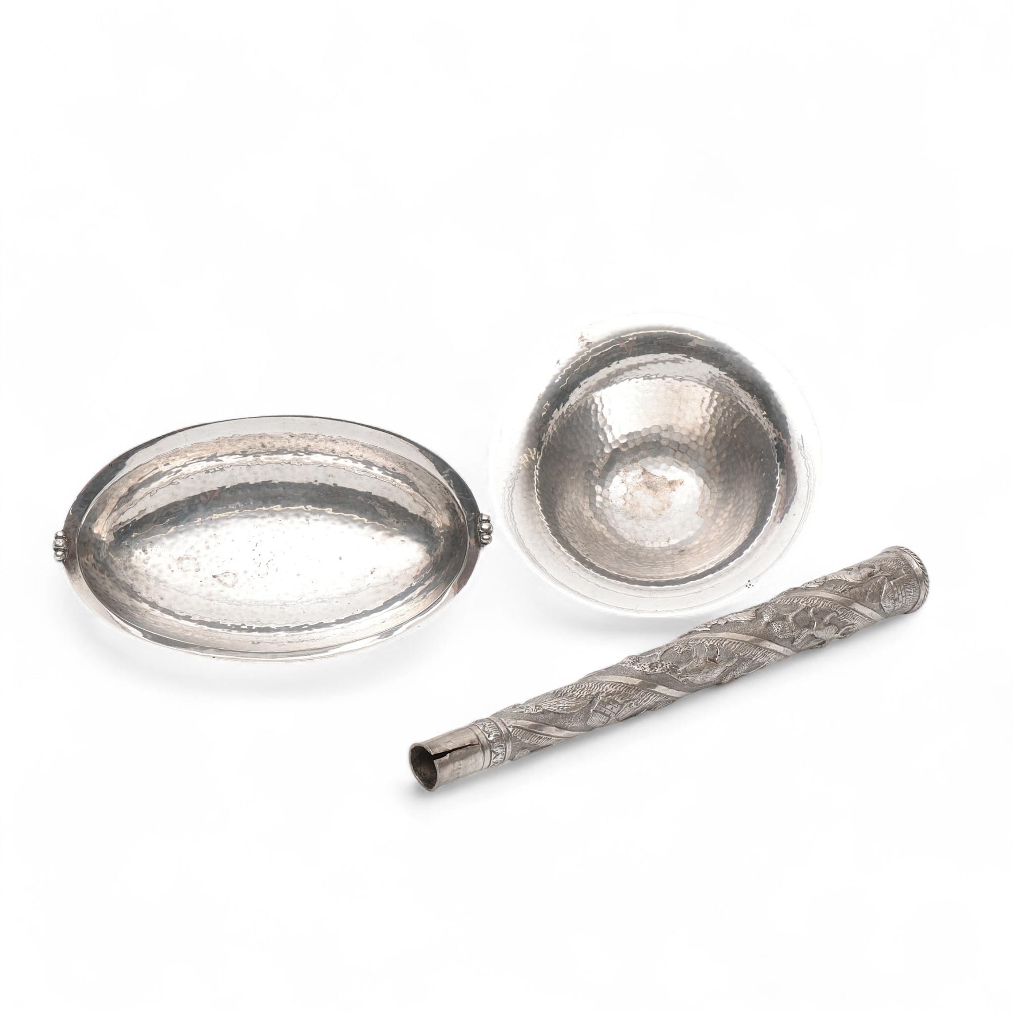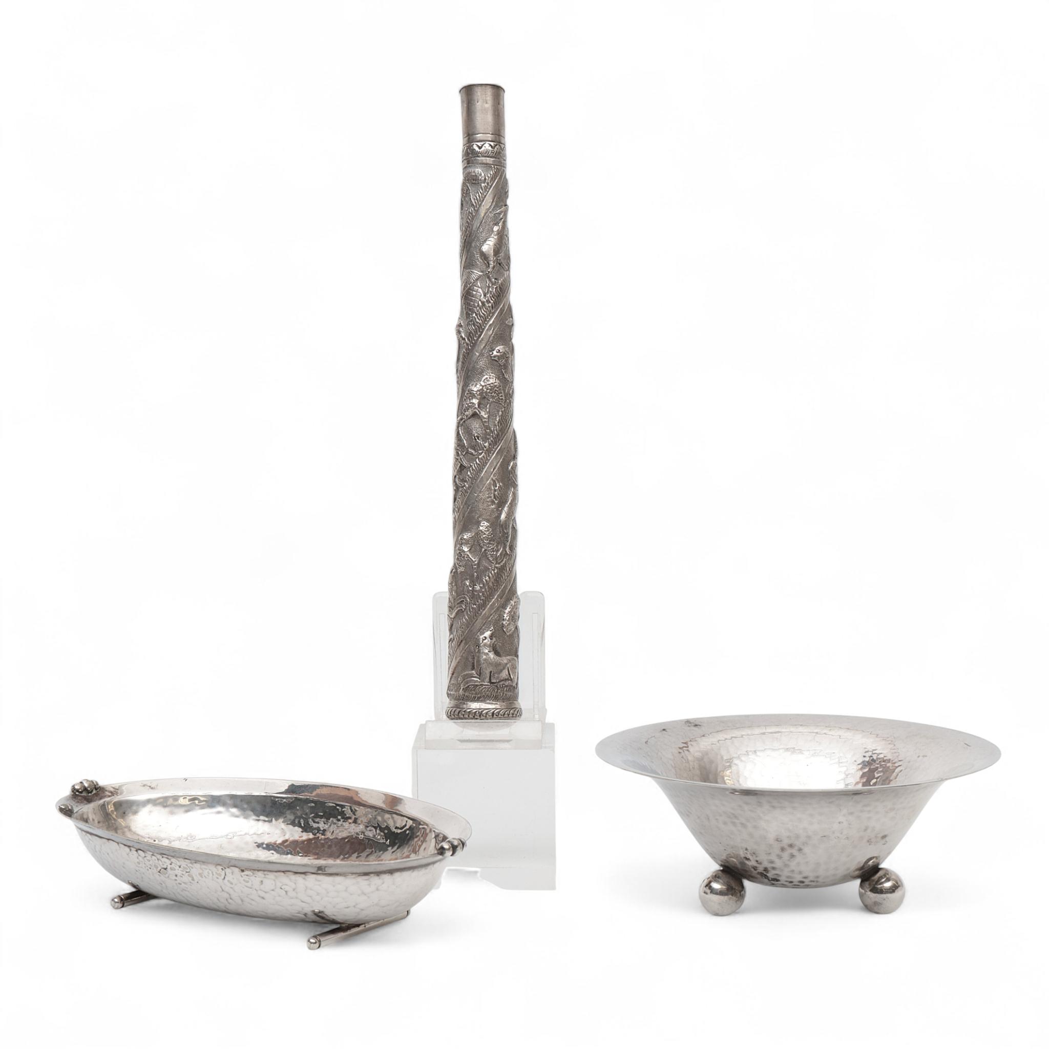 Twee diverse gehamerde schaaltjes en een bewerkte wandelstokgreep, 20e jaren,