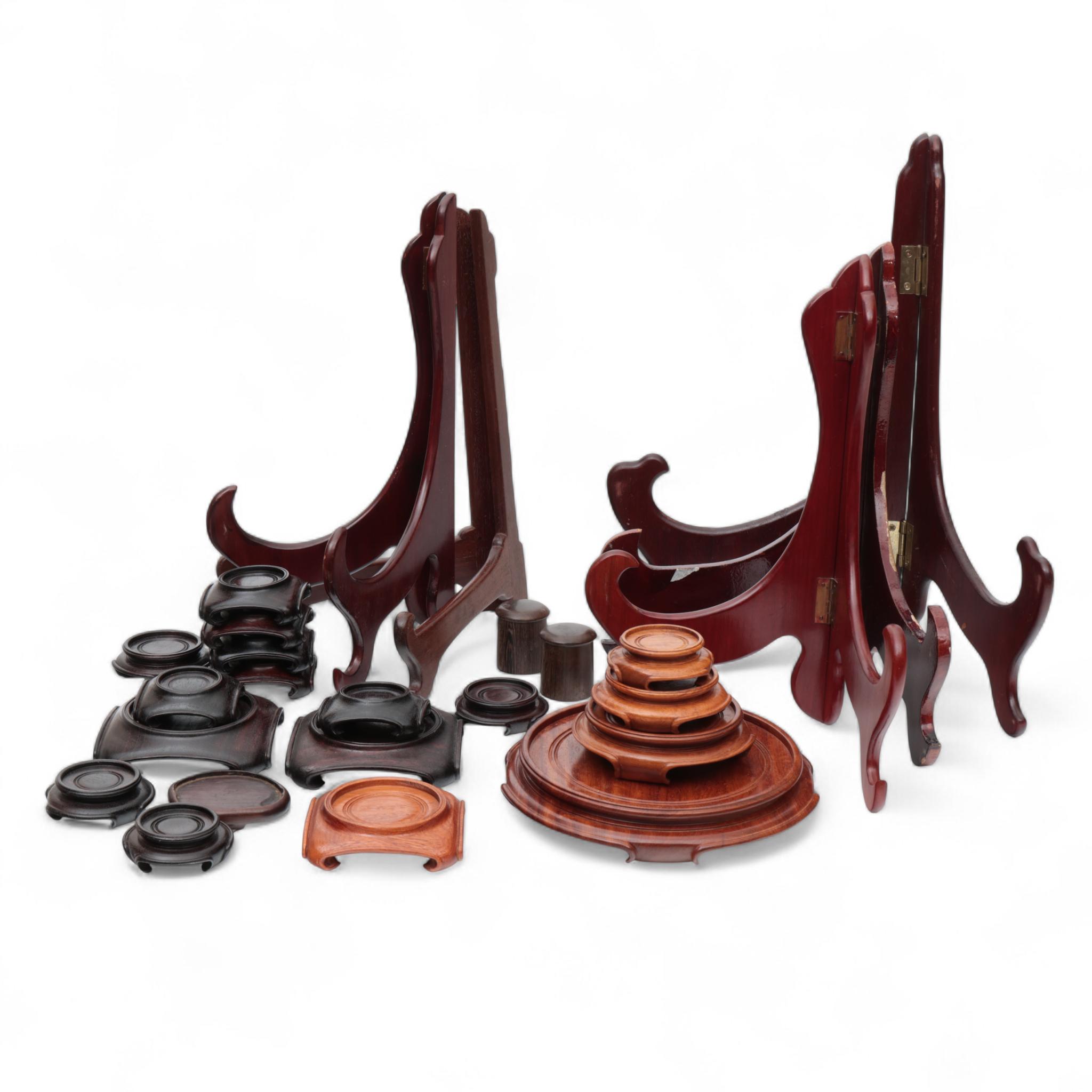 Diverse hardhouten standaards en sokkels voor Aziatisch porselein.