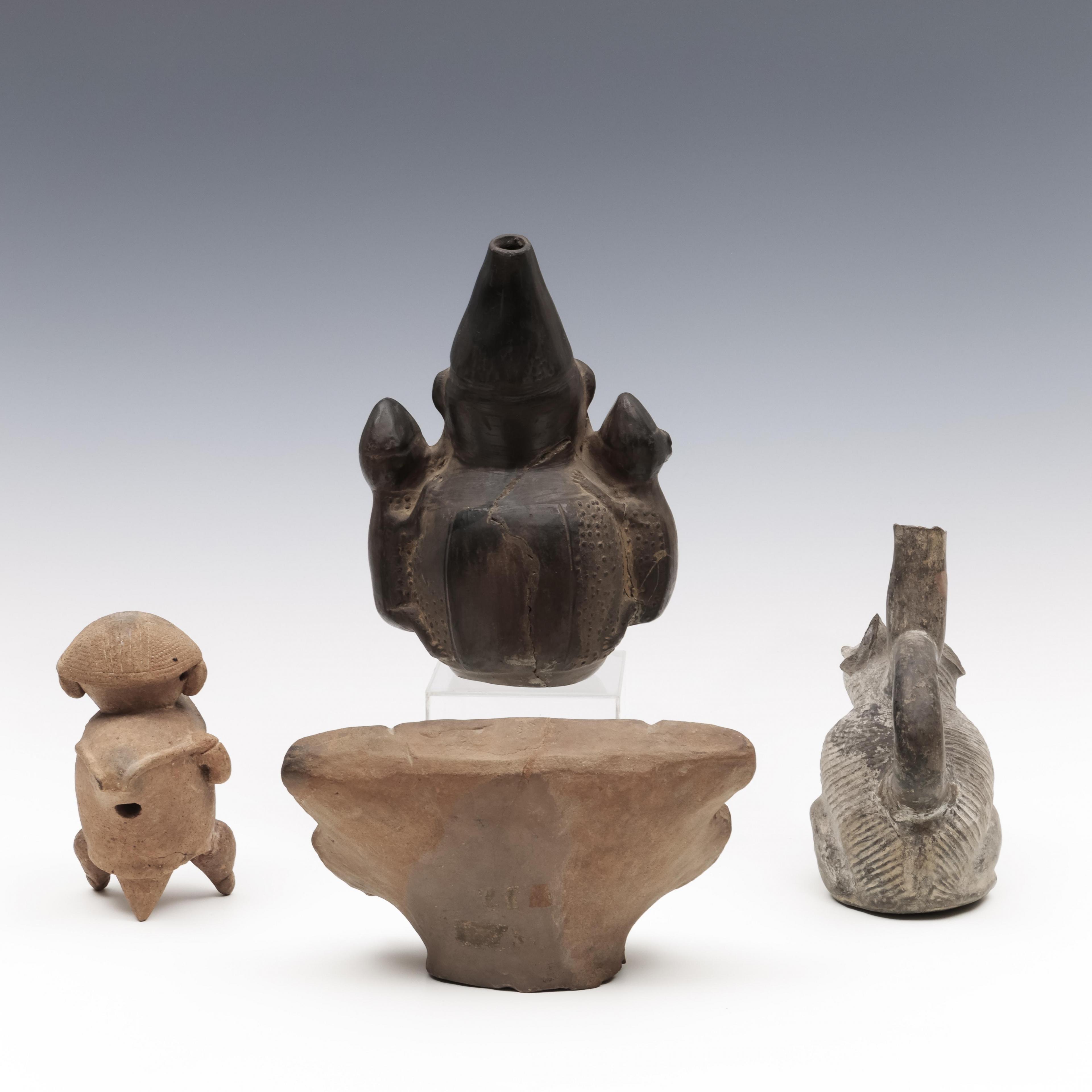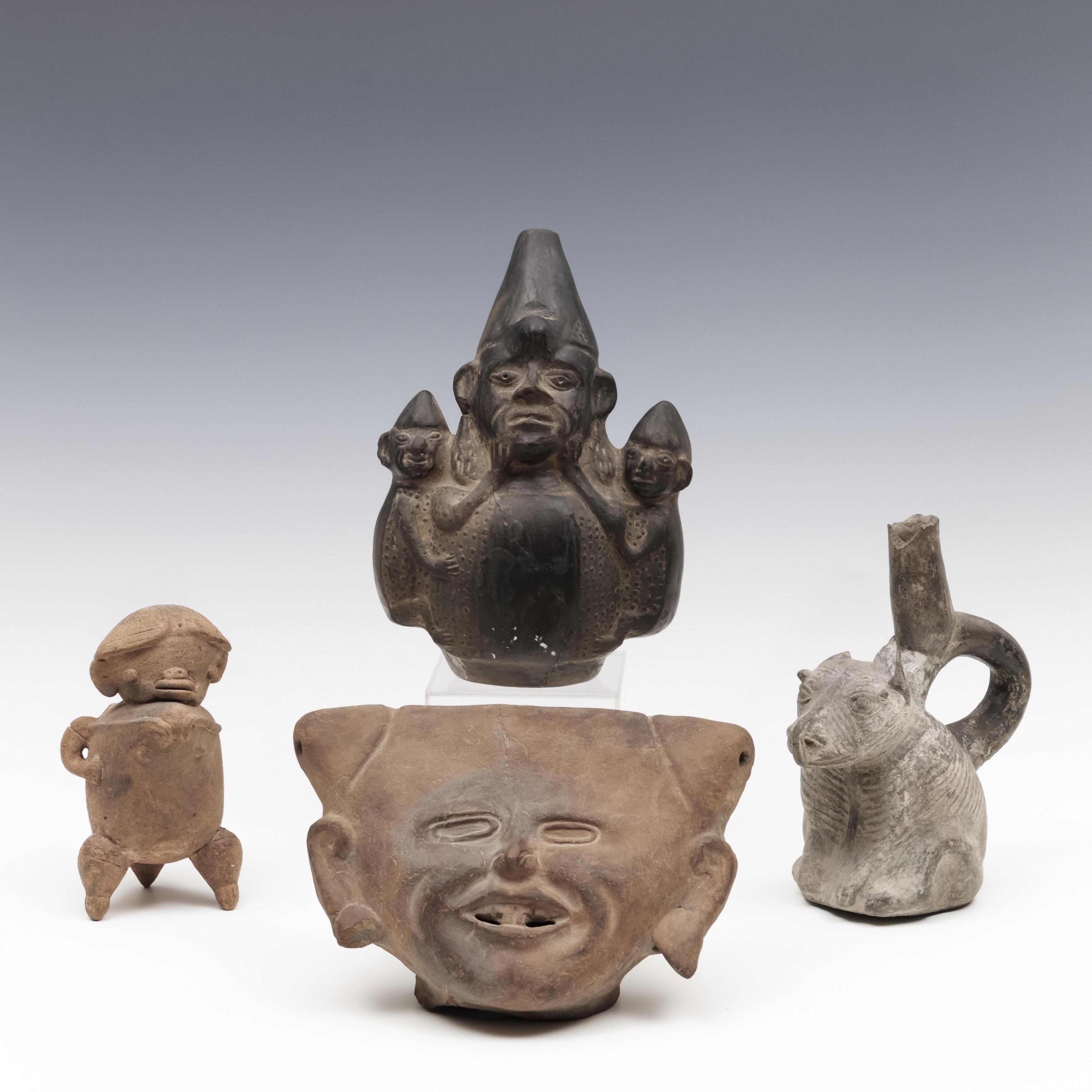 Mexico, Vera Cruz, a terracotta smiling figures heads, 600-1000 AD, Peru, two black terracotta objects and a possibly Colombian terracotta figure.
